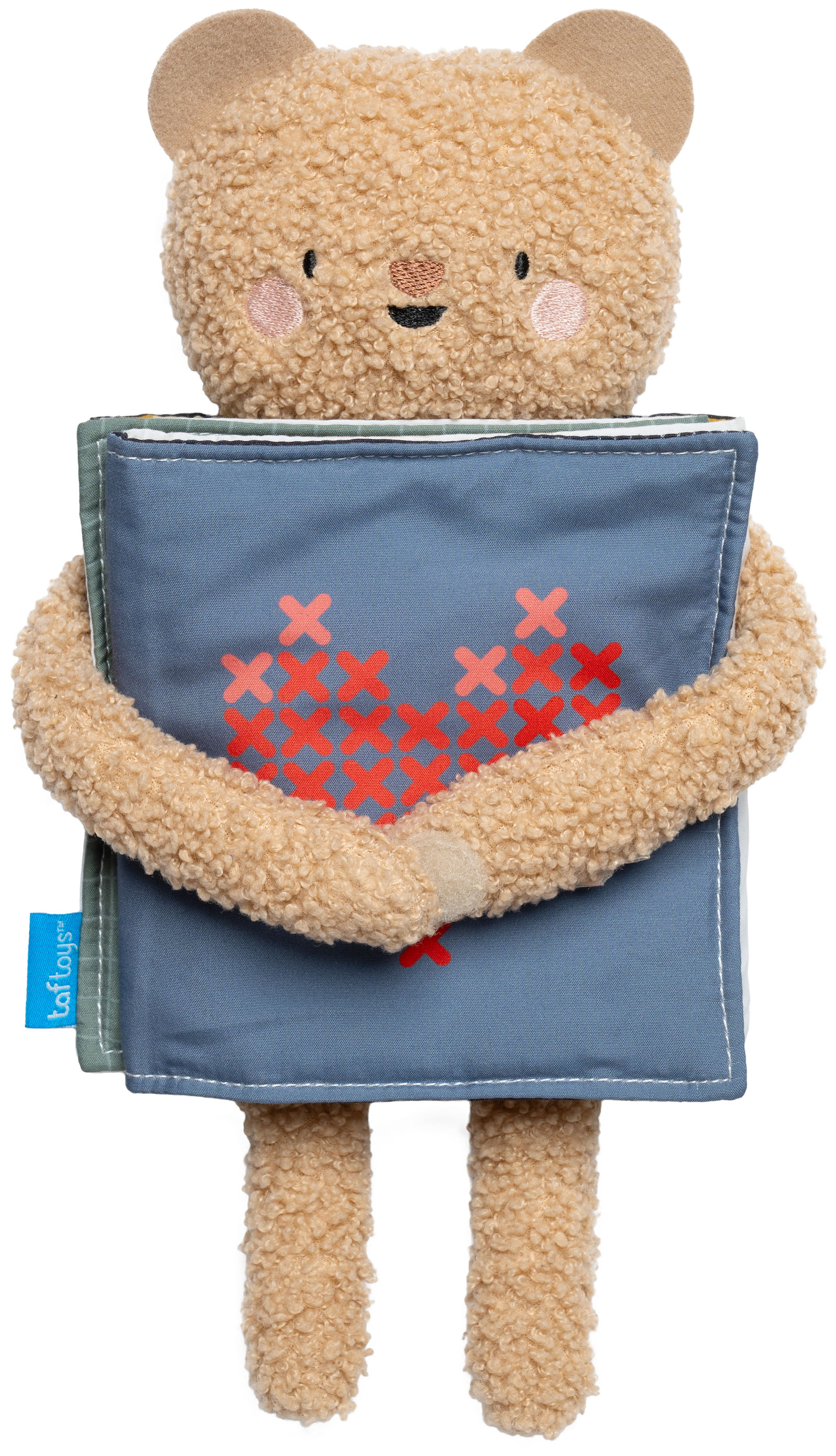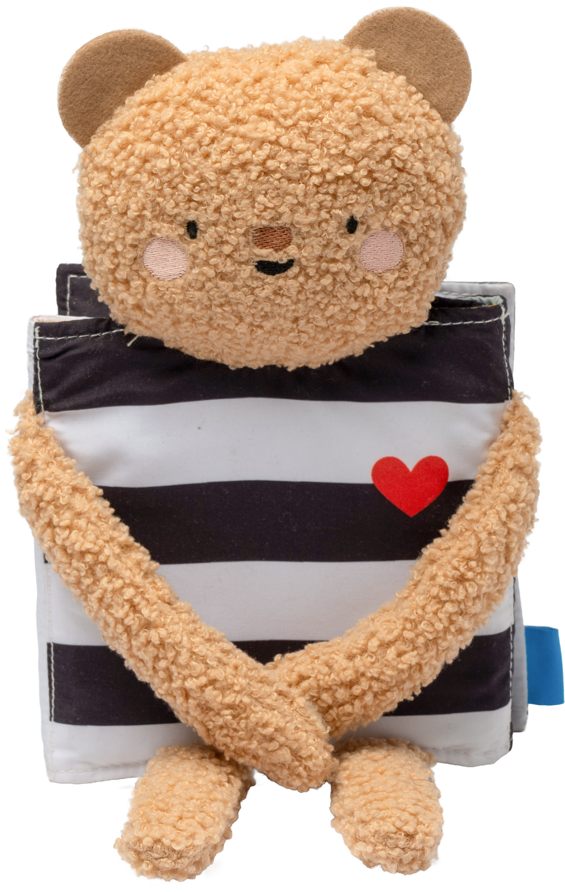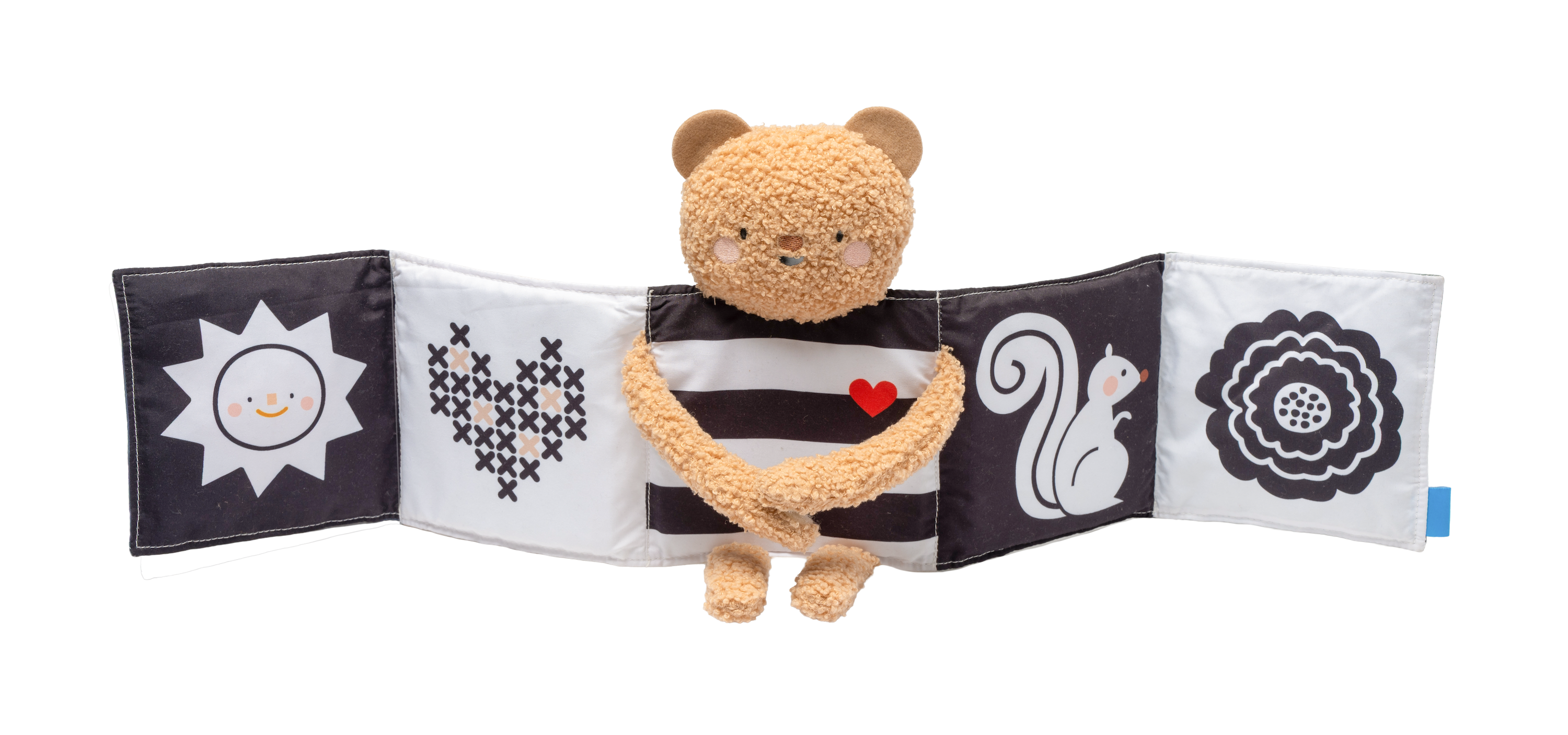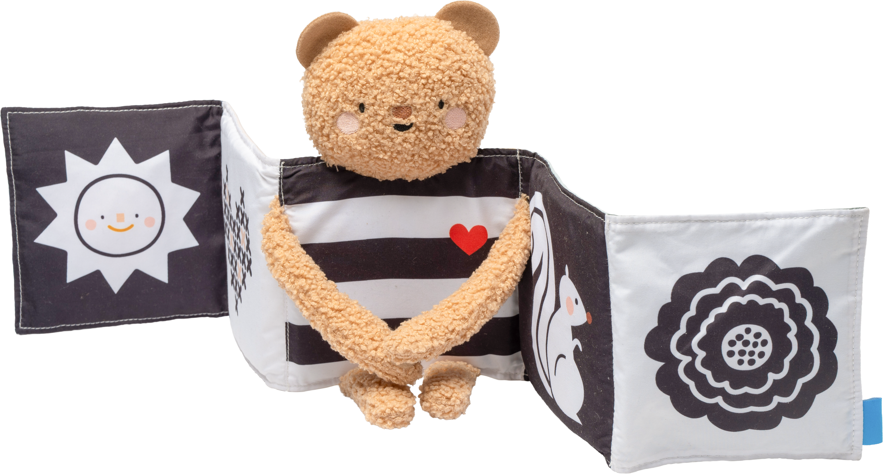 Plyšový medvídek s textilní knížkou miminko zabaví a zároveň pomáhá rozvíjet jeho jednotlivé smysly. Oboustranná knížka nabízí stranu pro novorozence s vysoce kontrastními černobílými ilustracemi a stranu s výraznými barevnými ilustracemi a aktivitami ke zkoumání pro starší miminko. Hračka podněcuje zvídavost, podporuje vývoj dítěte a zároveň nabízí příjemnou porci mazlení.