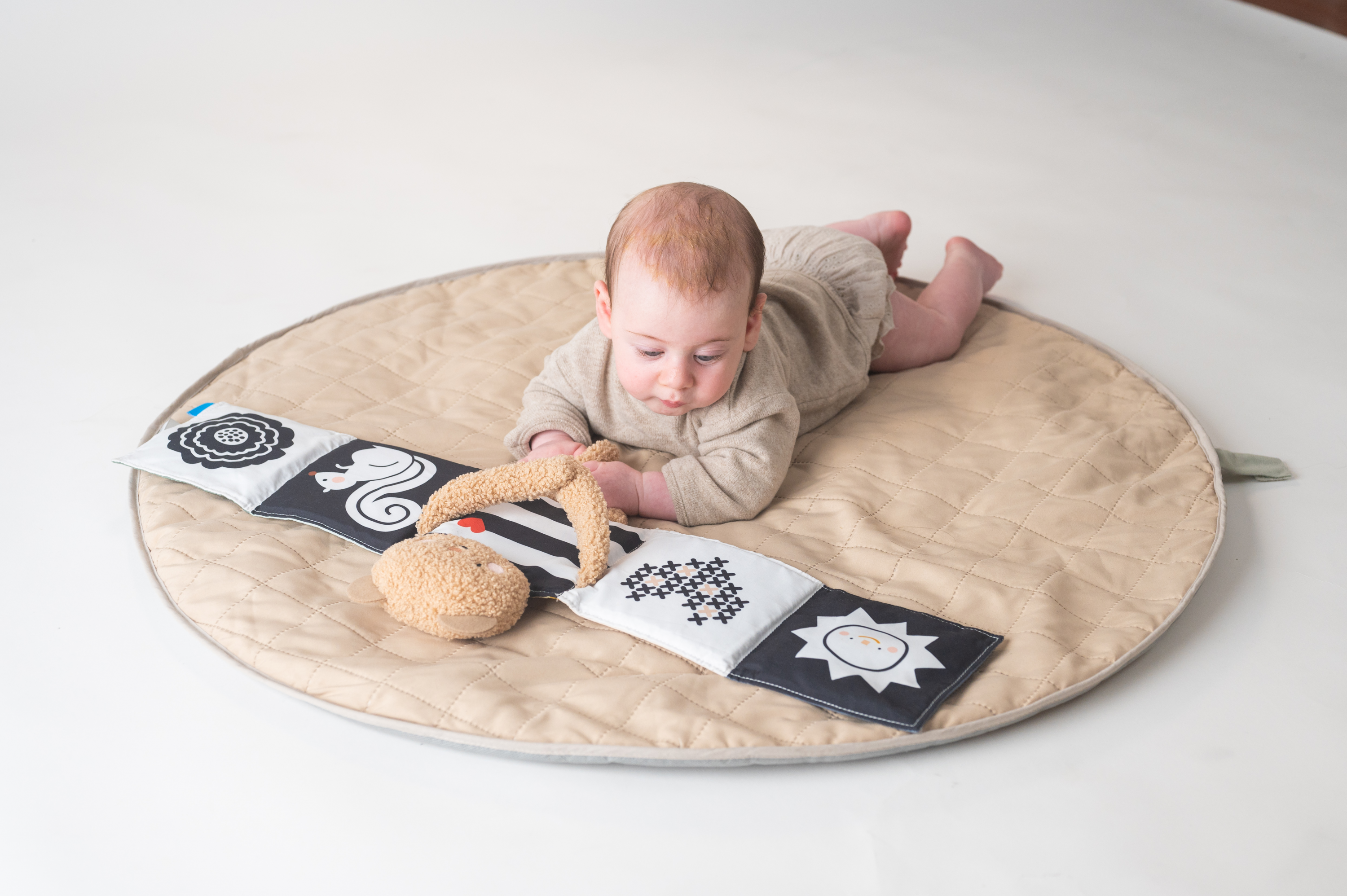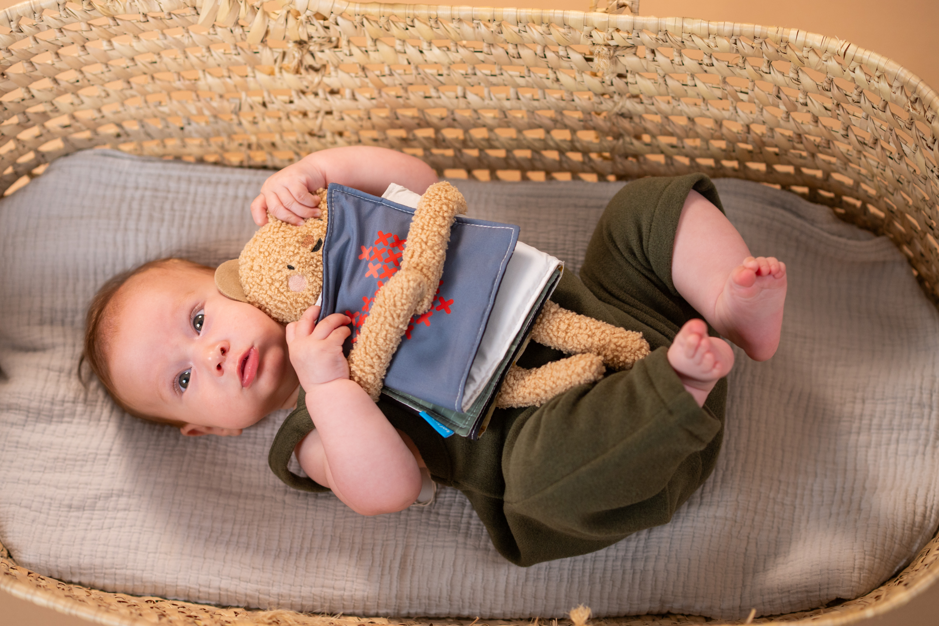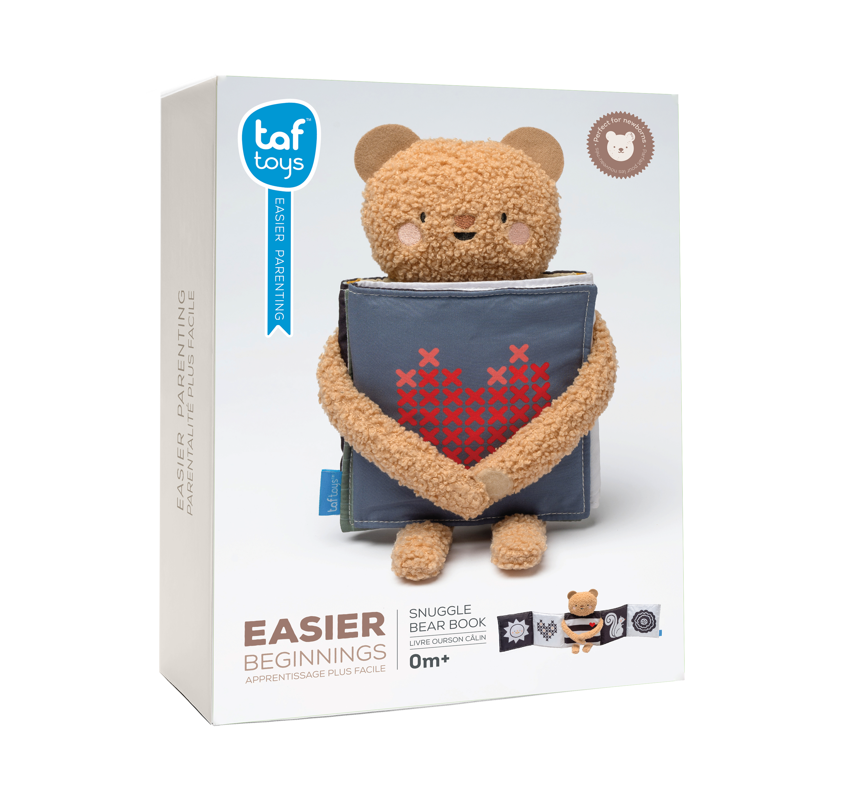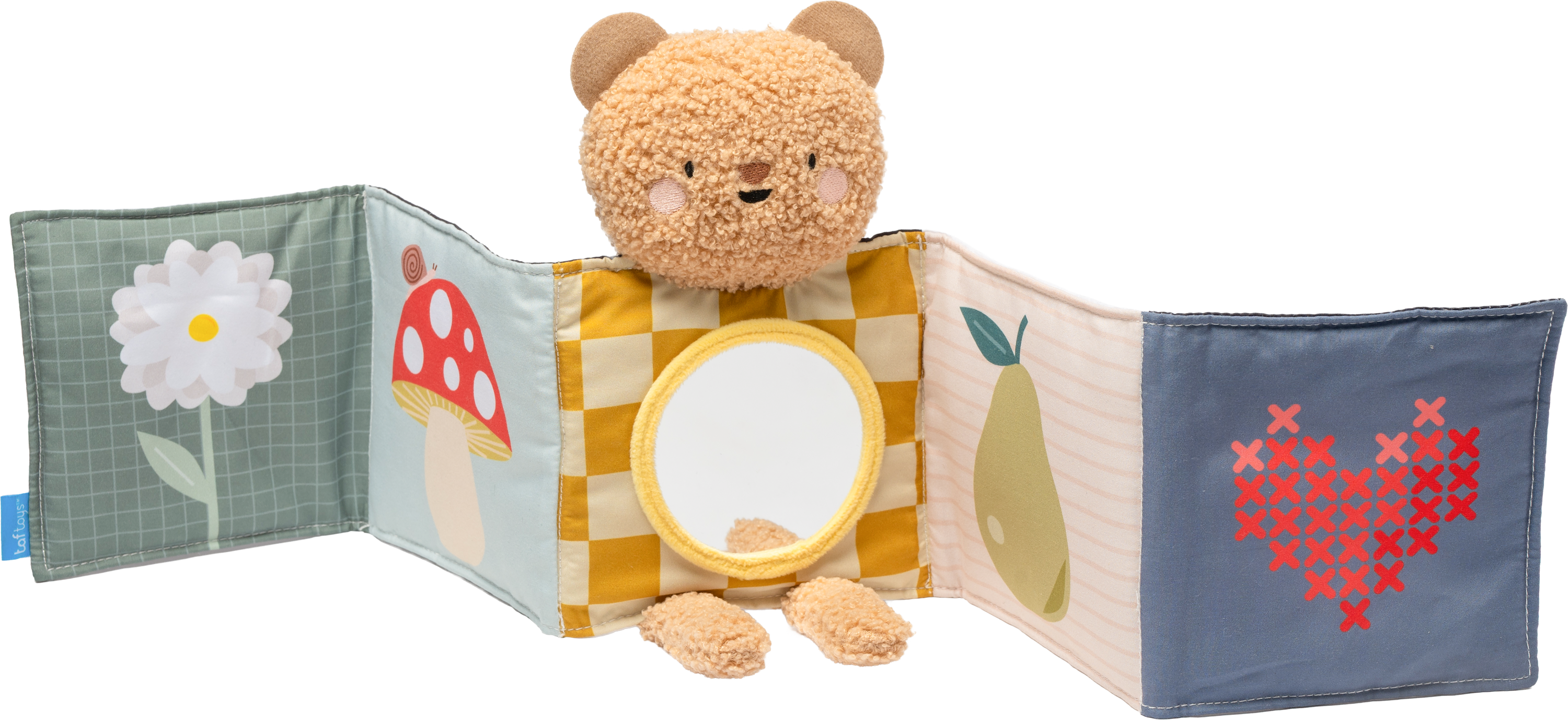 Plyšový medvídek s textilní knížkou miminko zabaví a zároveň pomáhá rozvíjet jeho jednotlivé smysly. Oboustranná knížka nabízí stranu pro novorozence s vysoce kontrastními černobílými ilustracemi a stranu s výraznými barevnými ilustracemi a aktivitami ke zkoumání pro starší miminko. Hračka podněcuje zvídavost, podporuje vývoj dítěte a zároveň nabízí příjemnou porci mazlení.