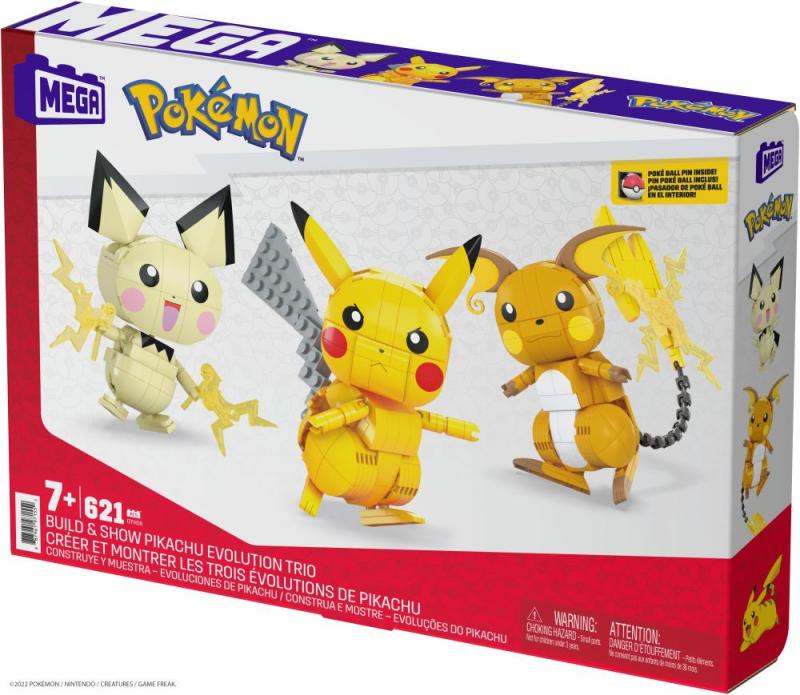 Priprav sa na bitku so stavebnicou MEGA™ Construx Postav a vystav si Pikachu a jeho vývojové trio. Táto stavebnica obsahuje kompletnú evolúciu Pichu, vrátane Pikachu a Raichu, z ktorých každý má kĺbové končatiny a je vybavený vlastnou špeciálnou silou. Špeciálne dieliky, ktoré zapadajú do Pichuových rúk, predstavujú elektrickú silu, zatiaľ čo Pikachu a Raichu sú vybavení vlastnými mocnými pohybmi. To všetko dohromady vytvára neuveriteľne vierohodné stavebné zážitky. Ideálne pre staviteľov od 6 rokov.
