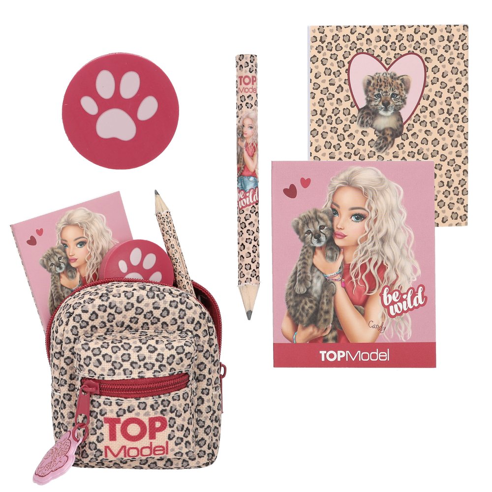 Minibatoh TOPModel s najzákladnejšími potrebami: zápisníčkom, ceruzkou a gumou v štýlových designoch s karabínkou na zavesenie. Rozmery: 10x8x6 cm