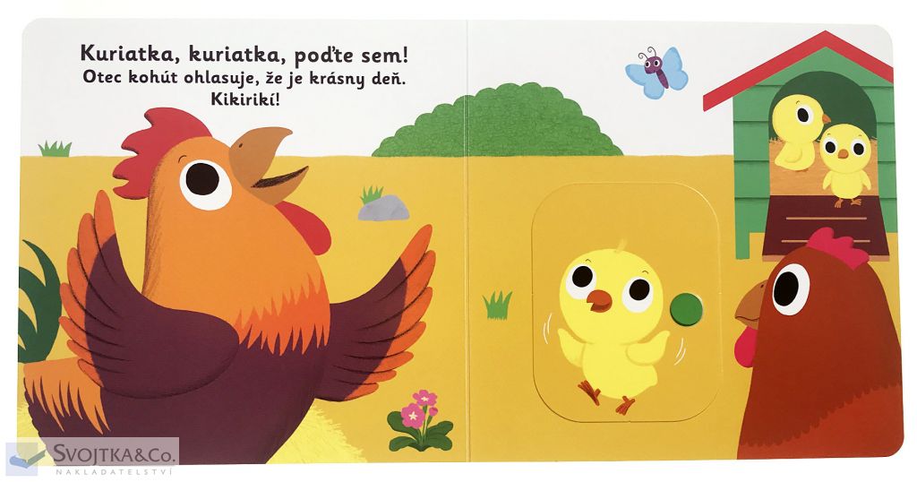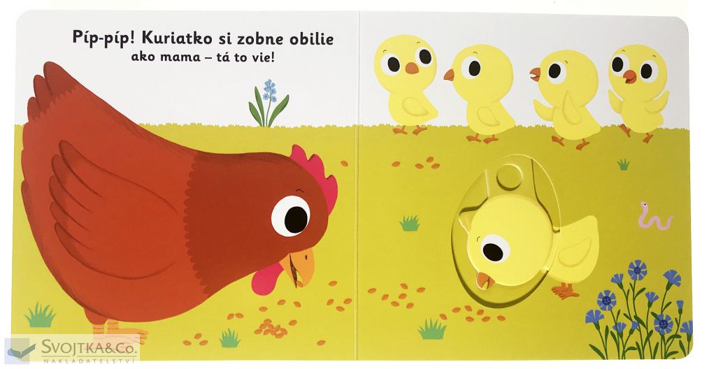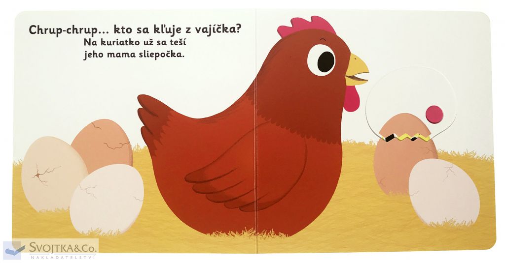 Kto sa to kľuje z vajíčka? Mamička sliepočka  to dobre vie – sú to jej malé kuriatka! Objavovať svet s týmto leporelom pre najmenšie deti od jedného roka je také zábavné! Pevné stránky s pohyblivými prvkami precvičia aj jemnú motoriku. Stačí len vložiť prštek do správneho otvoru, zľahka vysunúť, zatiahnuť alebo otočiť, a hneď budú vaši malí objavitelia poznať odpovede.