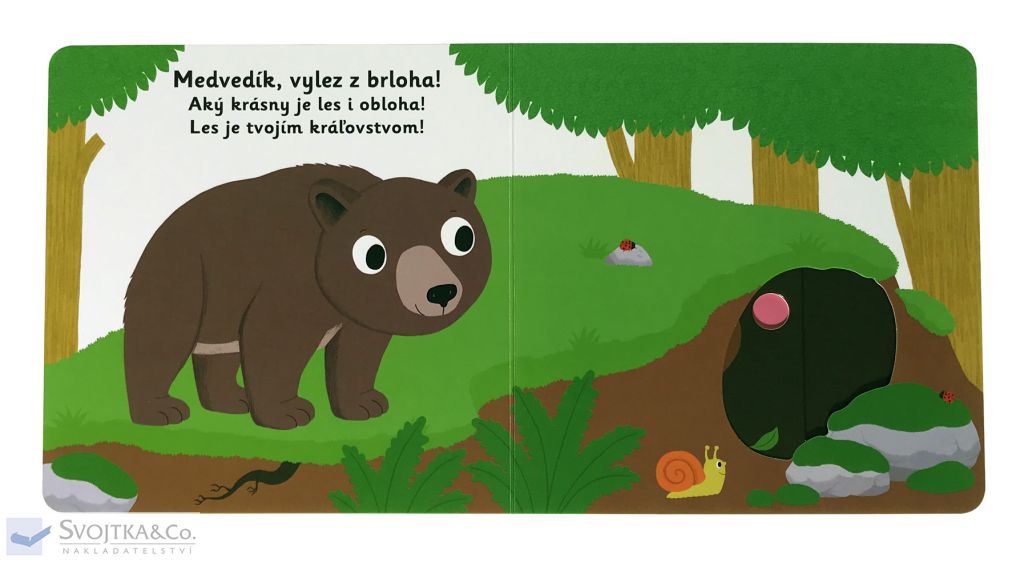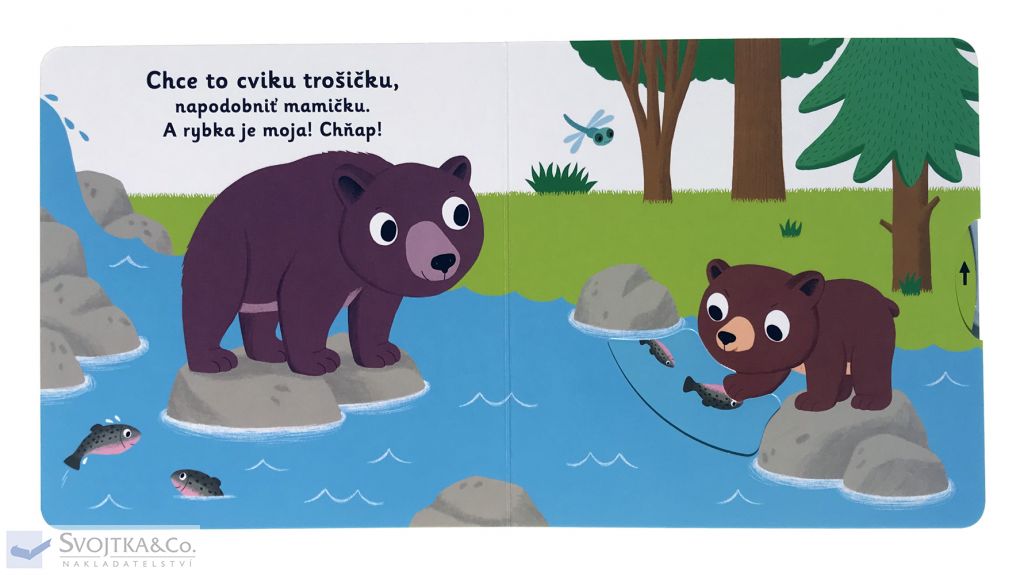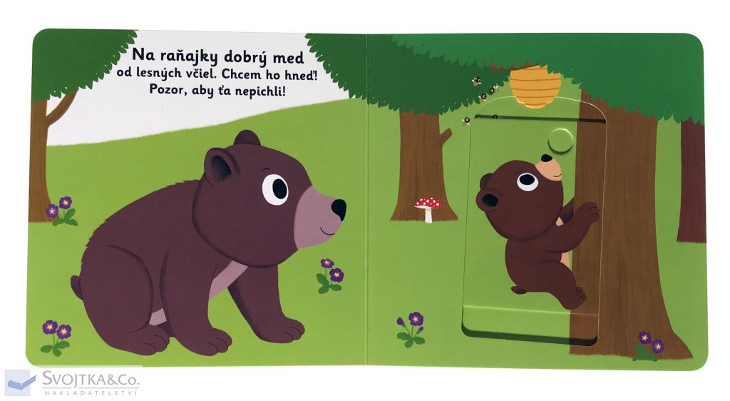 Ráno vyliezť z brlôžka, zalepiť si ústa medom a chytiť chutnú rybu. Taký je medvedíkov deň. Objavovať svet s týmto leporelom pre najmenšie deti od jedného roka je také zábavné! Pevné stránky s pohyblivými prvkami precvičia aj jemnú motoriku. Stačí len vložiť prštek do správneho otvoru, zľahka vysunúť, zatiahnuť alebo otočiť, a hneď bude váš malý objaviteľ poznať odpovede.