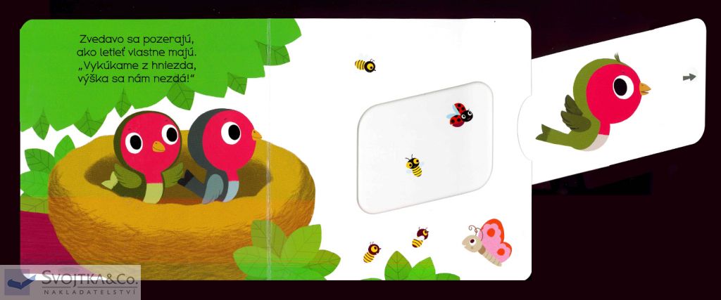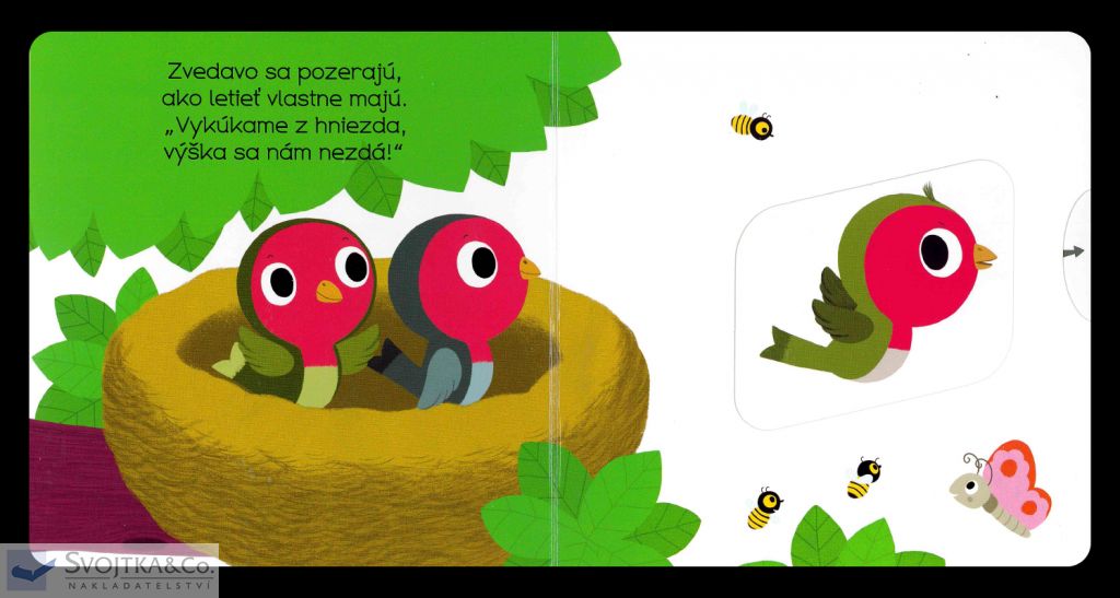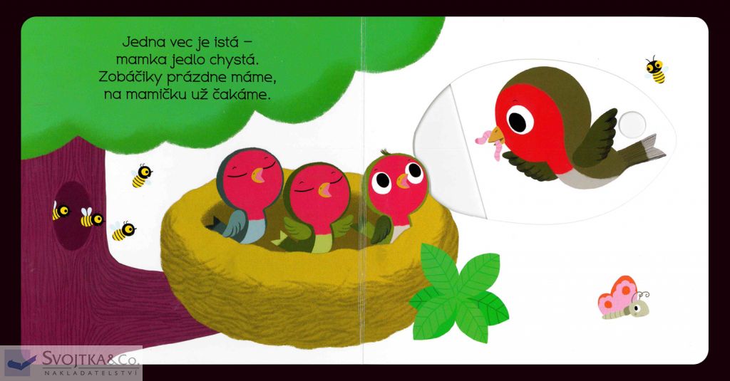 V hniezde sa ukrývajú malé vtáčatká. Ale kdeže majú mamičku? Už letí a nesie niečo na jedenie. Vtáčatká sa musia naučiť lietať. Pomôžeš im? Objavovať svet s týmto leporelom pre najmenšie deti od jedného roka je také zábavné! Pevné stránky s pohyblivými prvkami precvičia aj jemnú motoriku. Stačí len vložiť prštek do správneho otvoru, zľahka vysunúť, zatiahnuť alebo otočiť a hneď bude váš malý objaviteľ poznať odpovede.