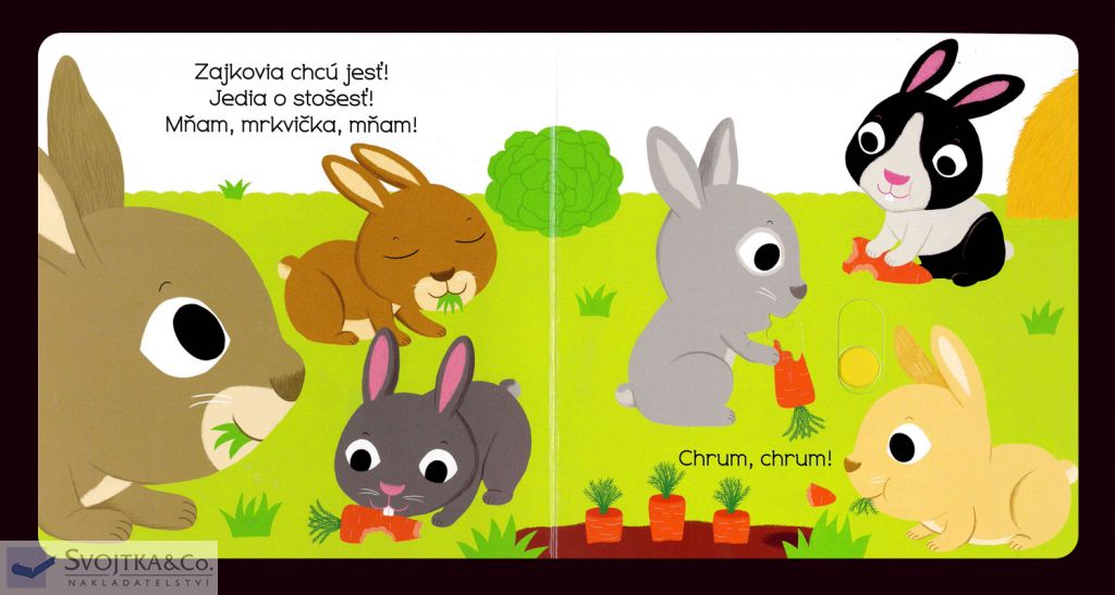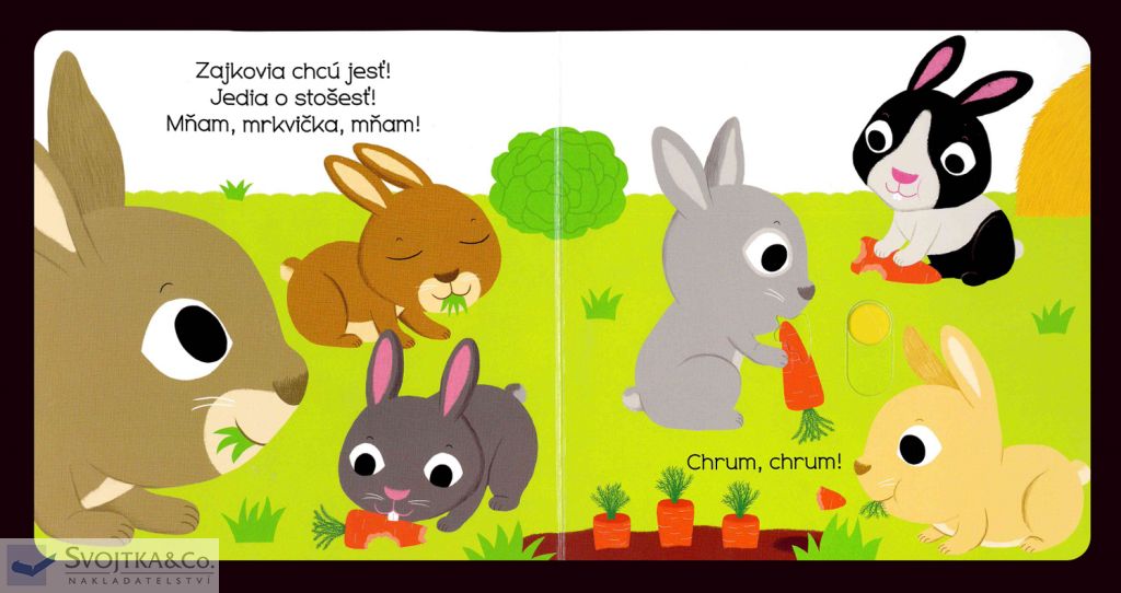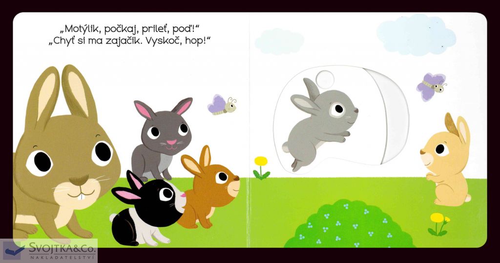 Malý zajačik sa s bračekmi vybral von. Dajú si mrkvičku, budú sa naháňať po lúke a skúsia chytiť motýlika. Budú asi pekne unavení! Objavovať svet s týmto leporelom pre najmenšie deti od jedného roka je také zábavné! Pevné stránky s pohyblivými prvkami precvičia aj jemnú motoriku. Stačí len vložiť prštek do správneho otvoru, zľahka vysunúť, zatiahnuť alebo otočiť a hneď bude váš malý objaviteľ poznať odpovede.