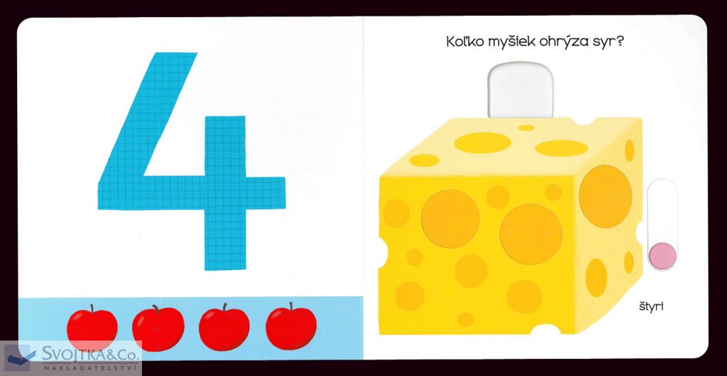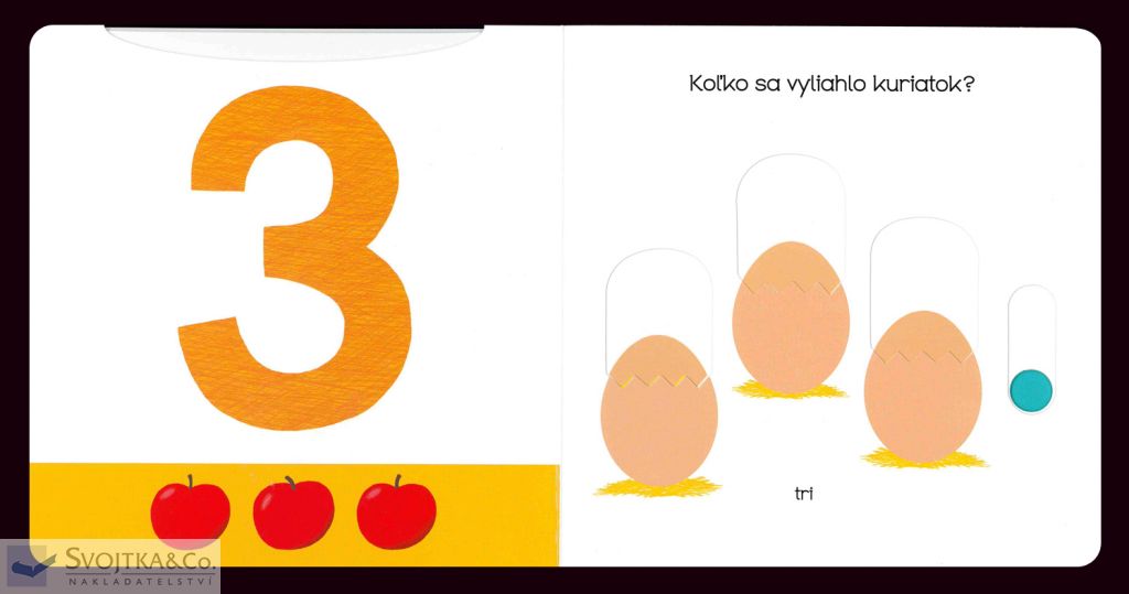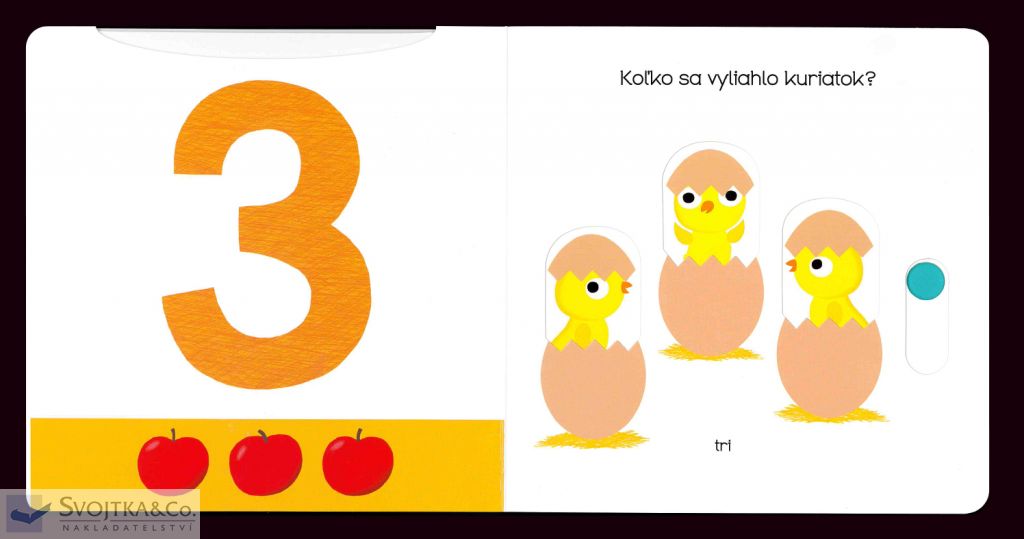Koľko sa vyliahlo kuriatok? Koľko myšiek ohrýza syr? Koľko motýlikov vyletí spoza kríka? Spočítaj všetky zvieratká a nauč sa čísla od jeden do päť! Pestrofarebné ilustrácie a posuvné prvky v tomto leporele učia deti počítať zábavnou formou. Pohyblivé elementy v tejto knihe rozvíjajú jemnú motoriku dieťaťa a prispievajú k živosti ilustrácií.