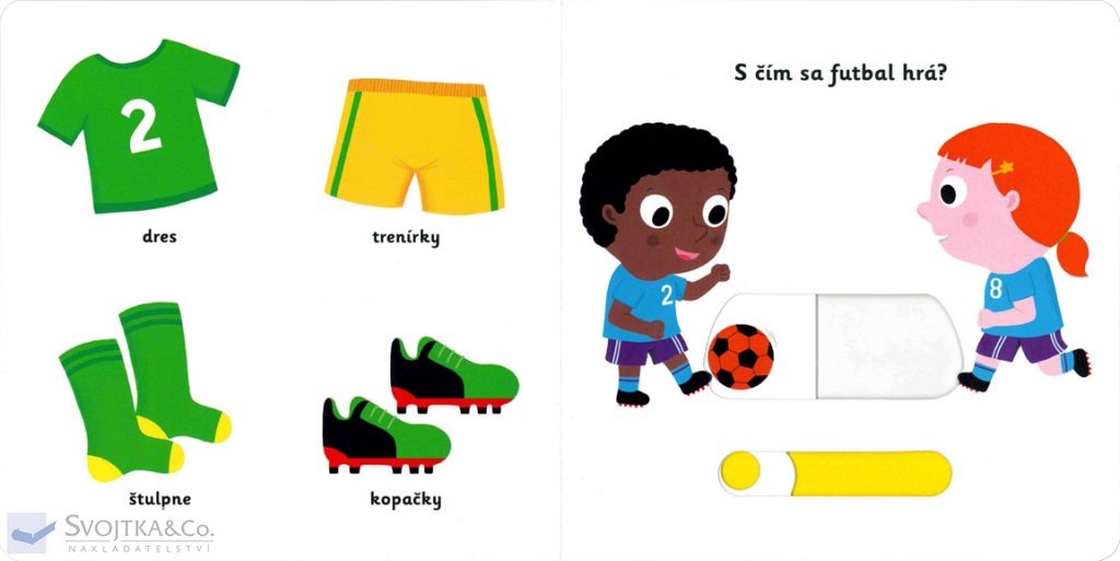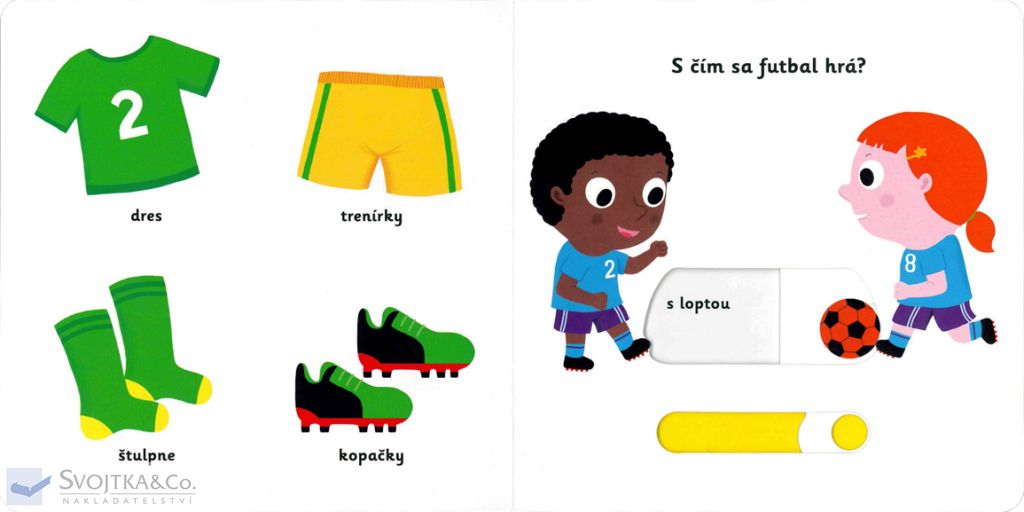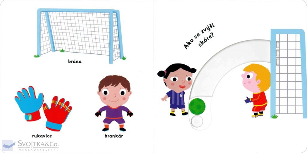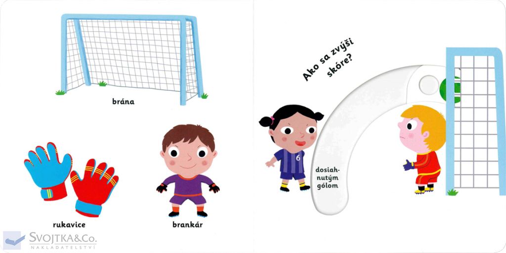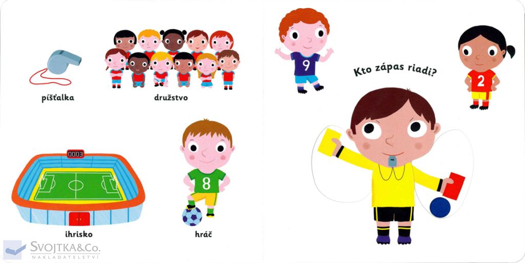 S čím sa hrá futbal? Čo má počas zápasu na starosť rozhodca? Čo to znamená, keď futbalista robí "hlavičku"? A ako sa nakoniec rozhodne o víťazovi? Pomenuj všetko, čo môžeš vidieť na futbalovom zápase, a objavuj svet okolo seba. Knižka pre tých najmenších futbalových fanúšikov! Pestrofarebné ilustrácie a posuvné prvky v tomto leporele rozširujú detskú slovnú zásobu zábavnou formou. Pohyblivé elementy rozvíjajú jemnú motoriku dieťaťa a prispievajú k živosti ilustrácií.