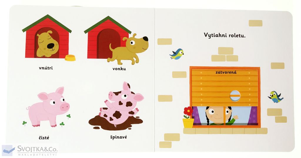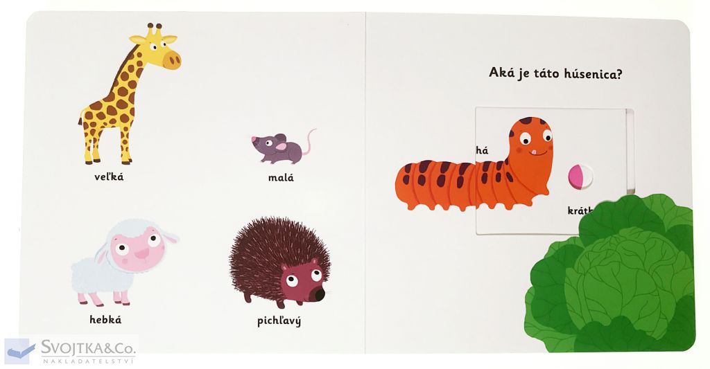 Je myška veľká a žirafa malá? Alebo je to presne naopak? Čo je hore a čo dolu? Ktorá dážďovka je dlhá? Ktorá krátka? Spí psík práve teraz vnútri búdy, alebo behá vonku? Stačí len vložiť prštek do správneho otvoru a zľahka vysunúť, zatiahnuť alebo otočiť v smere šípky a hneď bude váš malý objaviteľ poznať odpovede. Leporelo je určené pre najmenšie deti od jedného roka a má pevné stránky s posuvnými a otočnými prvkami, a tak si naši najmenší môžu pri prezeraní a rozoznávanie protikladov precvičiť aj jemnú motoriku.