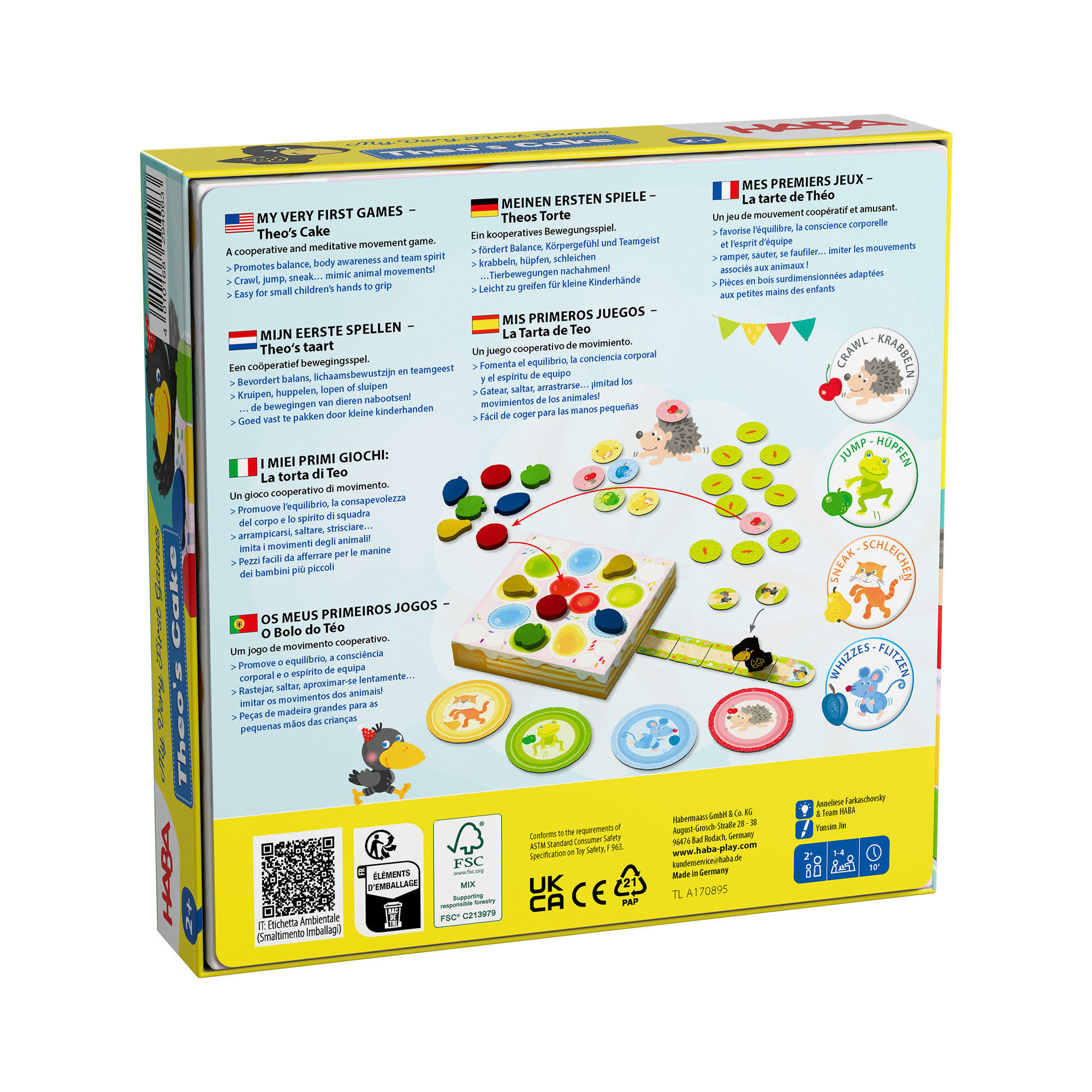 Theova narodeninová torta je roztomilá kooperatívna hra pre najmenších hráčov. Deti spoločne pomáhajú oslíkovi Theovi pripraviť jeho narodeninový koláč – zbierajú a ukladajú farebné drevené dieliky ovocia na tortu podľa pokynov kocky. Cieľom je dokončiť tortu skôr, než oslík všetko ochutná. Hra rozvíja jemnú motoriku, rozpoznávanie farieb a tvarov a učí deti prvým herným pravidlám. Vďaka kooperatívnemu charakteru podporuje aj spoluprácu a hranie v kolektíve. Počet hráčov: 1–4 Obsah balenia: herný plán (torta), drevené farebné dieliky, figúrka oslíka Thea, kocka, pravidlá Vek: 2+