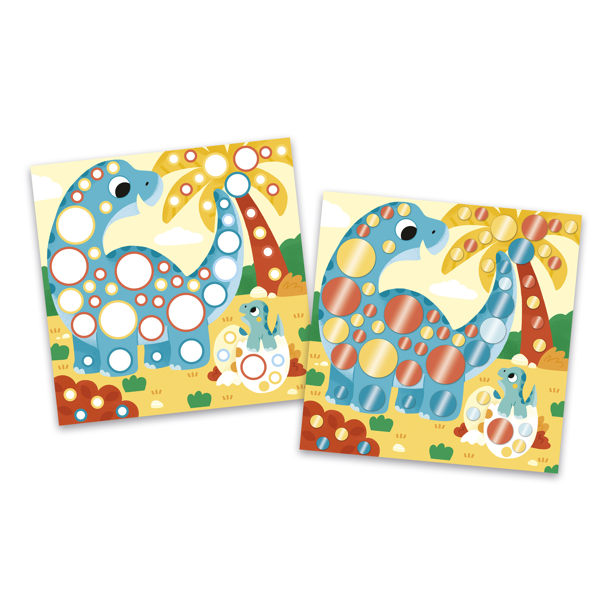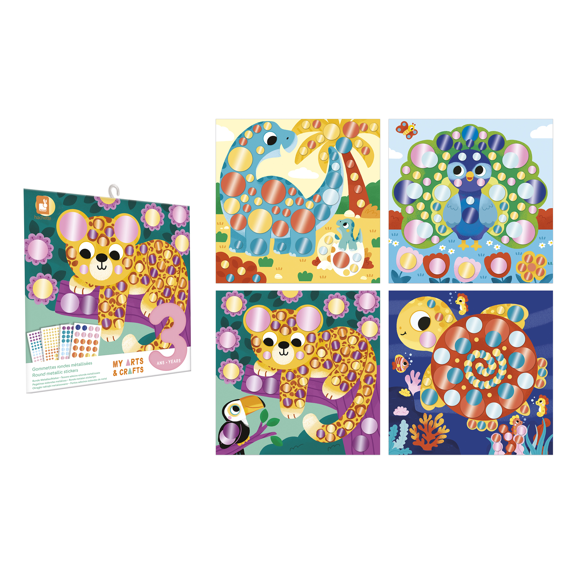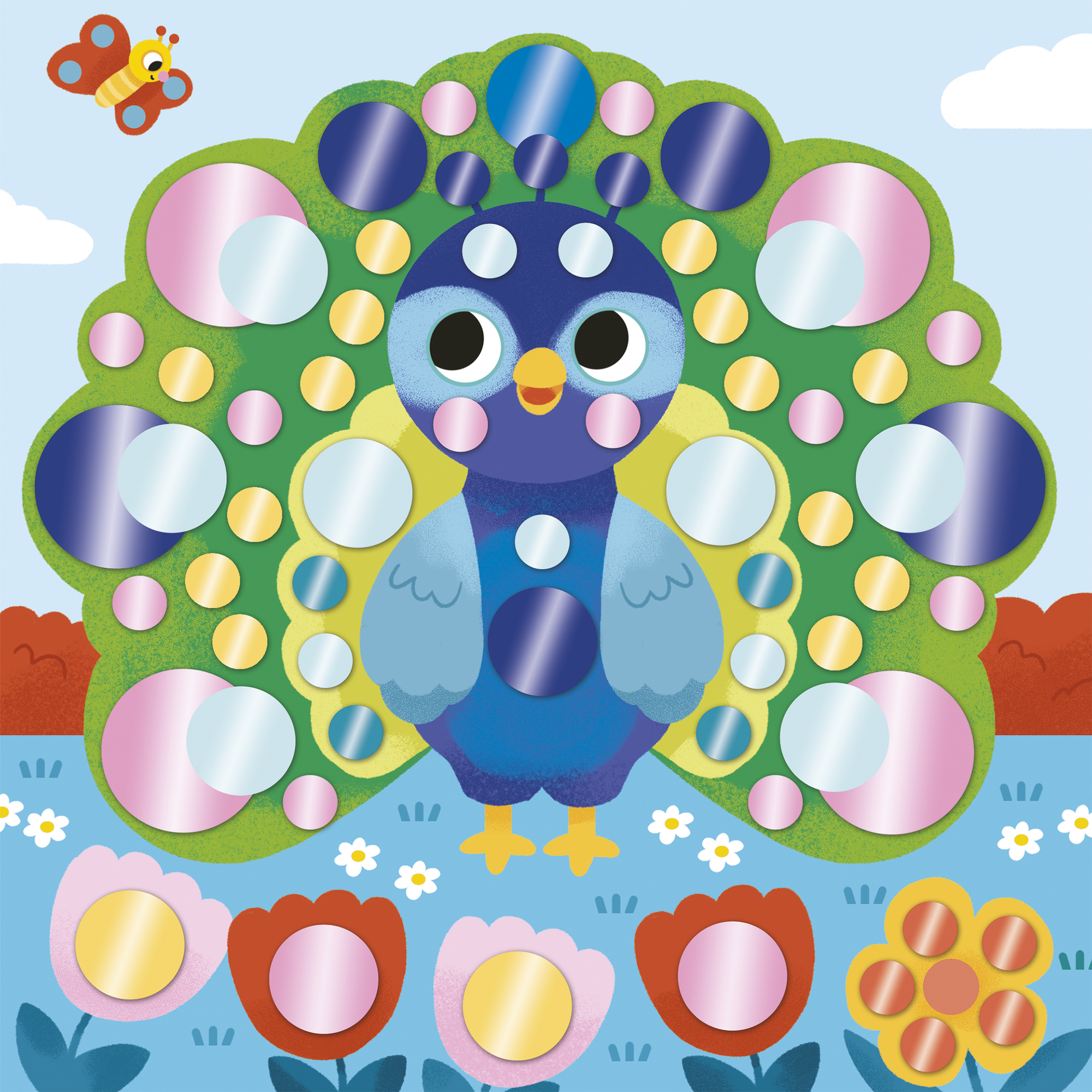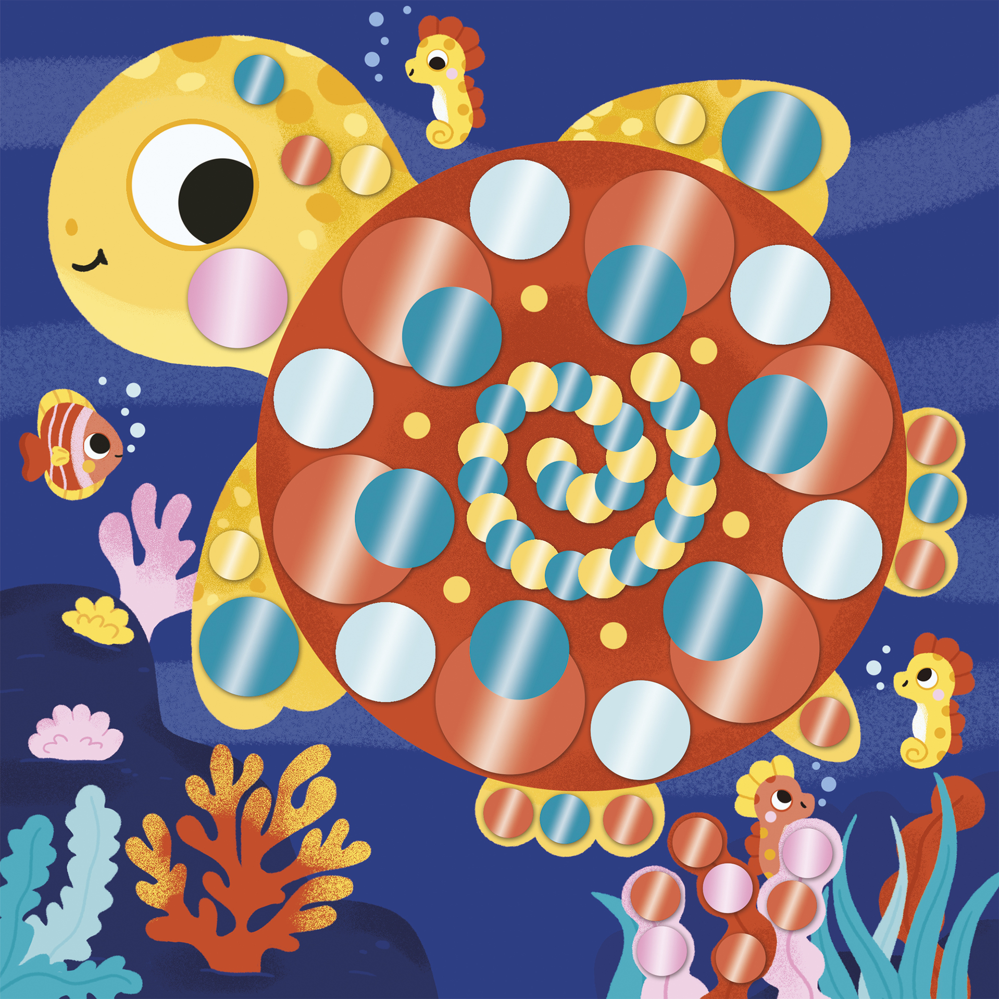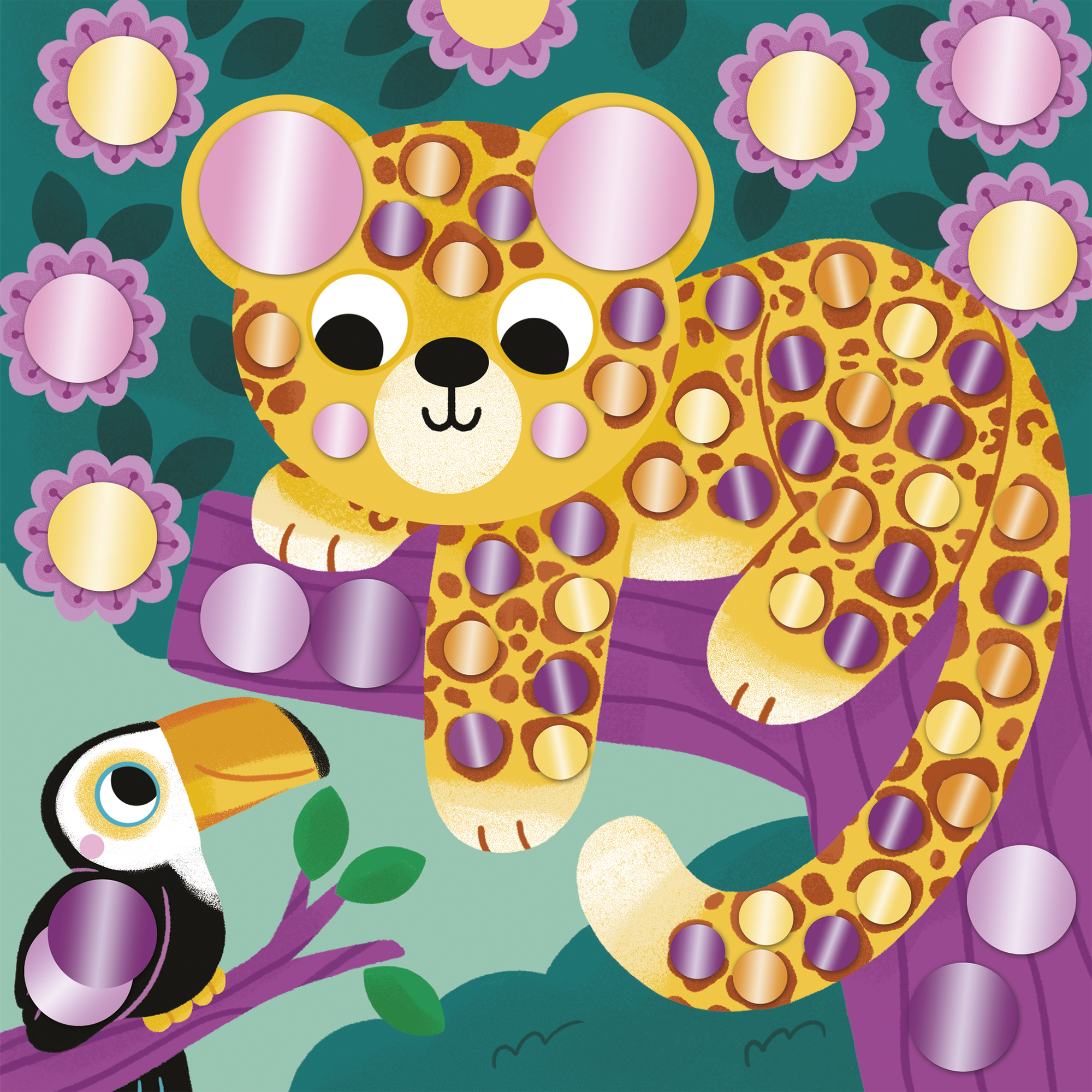 Táto sada na tvorenie zahŕňa zdobenie obrázkov zvierat kovovými nálepkami v tvare bodky. Obsahuje 4 podložky s rozmermi 20 x 20 cm (páv, dinosaurus, leopard a morská korytnačka), 4 listy kovových nálepiek v tvare bodky v 3 rôznych veľkostiach (30, 20 a 10 mm) a leták s návodom a vzormi. Táto aktivita pomáha rozvíjať jemnú motoriku a trpezlivosť. Trvá približne 40 minút a je ideálna pre deti od 3 rokov.