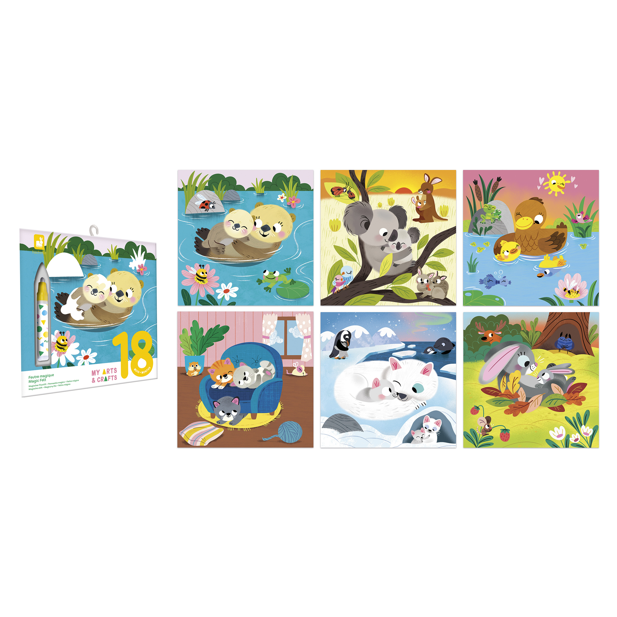 Táto sada na tvorenie zahŕňa vyfarbovanie obrázkov s tematikou túlenia zvieratiek vodným perom. Obsahuje 3 obojstranné podložky, napr. 6 scén, ako aj vodné pero a leták s pokynmi a vzormi. Obrázky sú farebné s bielymi plochami. Farby sa objavia vo vode a pri schnutí blednú. Umožňuje deťom začať odznova! Táto aktivita pomáha rozvíjať jemnú motoriku a trpezlivosť. Trvá približne 20 minút (kým obrázky zaschnú a budú opäť použiteľné) a je ideálna pre deti vo veku 18 mesiacov a viac.