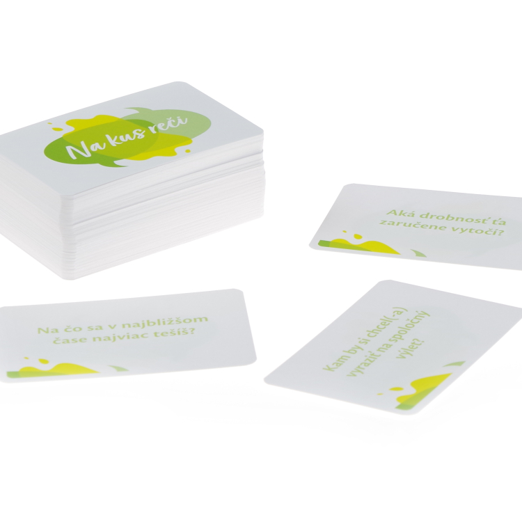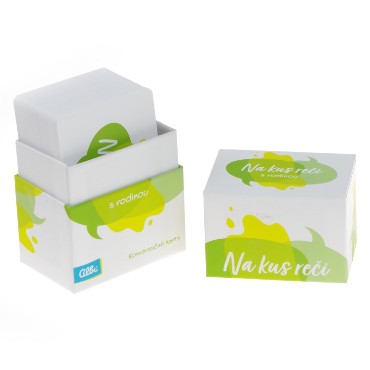 Máte pocit, že svoju rodinu poznáte ako svoje topánky? Myslíte si, že vás môžu vaši príbuzní ešte niečím prekvapiť? Karty Na kus reči vnesú novú iskru do vašich rozhovorov. Pobavte sa nad zaujímavými otázkami, užite si spoločný čas s vašimi najbližšími, poznajte sa zase o trochu viac a obohaťte tak svoje vzťahy. Hra obsahuje: 89 kariet s otázkami, 10 prázdnych kariet pre vlastné otázky, pravidlá v slovenčine