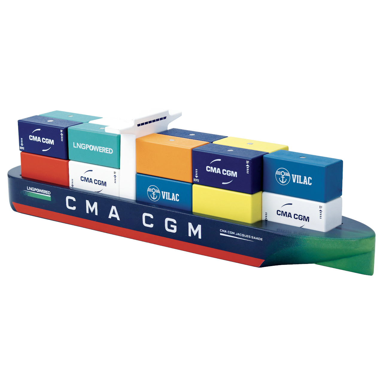 Farebná drevená nákladná loď s magnetickými kontajnermi je replikou lode Jacques Saadé, prvé lode využívajúce na pohon kvapalný zemný plyn (LNG). Hračka bola vyrobená v spolupráci s čelnou francúzskou prepravnou spoločnosťou CMA CGM. Je súčasťou Vilacity kolekcie a je so všetkými jej súčasťami plne kompatibilná, ďalšie samostatné rozšírenia prinesú variabilitu a prehĺbi zážitok z hry. Hlavné vlastnosti:loď a 18 kontajnerovmagnetické spojeniakompatibilná so všetkými súčasťami Vilac Vilacity kolekcievyrobené ekologicky, šetrne k prostrediu V2357 – Prístavný žeriav Vilacity (nie je súčasťou sady, nájdete v našej ponuke): V2358 – Nákladné auto Vilacity (nie je súčasťou sady, nájdete v našej ponuke): Príklad zostavy lodě s ďalšími súčasťami kolekcie Vilacity: