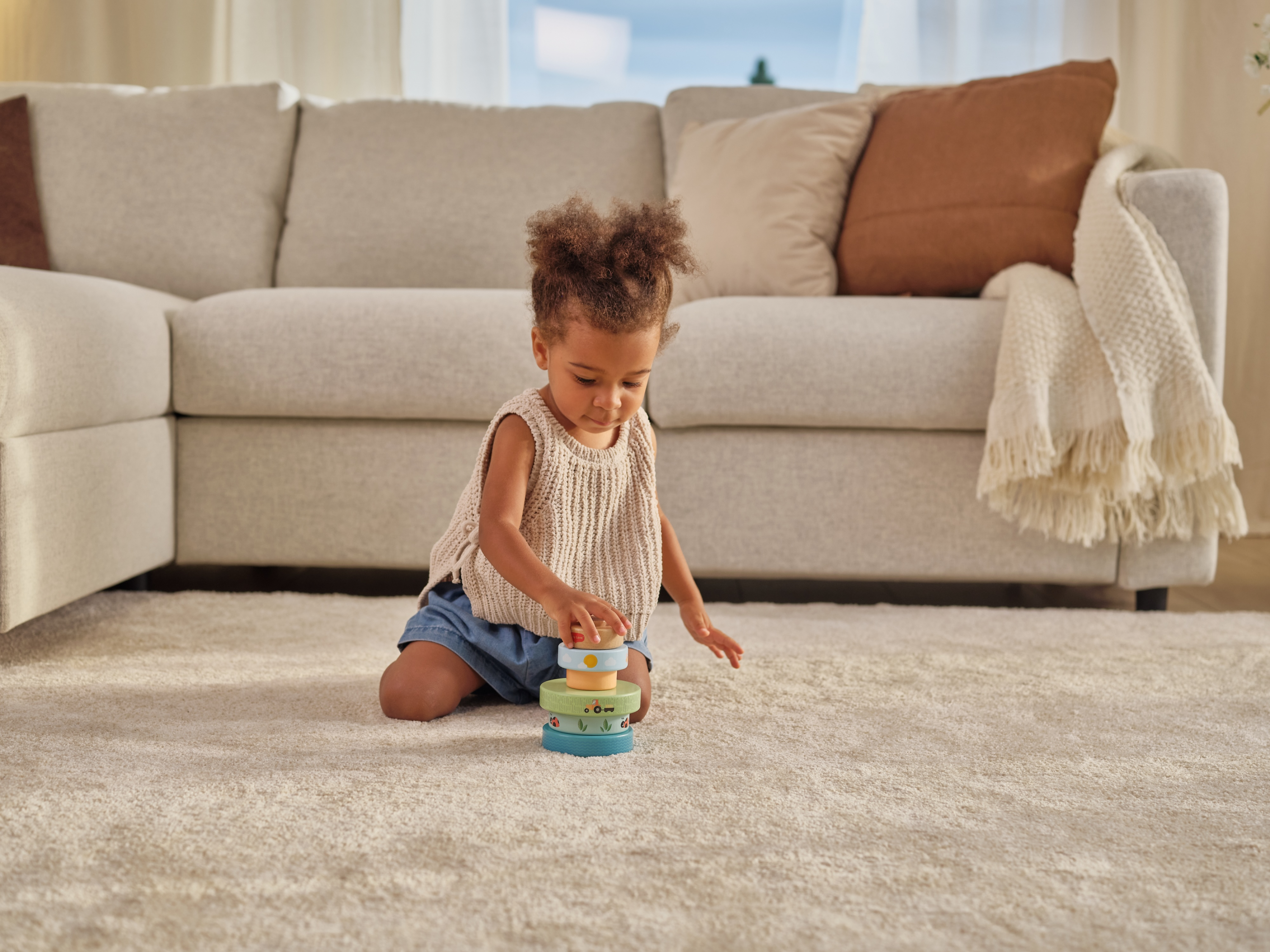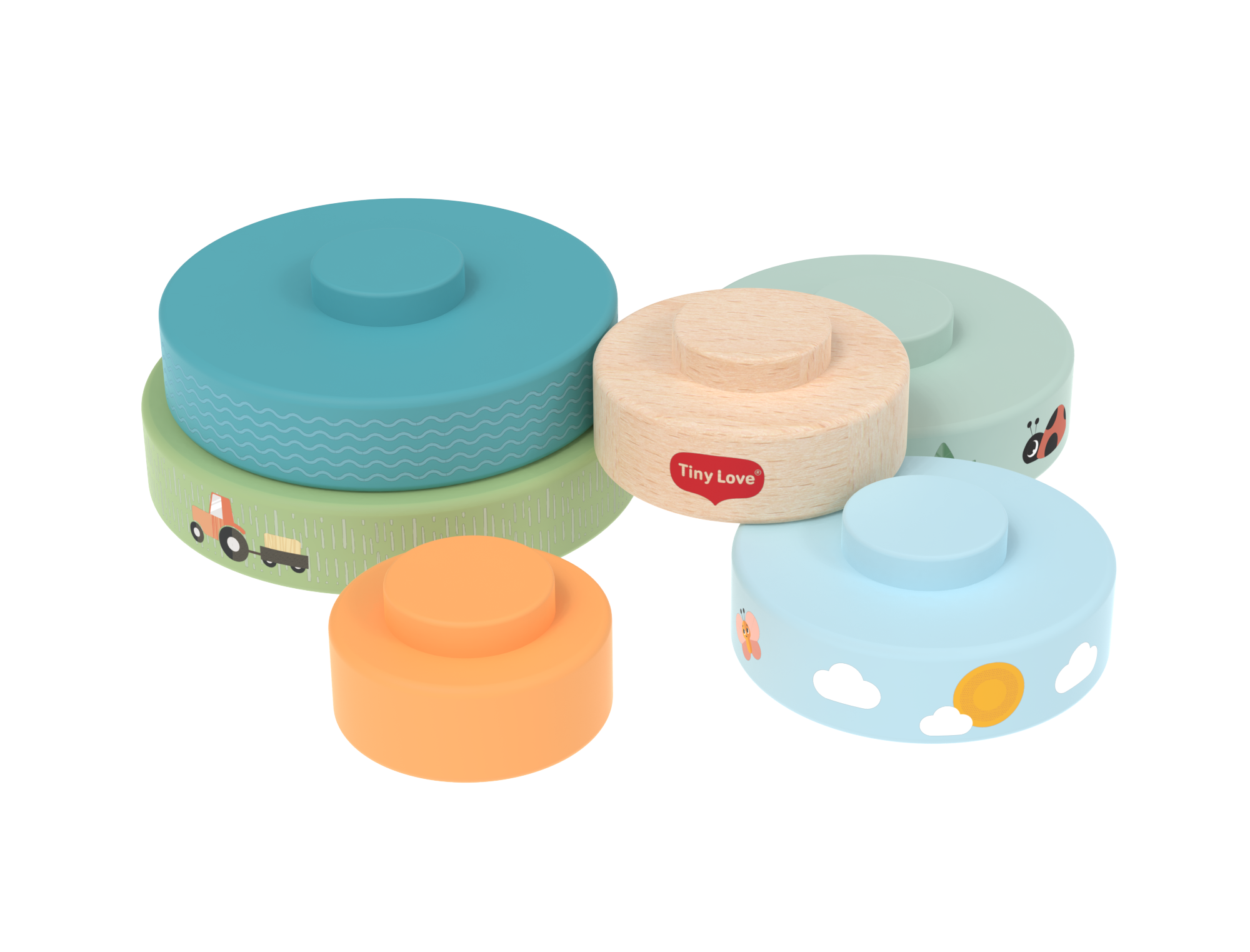 Drevené nasadzovacie krúžky Tiny Love ponúkajú rôzne možnosti hrania - deti ich môžu nasadzovať a stavať do veže, triediť podľa veľkosti, kotúľať s nimi a postupne objavovať a rozlišovať farby, veľkosti a jednoduché súvislosti. Krúžky s krásnou potlačou motívov zo života na farme sú ľahké a dobre sa držia aj malými detskými ručičkami. Hračka prirodzene rozvíja jemnú motoriku, koordináciu ruka-oko aj prvé logické myslenie.