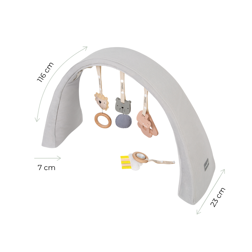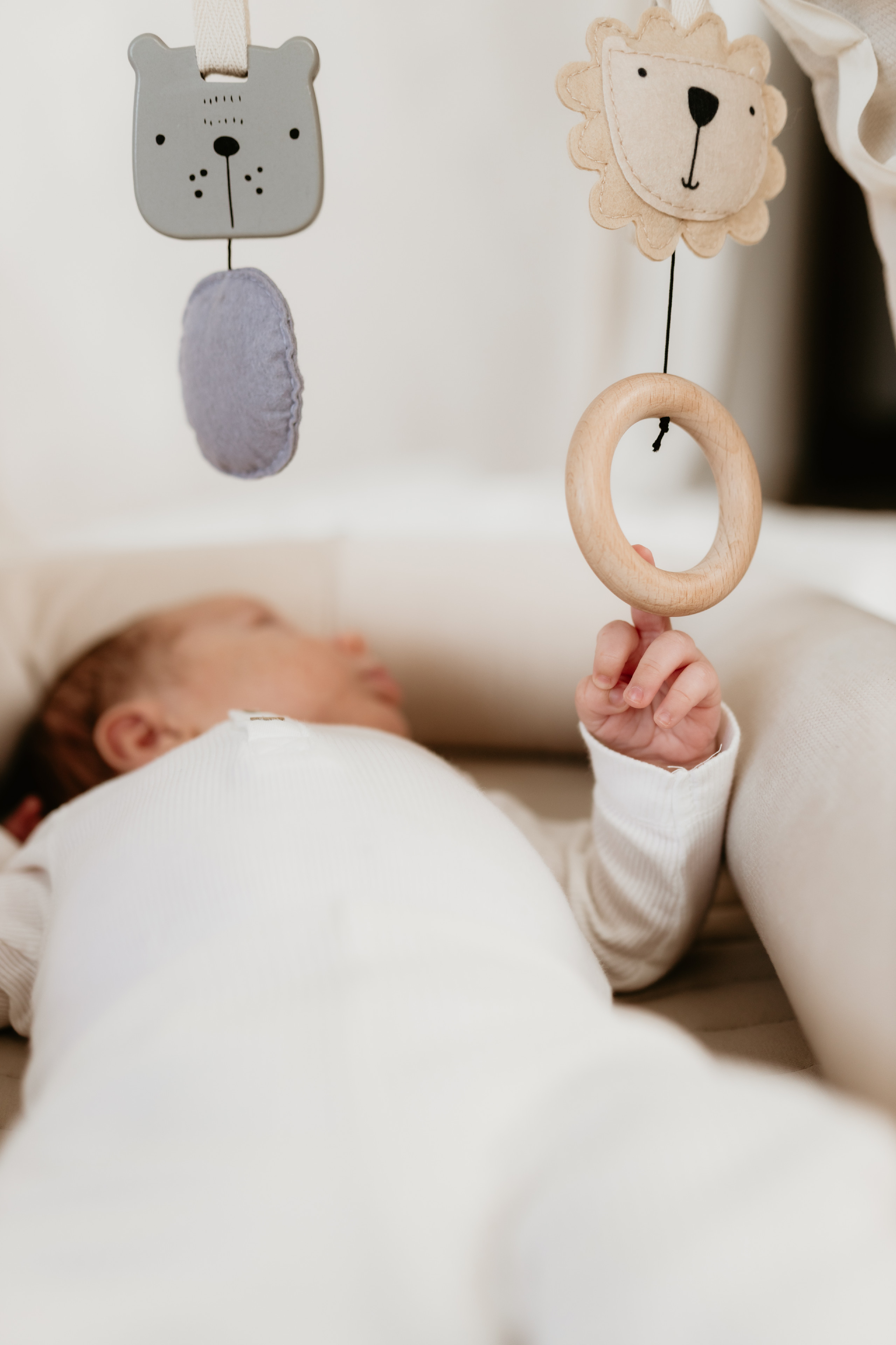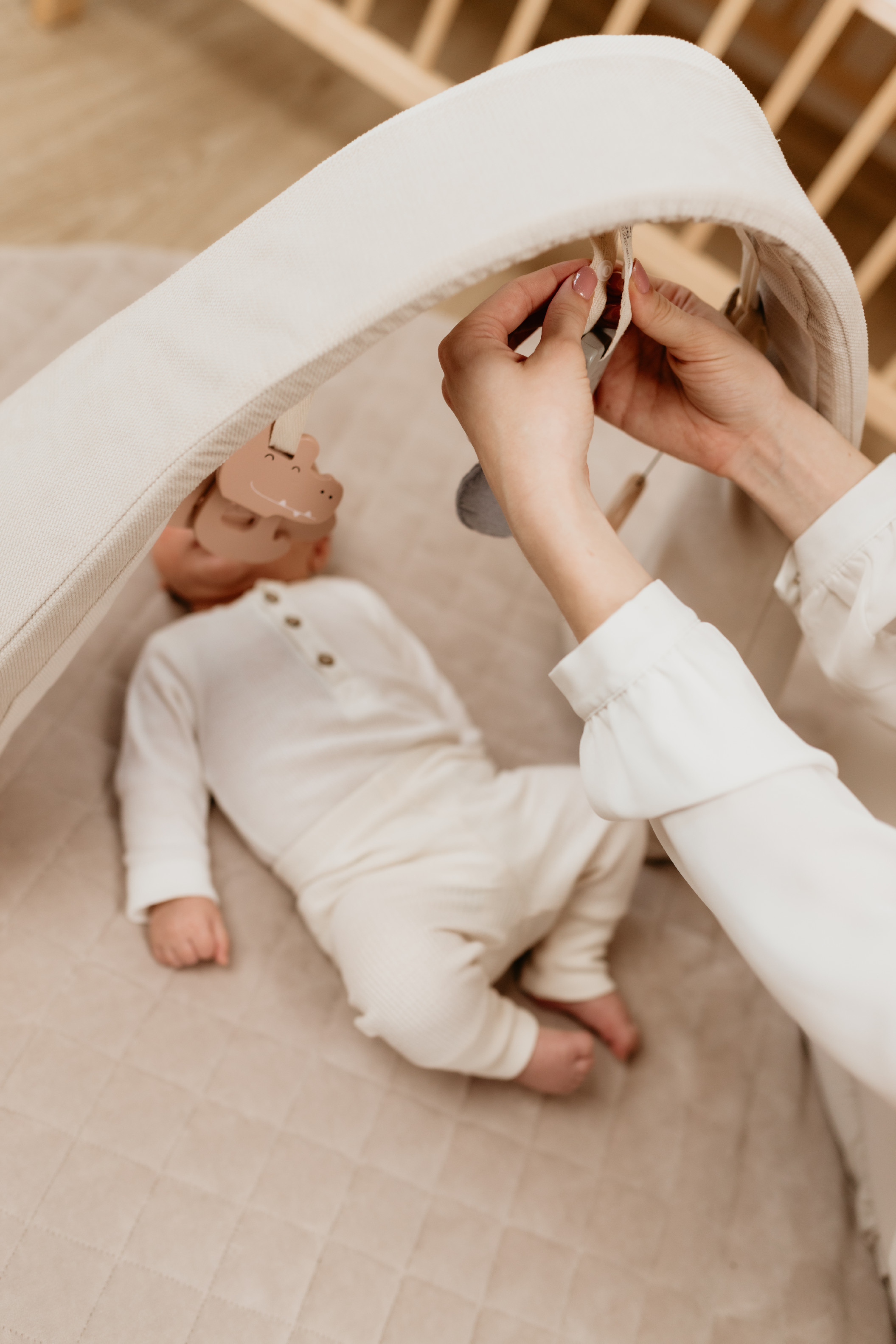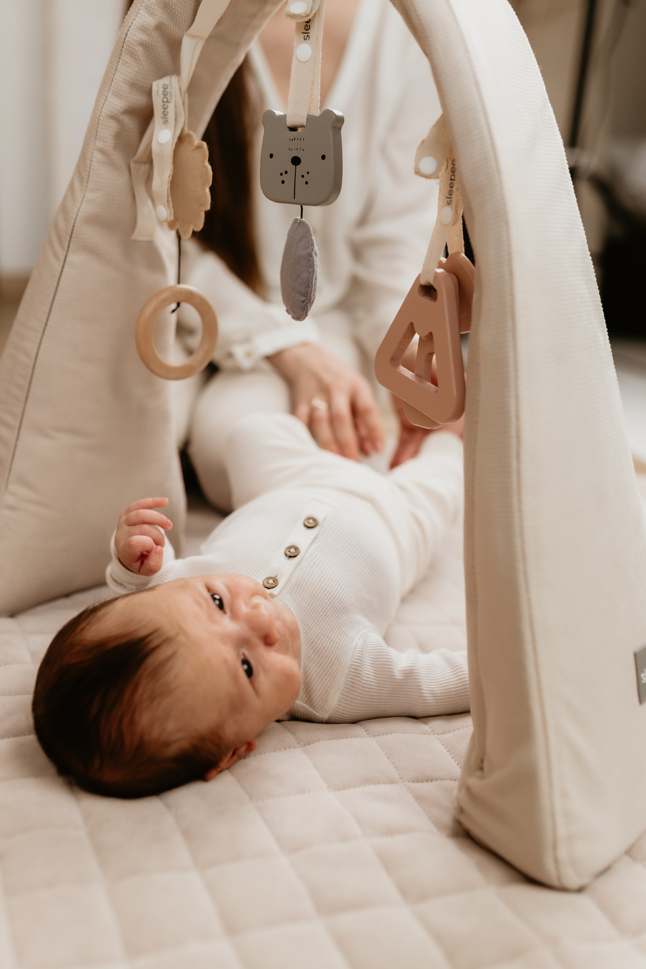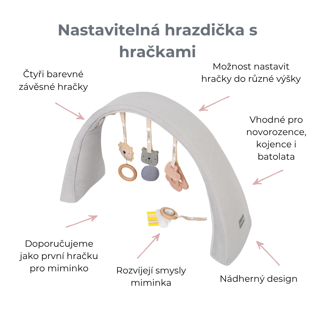 Nastavitelná hrazdička s hračkami Sleepee obsahuje čtyři barevné závěsné hračky, které rozvíjejí smysly miminka. Hrazdičku můžete využít jako součást hnízdečka i samostatně na hrací dece, podlaze nebo gauči. Doporučujeme jako první hračku pro miminka, kterou si brzy zamiluje.