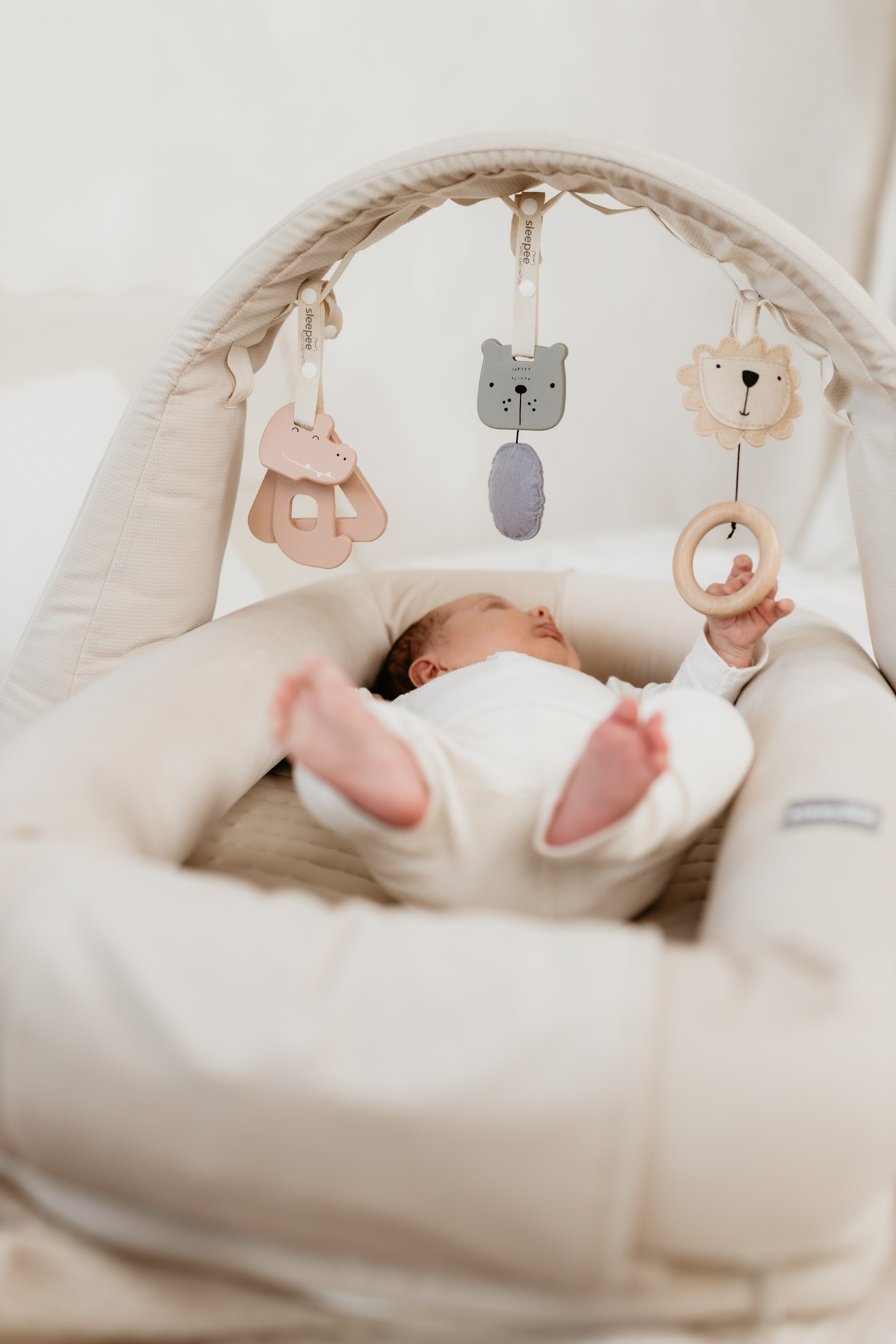 Nastavitelná hrazdička s hračkami a bílým šumem 2v1 Sleepee obsahuje hrací hrazdičku se závěsnými hračkami a zvukový modul s bílým šumem, tlukotem srdce a zvuky deště a přírody. K sadě získáte luxusní prostornou tašku jako dárek zdarma pro snadný přenos hnízdečka.