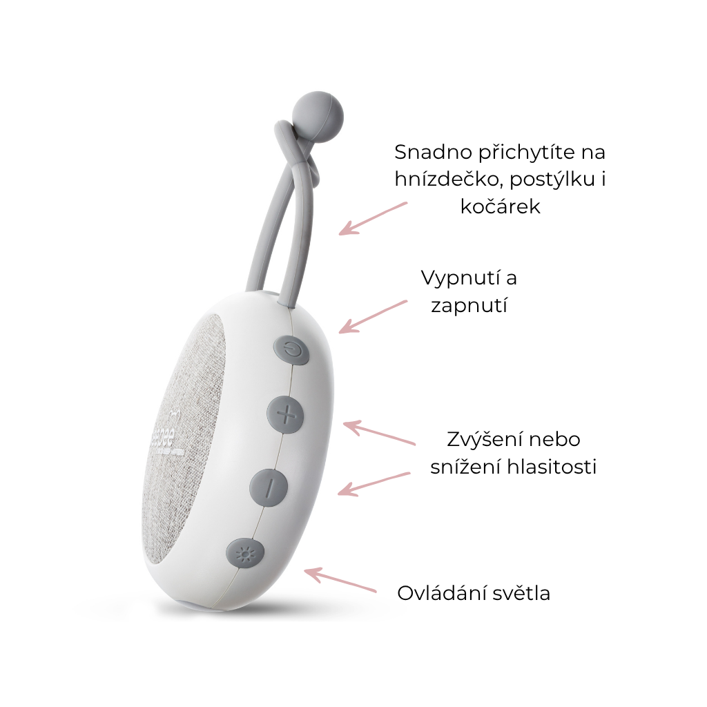 Nastavitelná hrazdička s hračkami a bílým šumem 2v1 Sleepee obsahuje hrací hrazdičku se závěsnými hračkami a zvukový modul s bílým šumem, tlukotem srdce a zvuky deště a přírody. K sadě získáte luxusní prostornou tašku jako dárek zdarma pro snadný přenos hnízdečka.