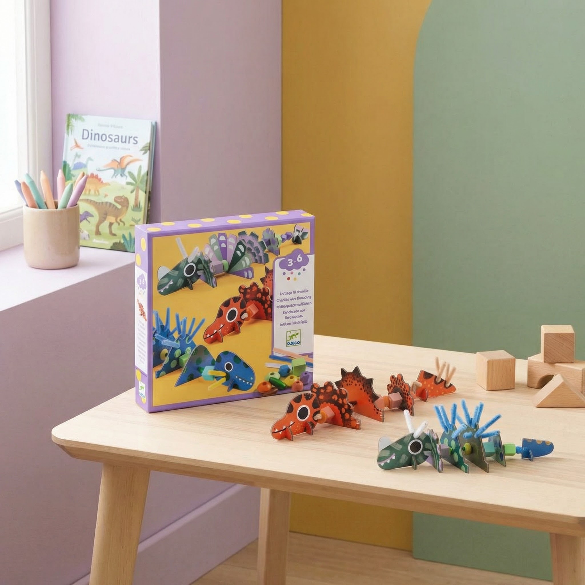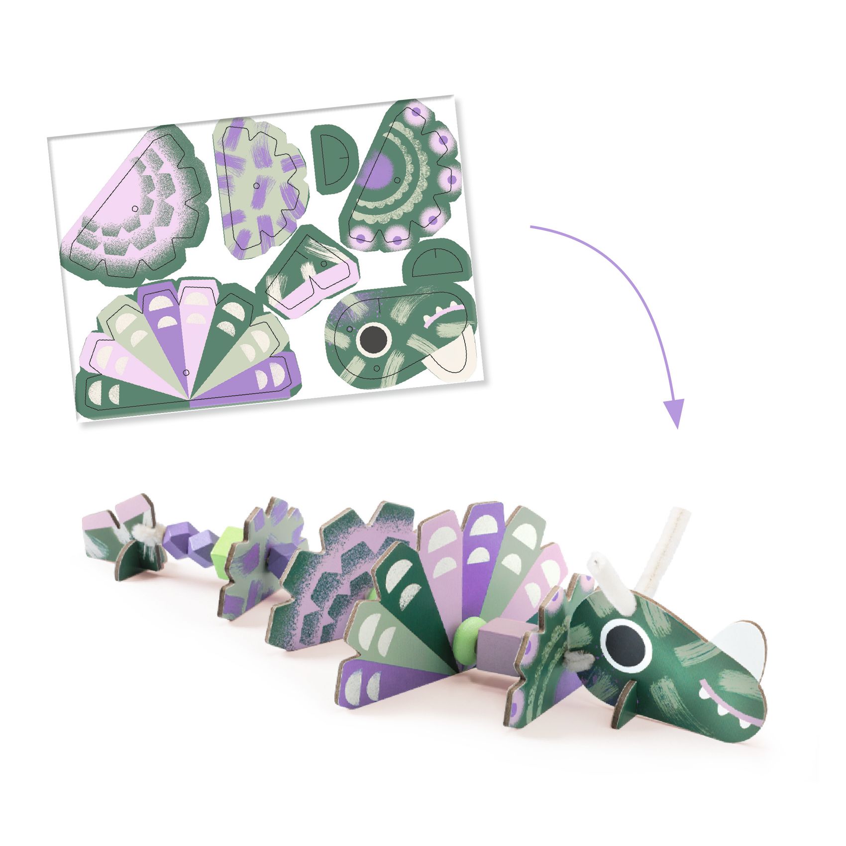 Navliekanie Dinosaury Vytvor si vlastných dinosaurov: navliekaj drevené korálky a kartónové dieliky na chlpaté drôtiky (ženilky)Navliekanie Dinosaury je kreatívna aktivita pre deti od 3 rokov, pri ktorej si poskladajú až 3 originálnych dinosaurov.Dieťa navlieka drevené korálky a predseknuté kartónové prvky na ohybný chlpatý drôtik (ženilku) a kombinuje dieliky podľa návodu alebo podľa vlastnej fantázie.Tvorenie prirodzene rozvíja jemnú motoriku, trpezlivosť a predstavivosť – a hotové dinosaury sú skvelé aj na hru.Obsah balenia 3× kartónová doska s prvkami na vylúpnutie 6× chlpatý drôtik na navliekanie 39× drevená korálka 1× obrázkový návodRýchly prehľad odporúčaný vek: 3–6 rokov typ aktivity: navliekanie a skladanie (bez lepidla) rozvíja: jemnú motoriku, koordináciu oko–ruka, kreativitu výsledok: 3 dinosaury na hranie alebo vystavenie