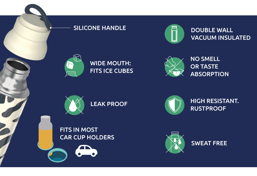 Termoska Quokka Pulse z vysoce kvalitní dvoustěnné oceli se spolehlivým, 100% těsnicím uzávěrem udrží váš nápoj dle potřeby teplý či studený. Široké hrdlo umožňuje vložení kostek ledu. Termoska udrží teplotu studeného nápoje s ledem až 48 hodin, studeného nápoje až 16 hodin a teplého nápoje až 12 hodin. Silikonové poutko, které je zakomponované do víčka láhve, usnadňuje přenášení.