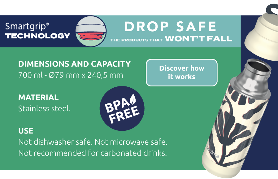 Quokka Pulse je součástí kolekce lahví a hrnků Drop Safe se speciálním dnem Smartgrip®, které při postavení na hladký povrch brání převržení a nechtěnému vylití obsahu láhve.