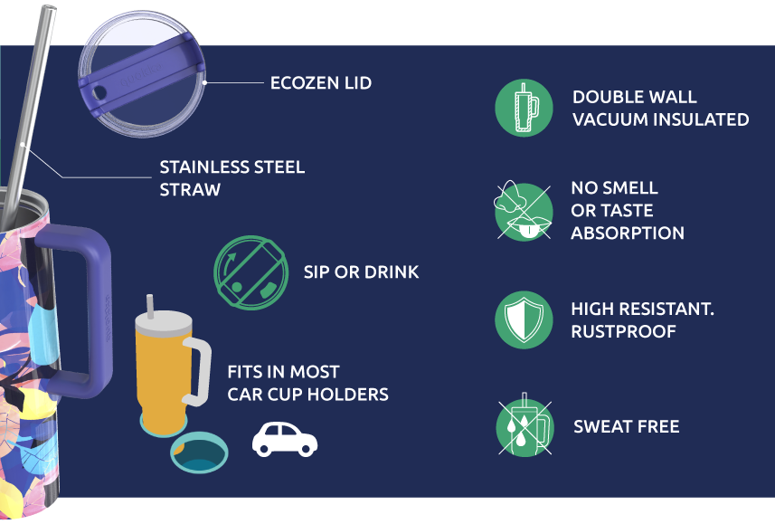 Termohrnek Quokka Vibe z vysoce kvalitní dvoustěnné oceli udrží teplotu nápoje studeného s ledem až 48 hodin, studeného až 14 hodin a teplého až 8 hodin. Termohrnek s vyjímatelným nerezovým brčkem umožňuje snadné pití bez nutnosti naklánění. Spolehlivý uzávěr z kvalitního Ecozen plastu chrání obsah před vylitím a umožňuje z termohrnku pít i bez brčka. Široké hrdlo umožňuje vložení kostek ledu a zároveň se díky němu hrnek snadno čistí.