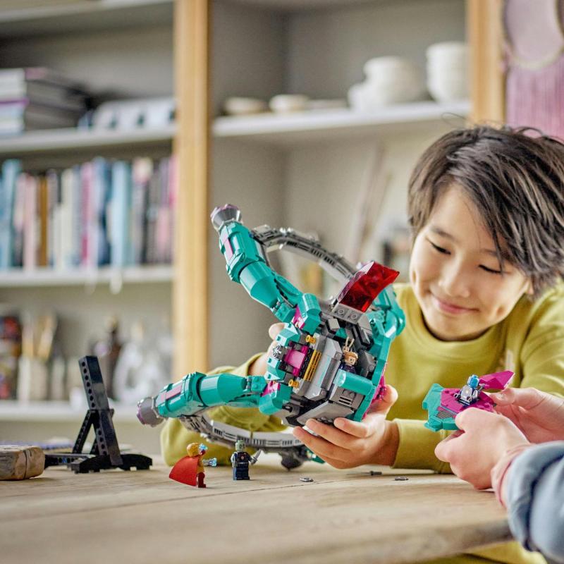 Stavebnica LEGO® Marvel 76255 Nová loď Strážcov vloží deťom do vlastných rúk hviezdu vesmírneho cestovania z tretieho dielu Strážcov Galaxie od štúdia Marvel. Táto pôsobivá vesmírna loď na hranie aj vystavenie zavedie deti vo veku od 10 rokov do vesmíru plného nápaditých hier. 3 vesmírne lode v 1 Táto zostaviteľná vesmírna loď je presne taká úžasná, ako na prvý pohľad vyzerá. Obsahuje otvárací kokpit s priestorom pre 3 minifigúrky, tajnú skrýšu pre ďalšiu minifigúrku, úložný priestor pre zbrane a príslušenstvo a 2 malé vesmírne lode, ktoré sa od materskej lode dajú odpojiť. V stavebnici nechýba 5 filmových minifigúrok: Mantis, Drax, Star-Lord, Nebula a Adam Warlock. Vesmírnu loď môžete ľahko zdvihnúť a letieť s ňou vesmírom, a po celodennej akcii sa bude skvelo vynímať na stojane v každej detskej izbe. Ak chcú deti zažiť aj digitálny rozmer, stačí použiť aplikáciu LEGO Builder, kde si môžu modely približovať a otáčať v 3D prostredí, ukladať si stavebnice a sledovať postup stavania.