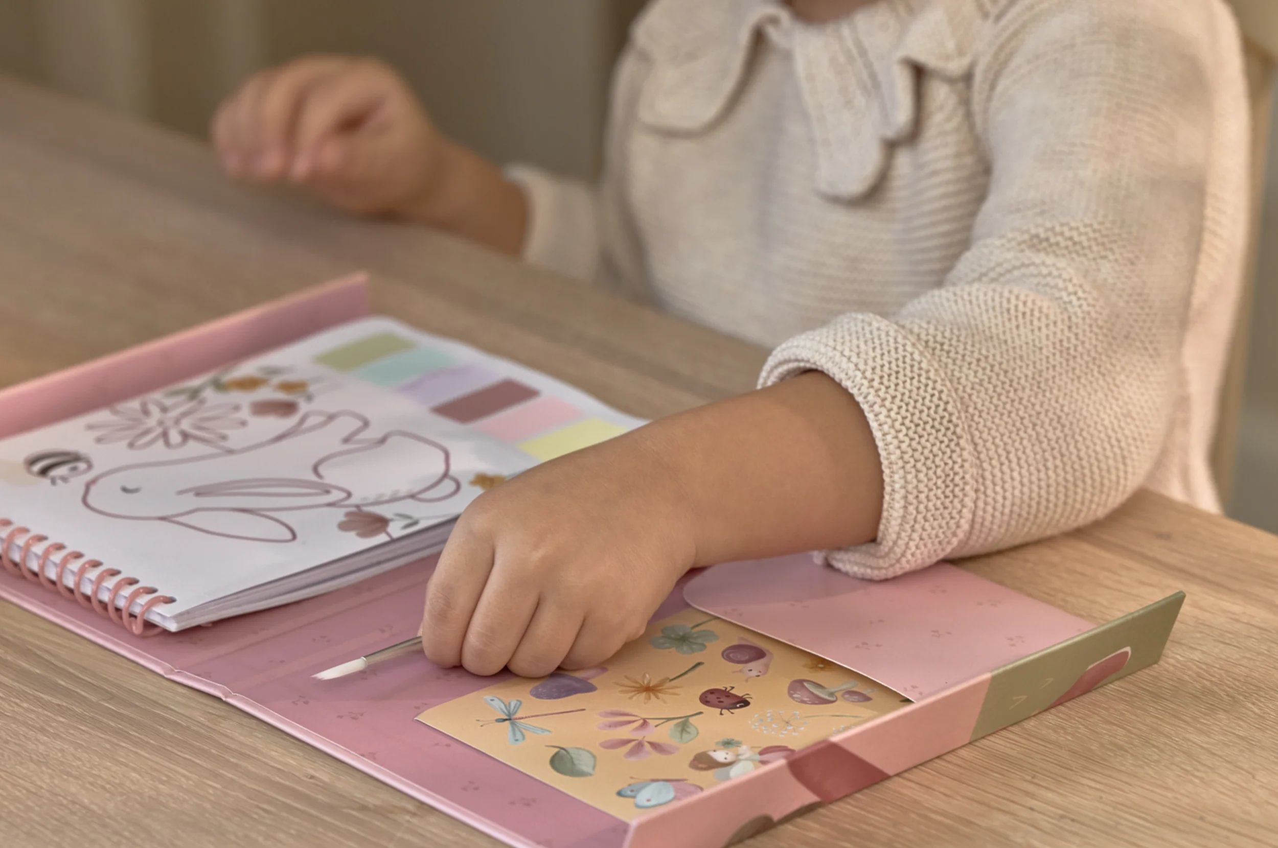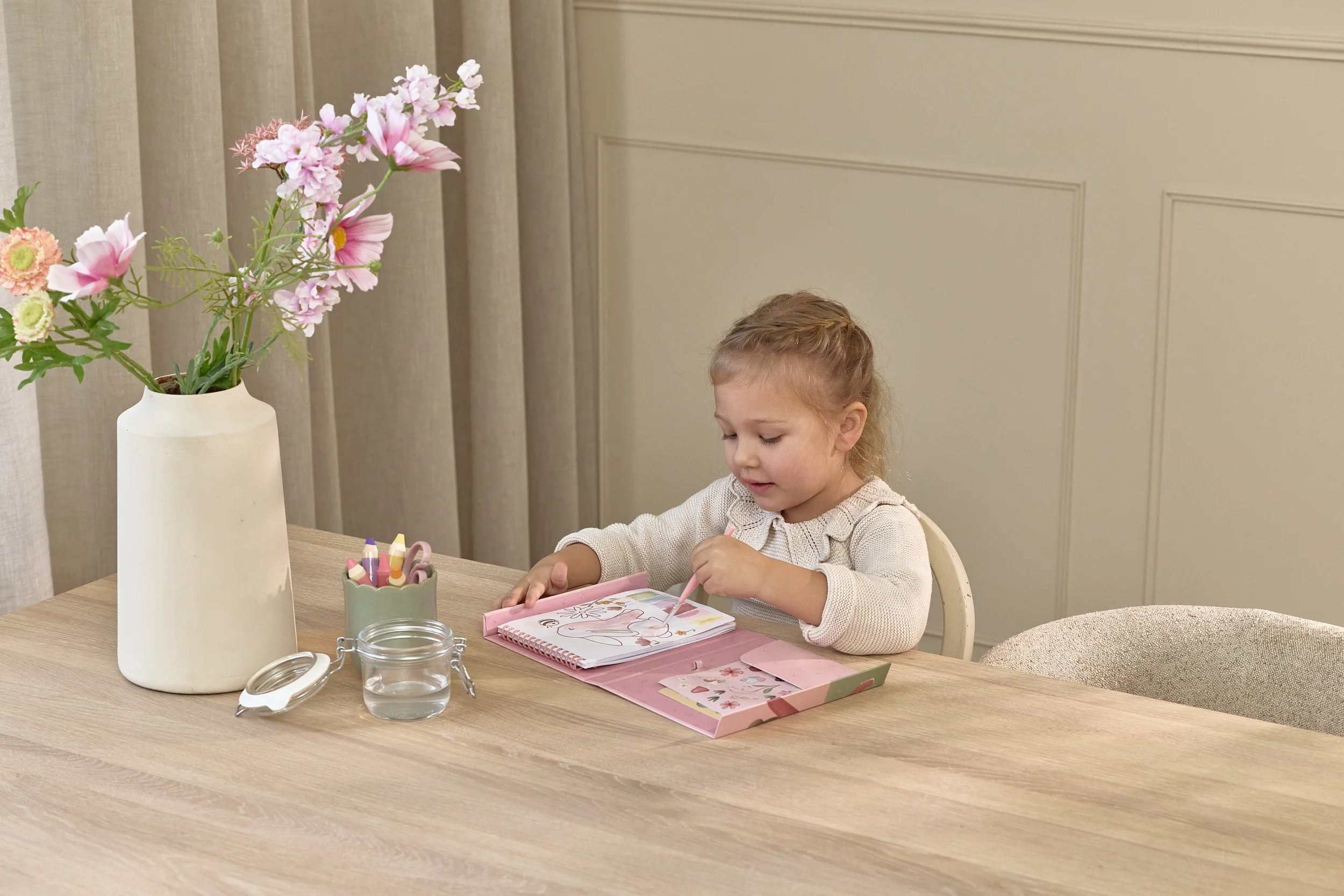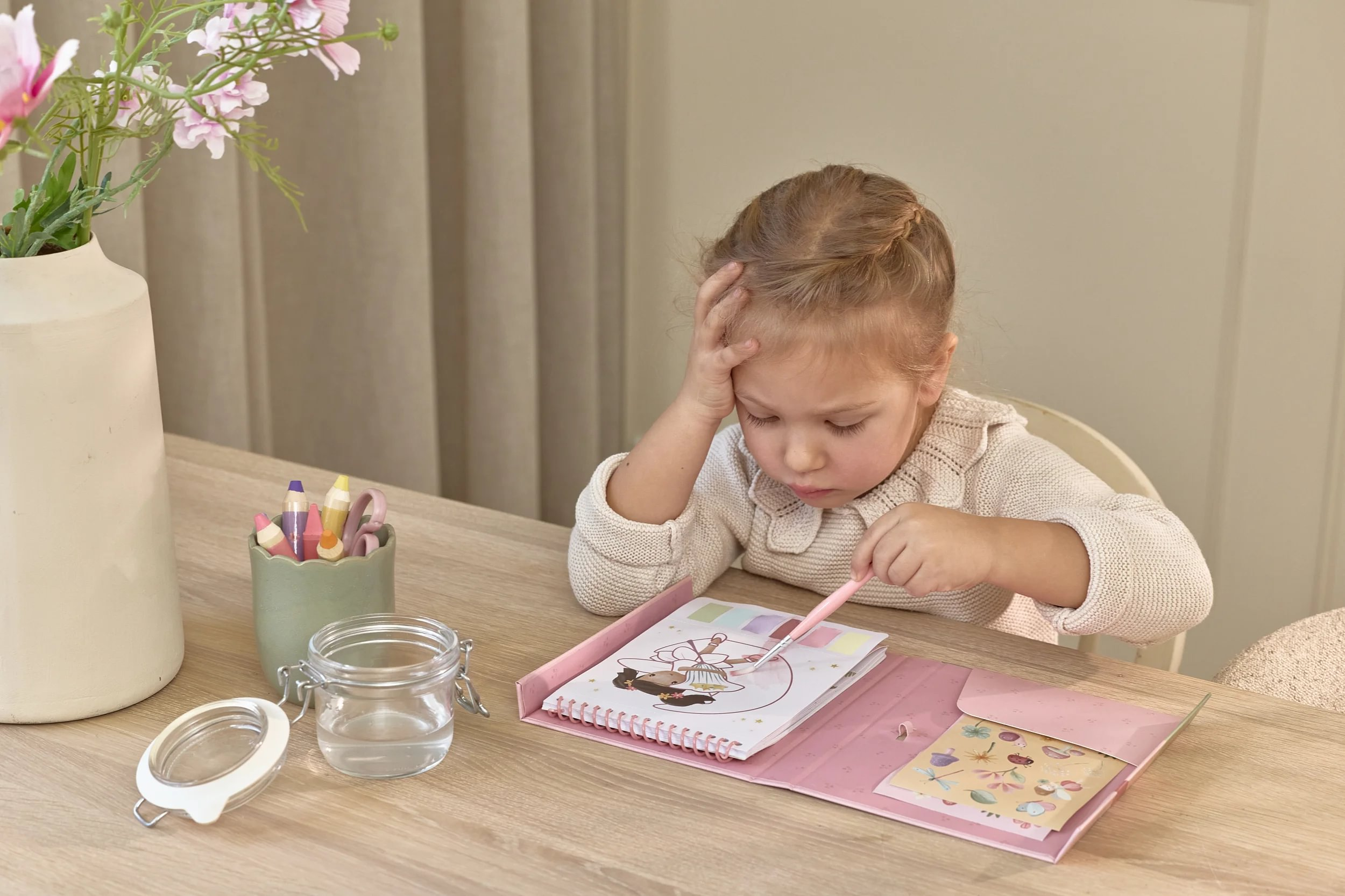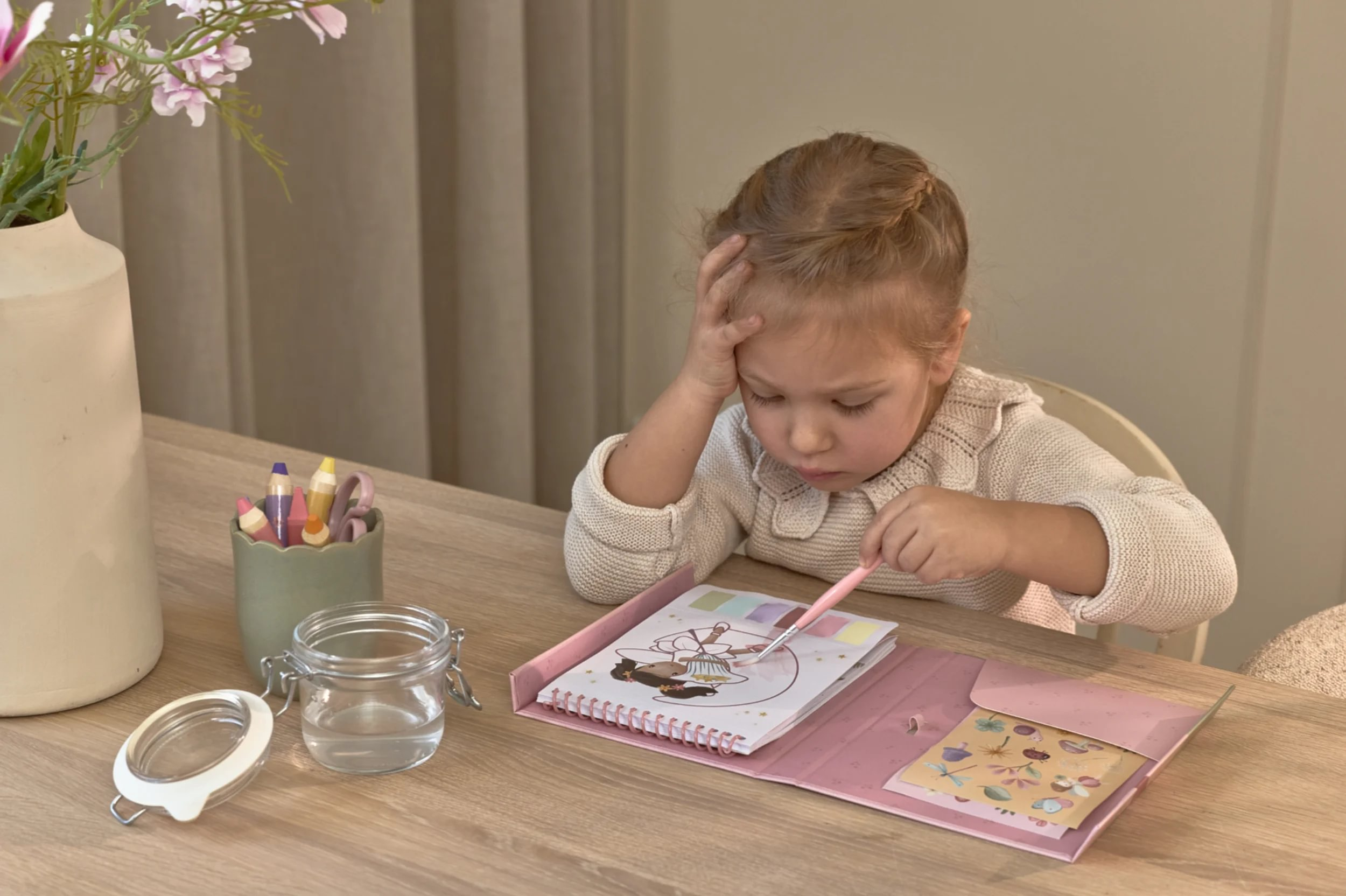 Vďaka pevnému obalu s magnetickým zapínaním a pútkom na štetec je všetko úhľadne pohromade. Špirála v chrbte umožňuje ľahké otáčanie stránok omaľovánok.