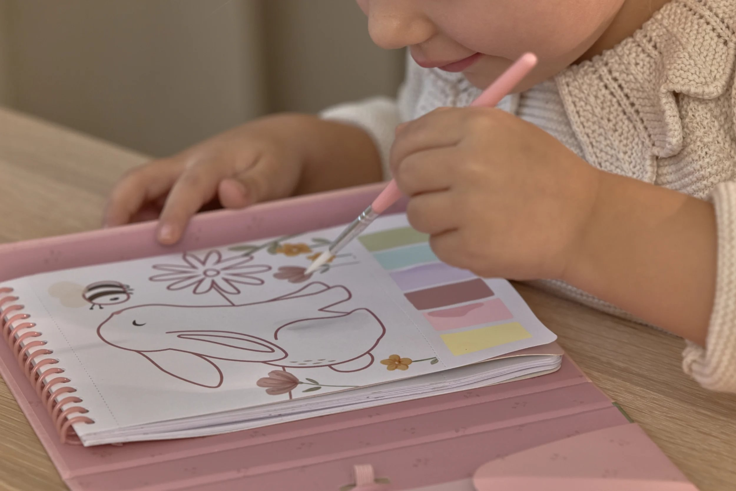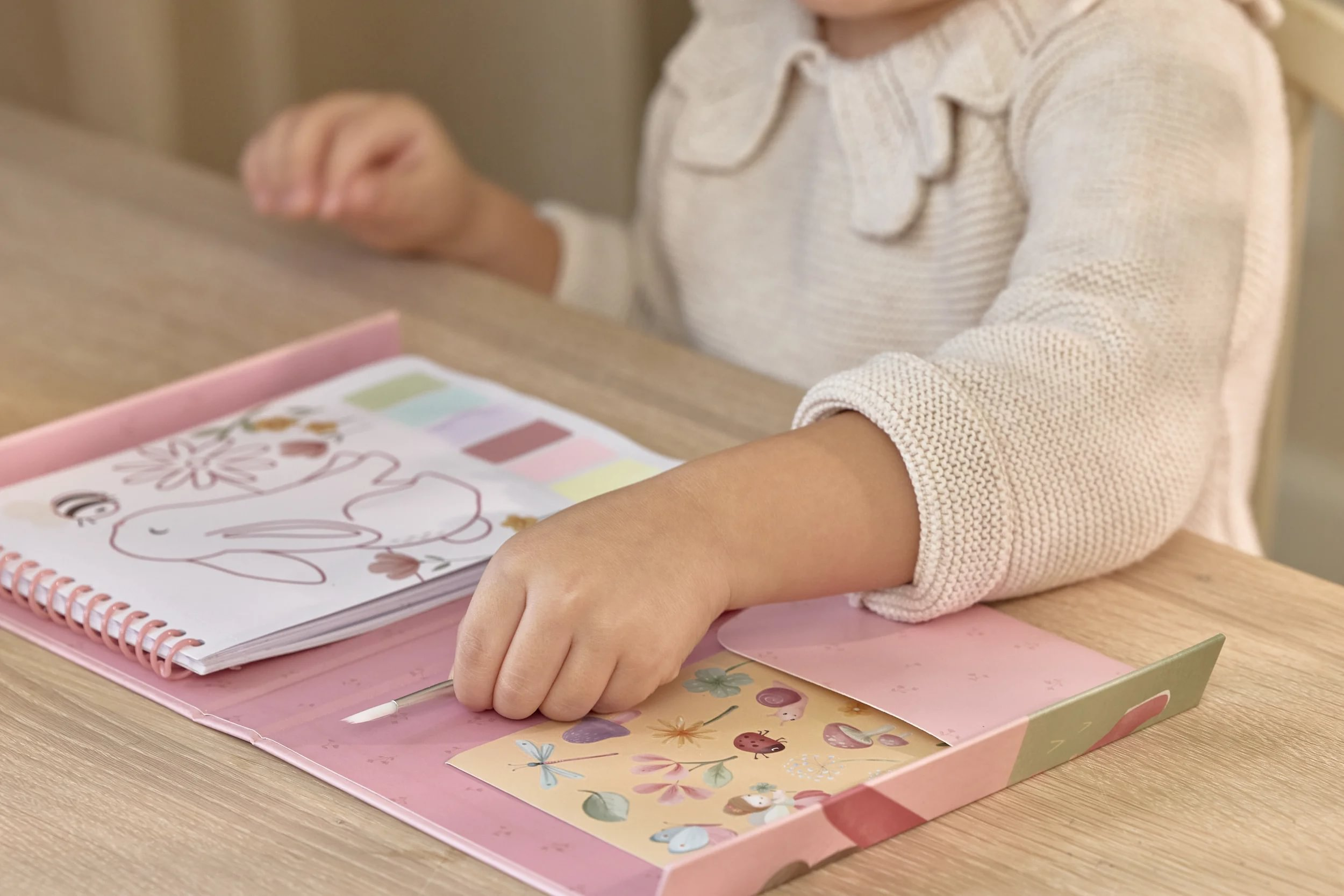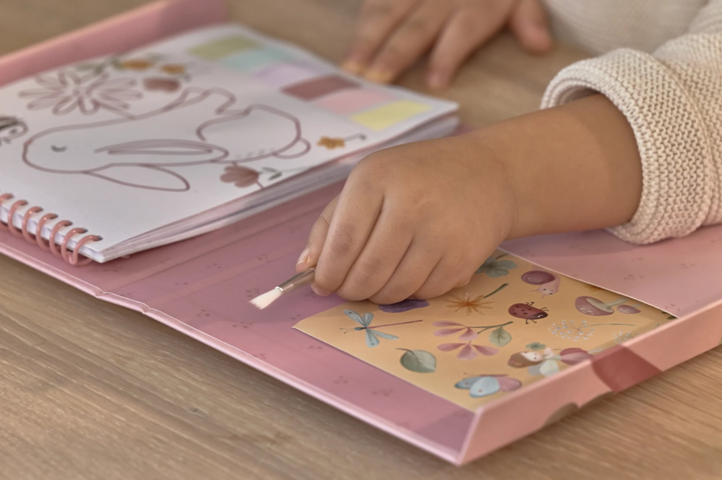 Vďaka pevnému obalu s magnetickým zapínaním a pútkom na štetec je všetko úhľadne pohromade. Špirála v chrbte umožňuje ľahké otáčanie stránok omaľovánok.