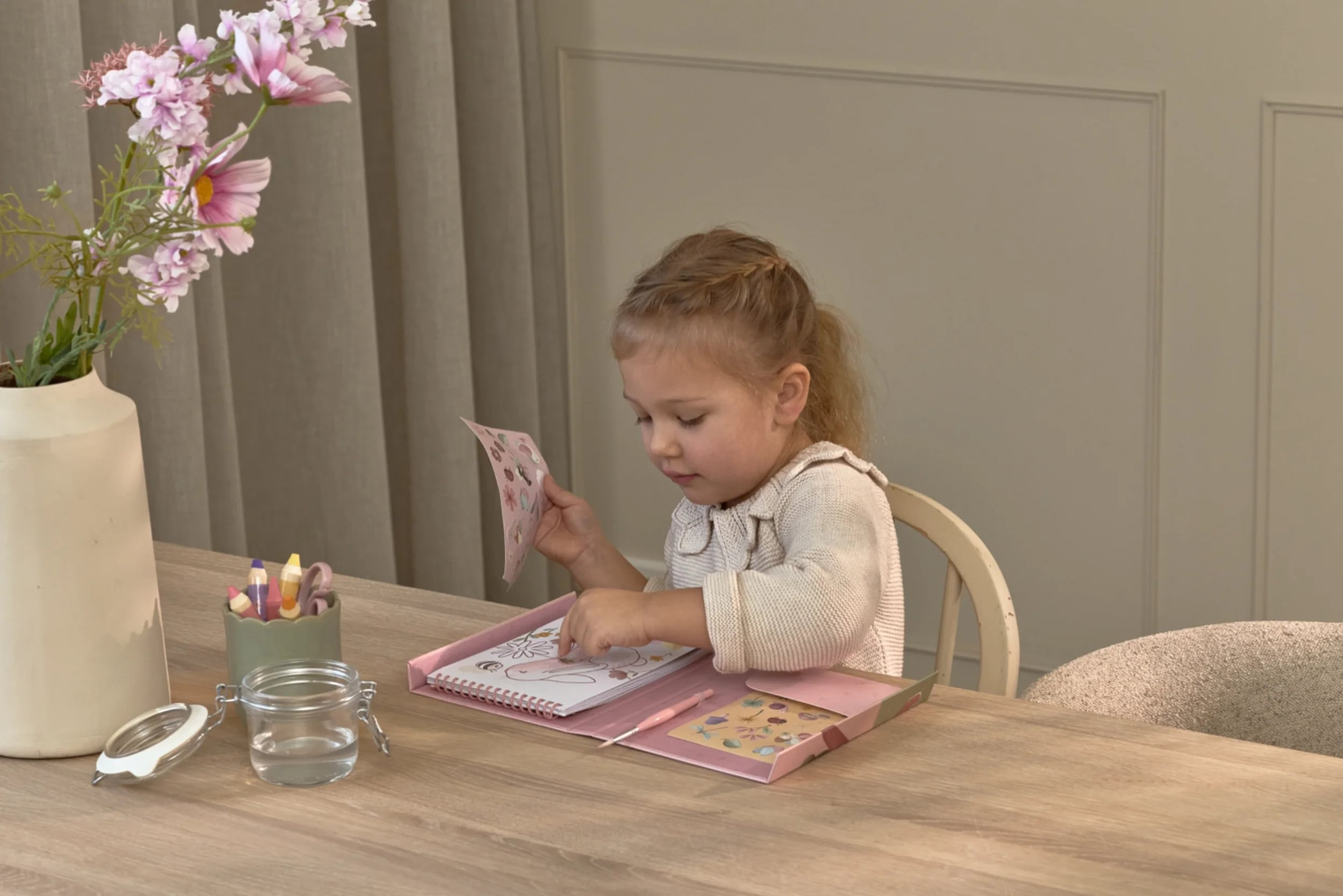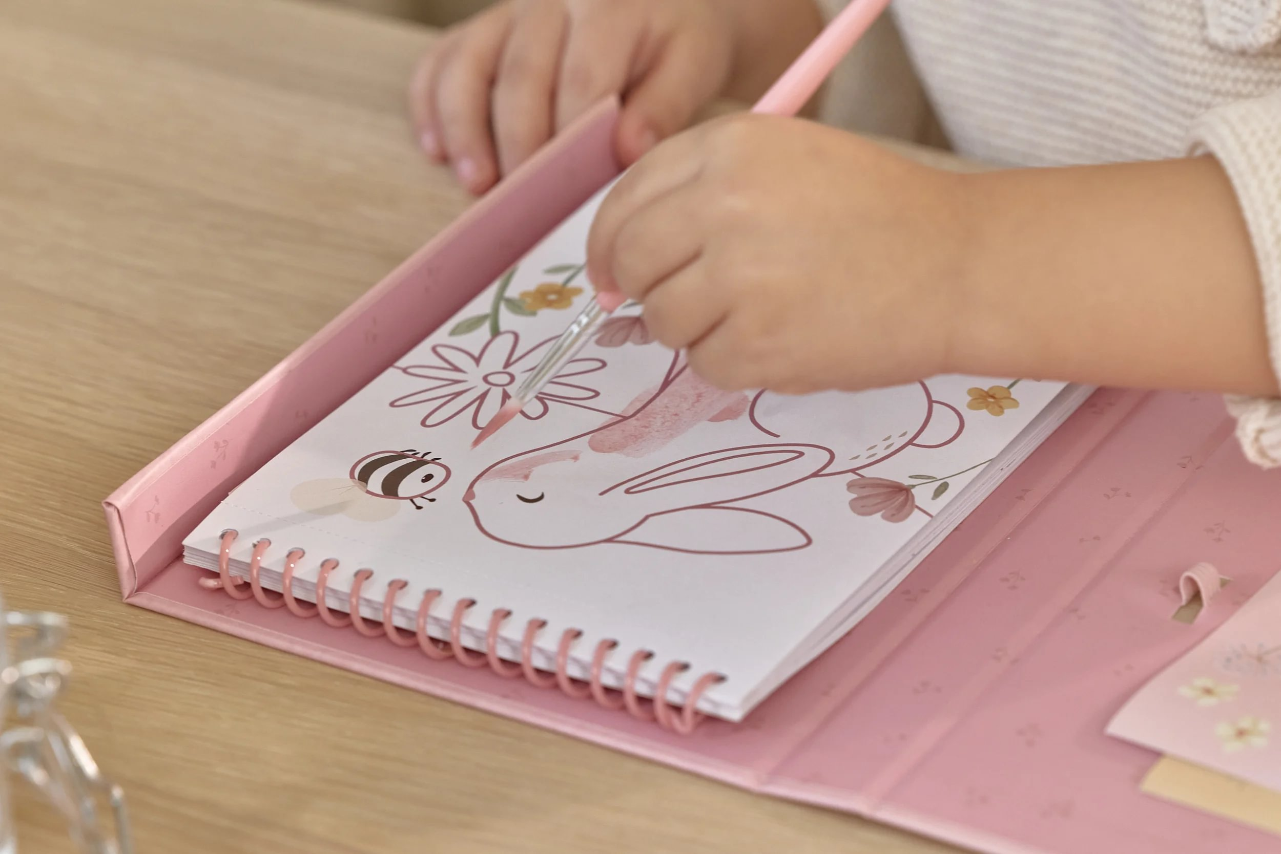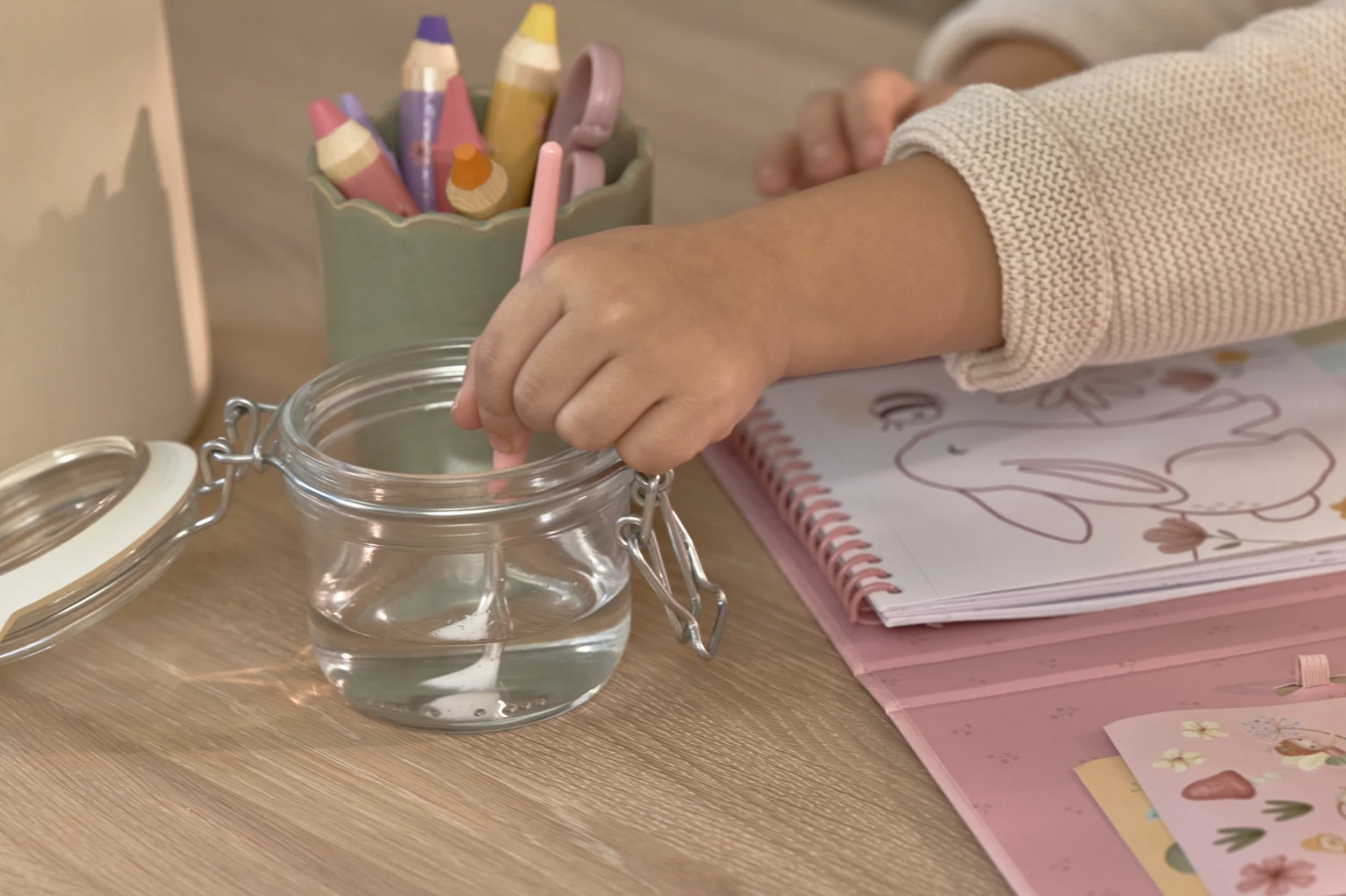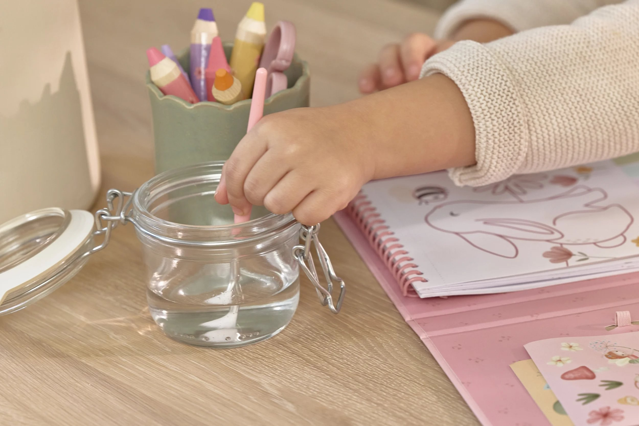 Vďaka pevnému obalu s magnetickým zapínaním a pútkom na štetec je všetko úhľadne pohromade. Špirála v chrbte umožňuje ľahké otáčanie stránok omaľovánok.