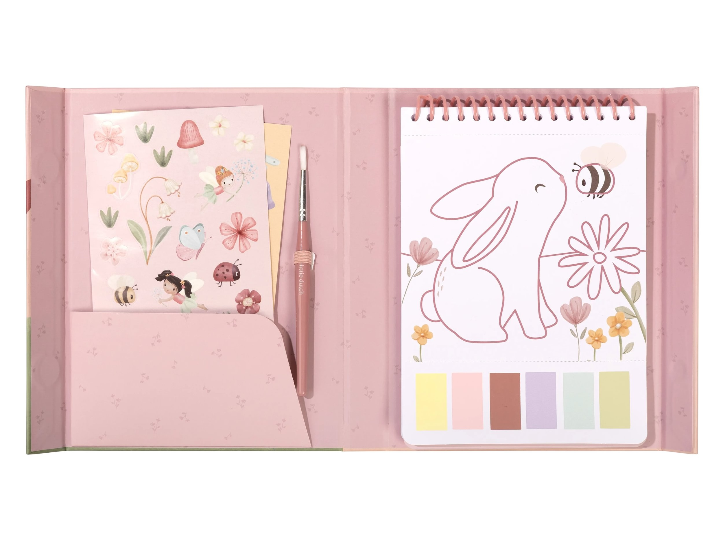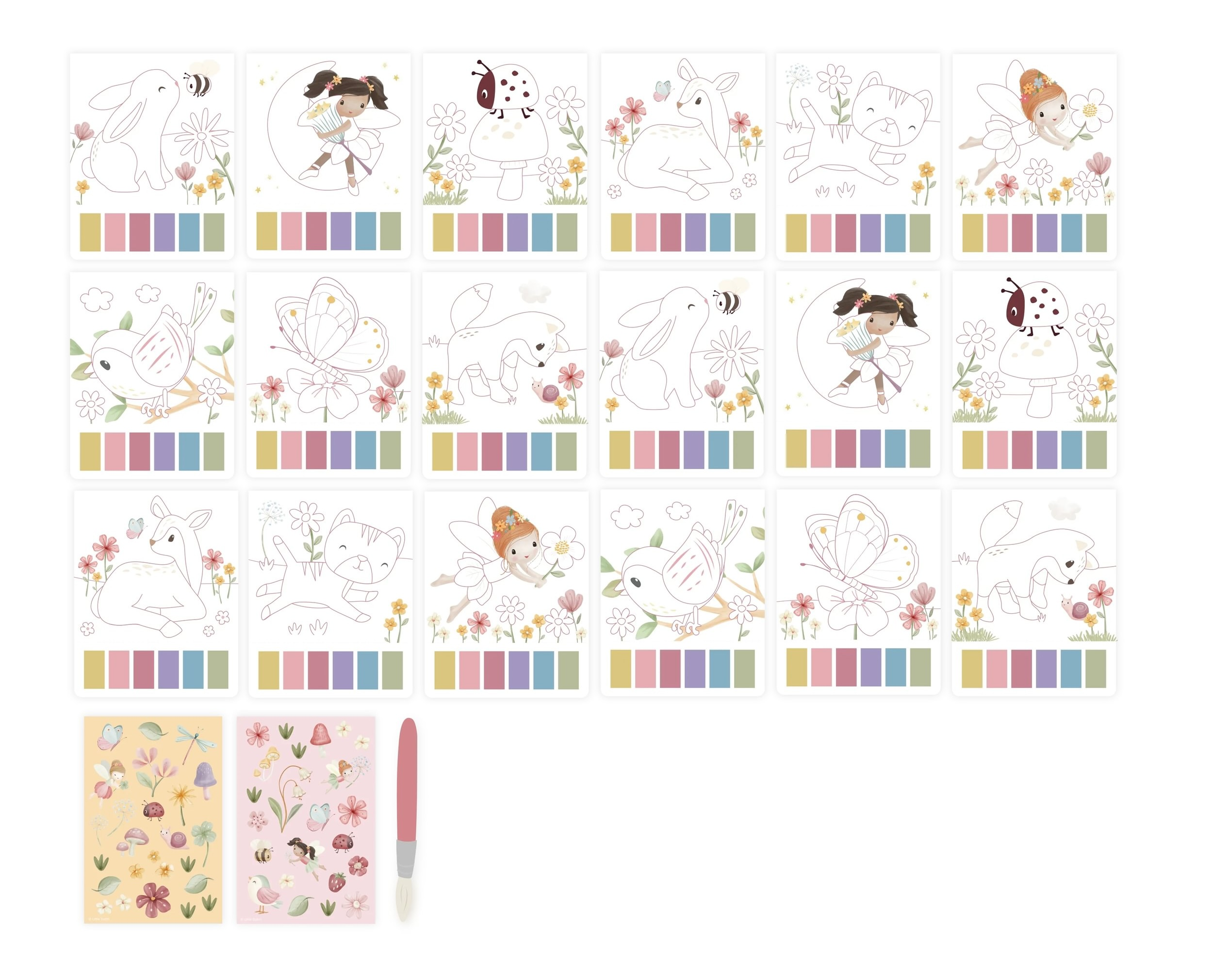 Krásne omaľovánky na silnom papieri obsahujú 18 stránok s jednoduchými obrázkami rozprávkových víl, zvieratiek a kvetov na vyfarbovanie. Každá stránka ponúka vlastnú paletu akvarelových farieb na vyfarbovanie štetcom, takže použitie je veľmi jednoduché. Pre väčšiu zábavu sú súčasťou aj dva archy krásnych farebných samolepiek na dotvorenie obrázkov.