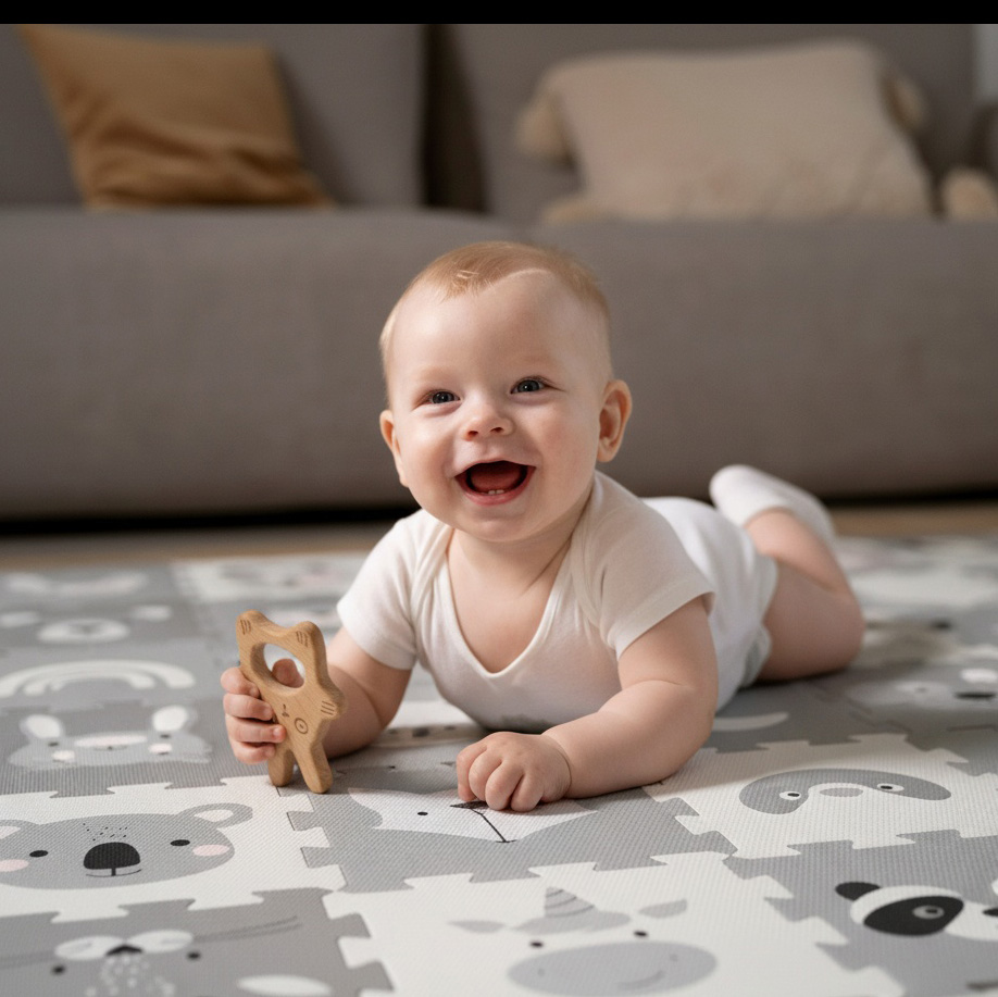 Penové puzzle je vyrobené z kvalitnej EVA peny. Slúži nielen ako podložka, ktorá zabezpečí pohodlie vďaka izolácii od chladu, ale aj ako praktická pomôcka pre prvé mesiace bábätka, keď poskytuje mäkkú oporu pri pásení koníčka alebo pri prvom lození.