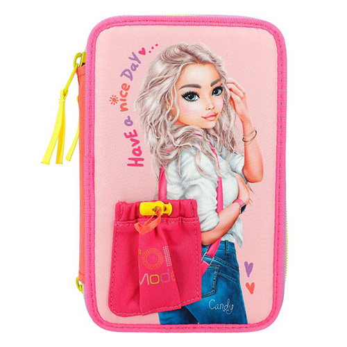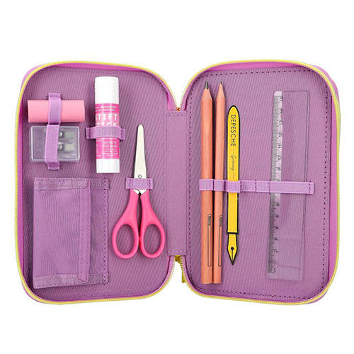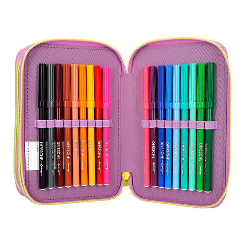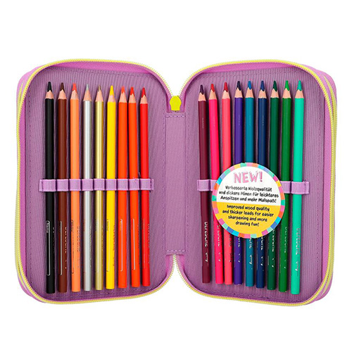 Tri samostatné priehradky sú úplne vyplnené 18 farbiacimi a fixkami, 2 ceruzkami, pravítkom, strúhadlom, gumou, nožnicami, lepiacou tyčinkou a malým vreckom na suchý zips.