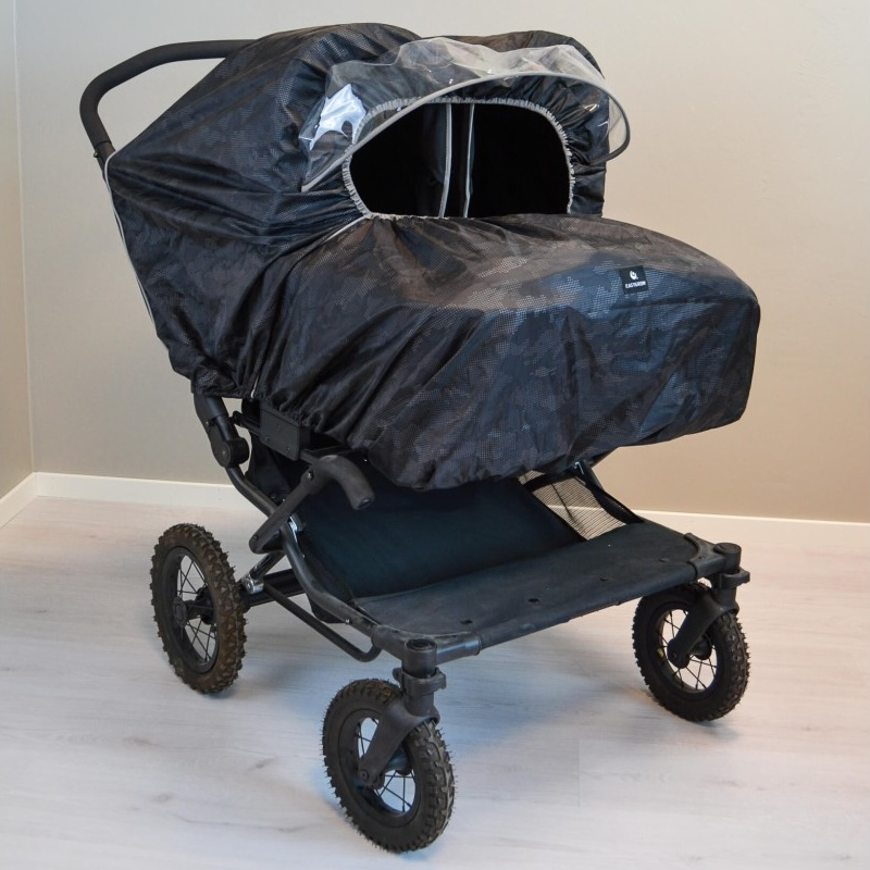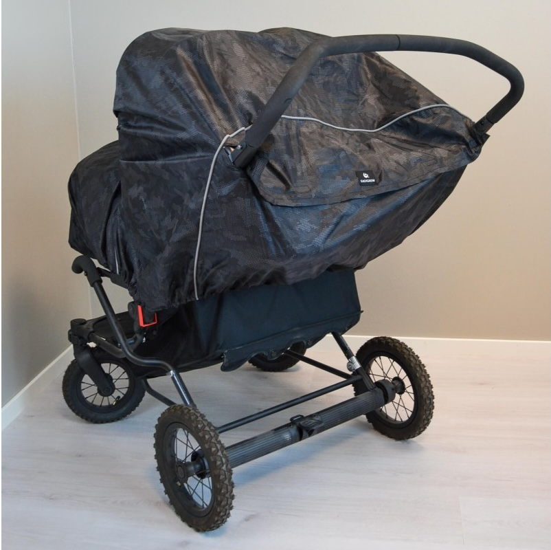 Univerzální pláštěnka na kočárek pro dvojčata je praktická ochrana proti dešti a větru. Průhledná přední clona chrání děti a zároveň nechává dovnitř kočárku proudit světlo a umožňuje výhled z kočárku. Velký přední otvor zajišťuje příjemné větrání. Pláštěnka má boční zip, díky kterému ji snadno otevřete a rychle sundáte i mokrou, a to s minimálním hlukem. Pro bezpečnější pohyb za šera je doplněná reflexními prvky. Po použití ji snadno složíte do integrované kapsy.