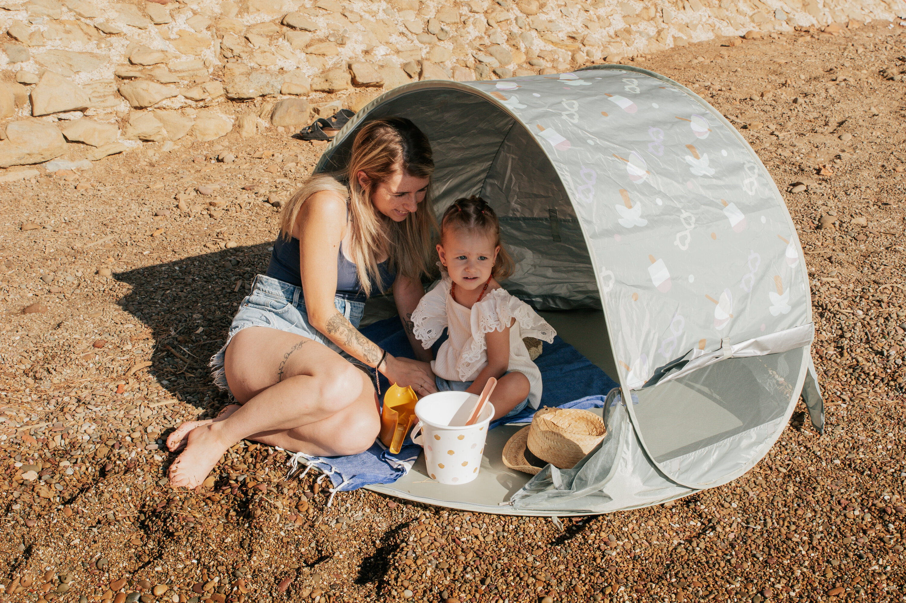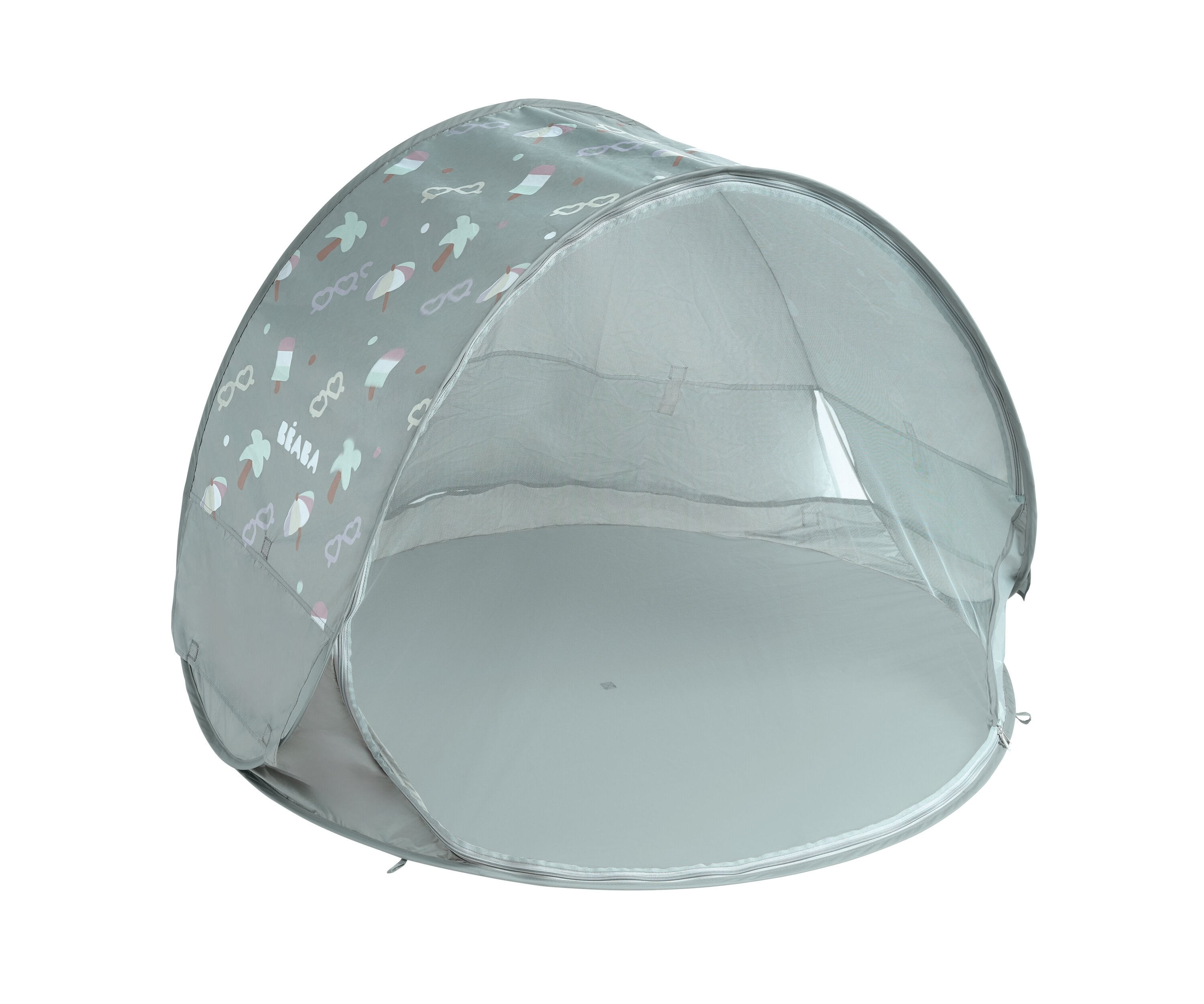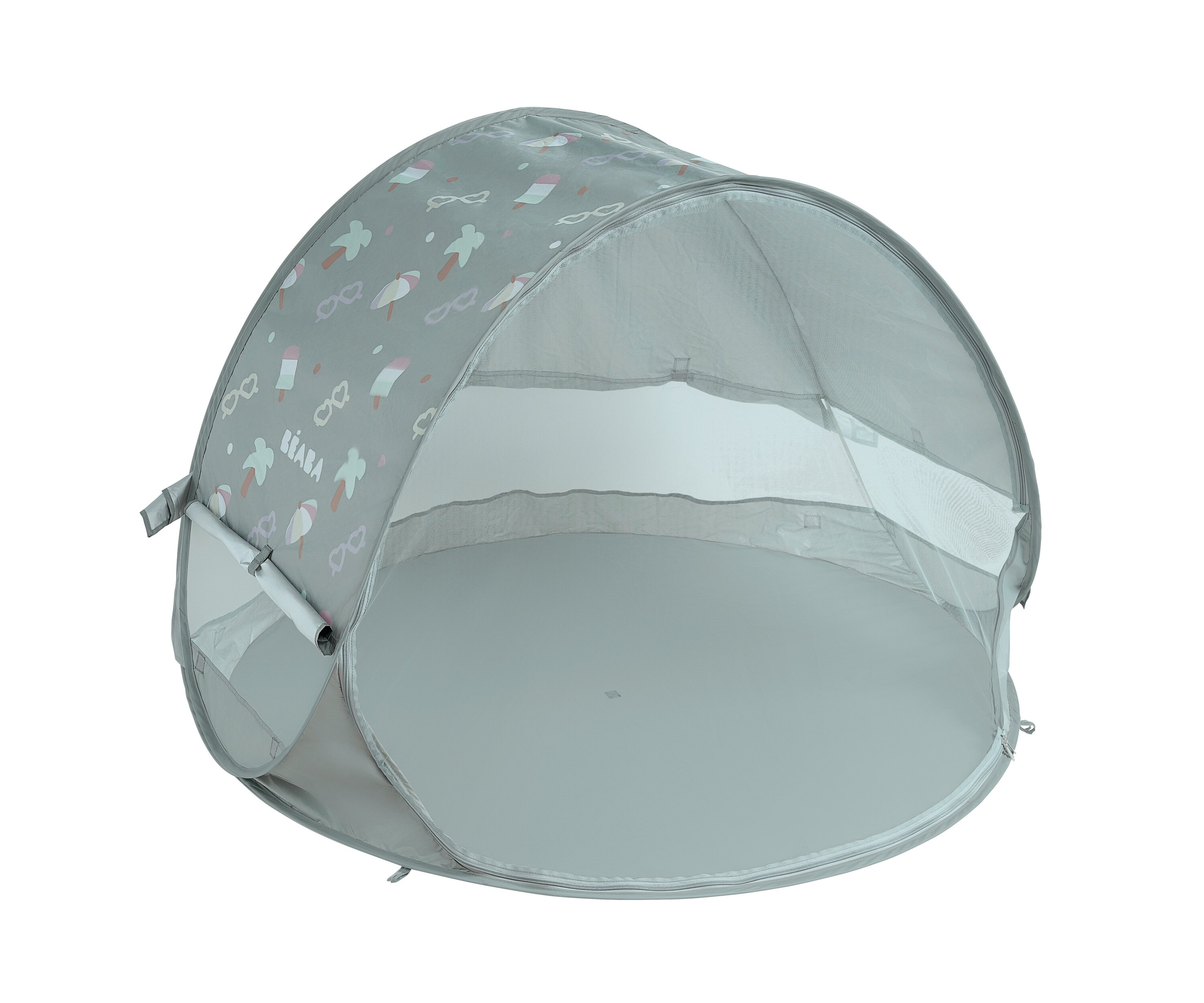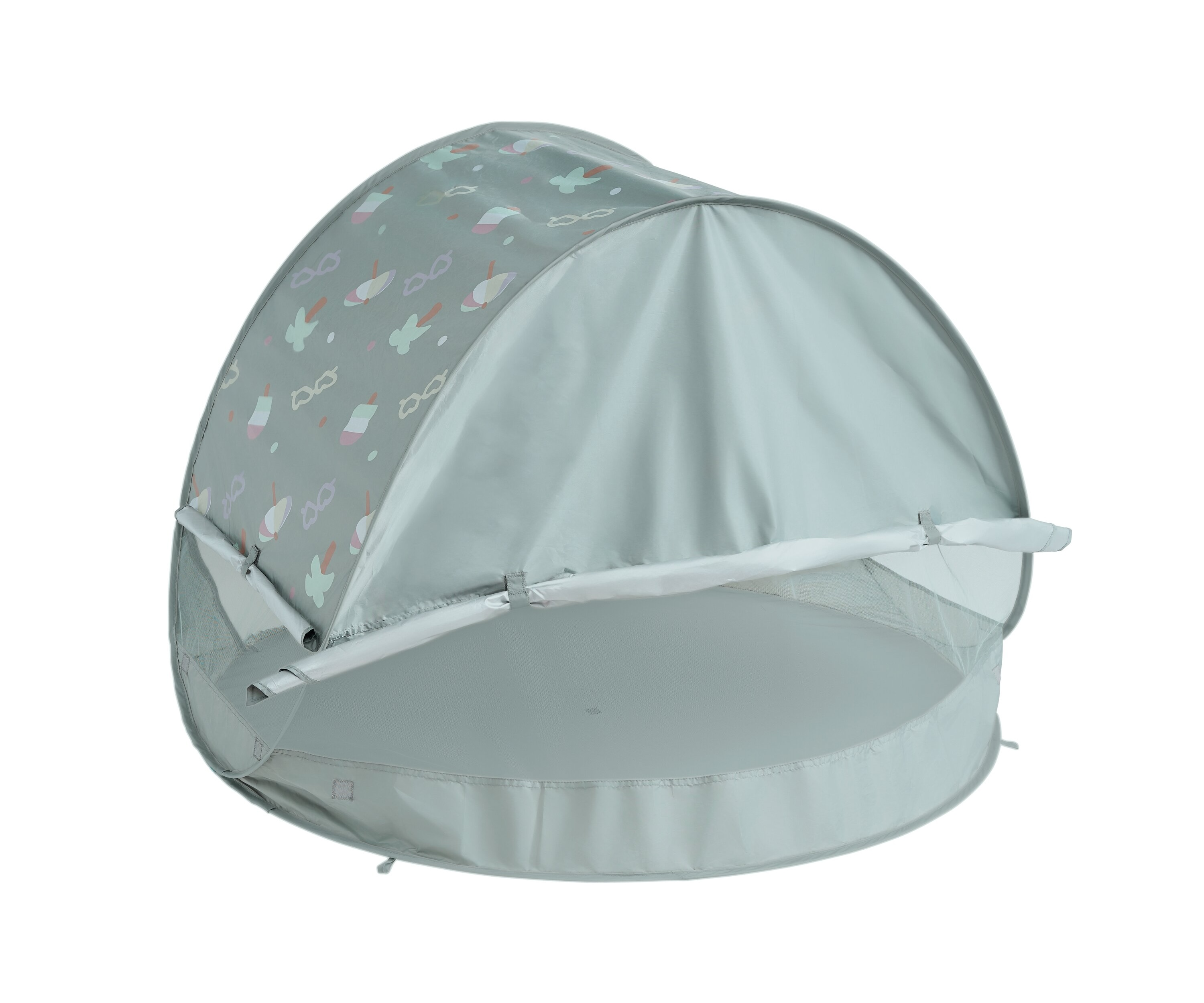 Prenosný univerzálny stan s UV faktorom 50+ na ochranu dieťaťa pred slnkom na záhrade, na pláži či na výletoch do prírody. Stan umožňuje ľahkú ventiláciu vďaka bočným otvorom so sieťovinou a textilnými chlopňami, ktoré je možné zrolovať. Sieťovina chráni dieťa v stane pred ťažkým hmyzom.