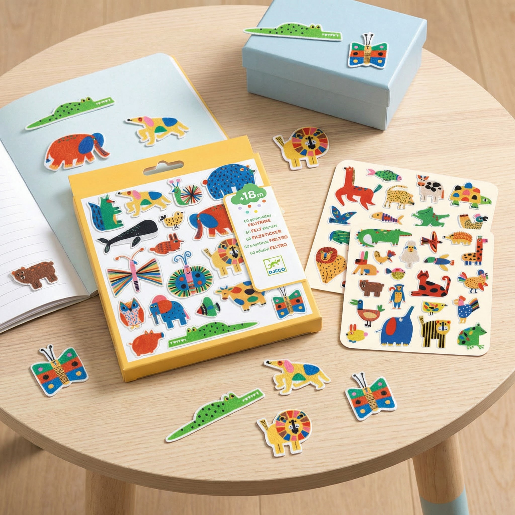 Plstené samolepky Zvieratká 60 ks Prvé lepenie už od 18 mesiacov: mäkučká plstená textúra a tvary, ktoré sa ľahko chytajúPlsten0 samolepky Zvieratká sú jednoduchá tvorivá aktivita pre najmenších, ktorá ich bezpečne a hravo zoznámi s lepením.Samolepky sú z mäkkej plsti a majú vystúpené/obrysové tvary, takže sa dobre držia v malých ručičkách a ľahko sa odlepujú z podkladu.Dieťa ich môže lepiť na papier, zošit alebo výkresy a vytvárať vlastné obrázky plné zvieratiek – bez neporiadku a bez lepidla.Obsah balenia 60× plstená samolepka so zvieratkamiRýchly prehľad odporúčaný vek: od 18 mesiacov formát balenia: približne 20 × 20 cm materiál: mäkká plsť (ľahko uchopiteľné tvary) rozvíja: jemnú motoriku, koordináciu oko–ruka, kreativitu udržateľnosť: kartónový obal s FSC certifikáciou