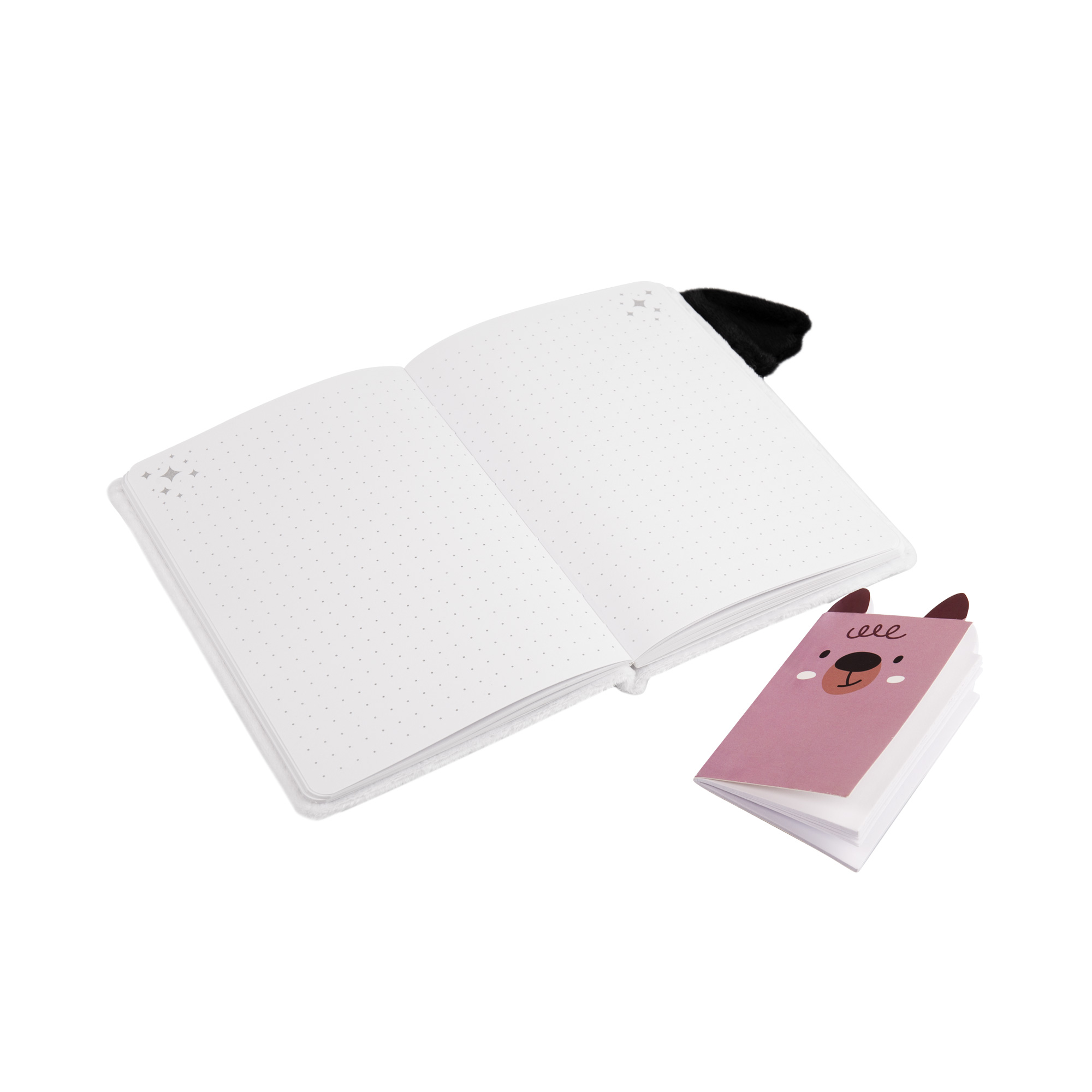 Bloky s pevnou väzbou s plyšovým povrchom, ktorý pripomína milé zvieratko. Ako bonus má každé zvieratko (blok) v prednom vrecku svoje bäbätko (mini blok), takže po zakúpení získate dva bloky v rovnakých motívoch - jeden veľký a jeden maličký. Veľký blok obsahuje bodkované stránky, v malom bloku nájdete čisté stránky. Rozmery veľkého bloku: cca 13,3 cm x 18,5 cm x 1,5 cm Rozmery veľkého bloku: cca 5,8 cm x 7 cm x 0,9 cm