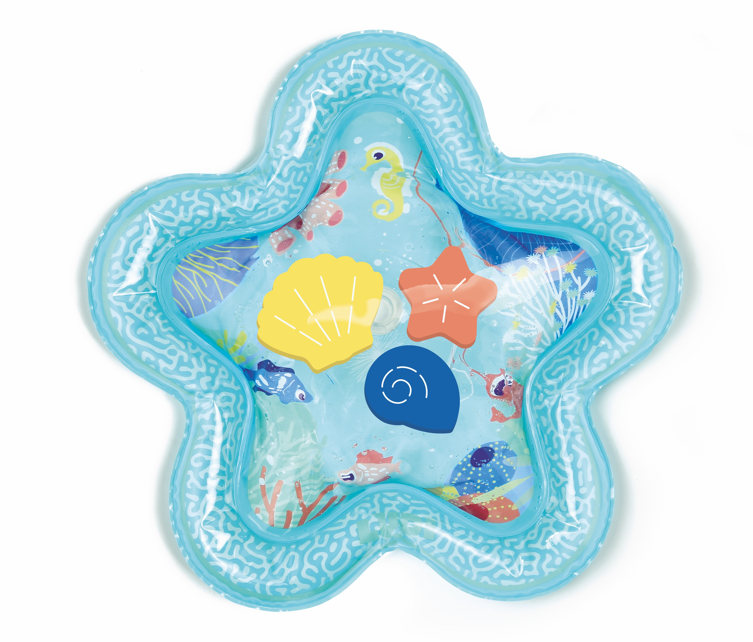 Interaktivní podložka na hraní naplněná vodou připomíná skutečný podmořský svět s vodními živočichy. Figurky mořských tvorů se uvnitř ve vodě začnou pohybovat, kdykoli dítě na podložku sáhne rukou.