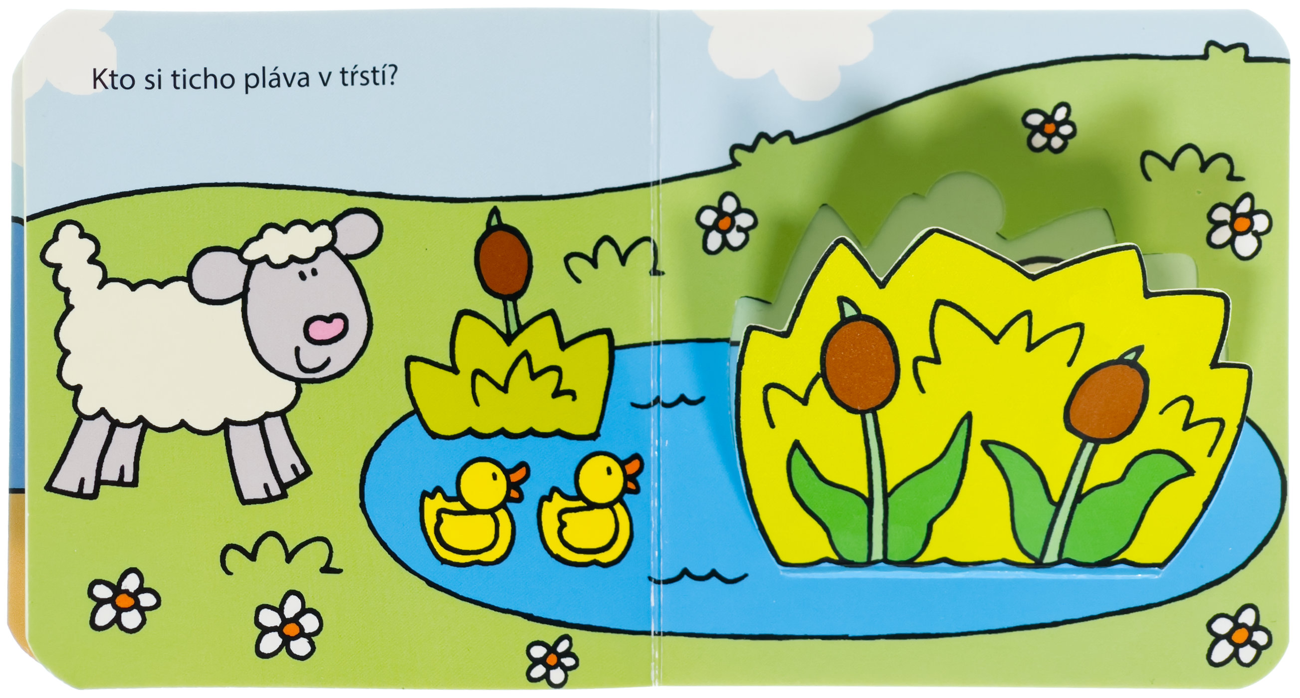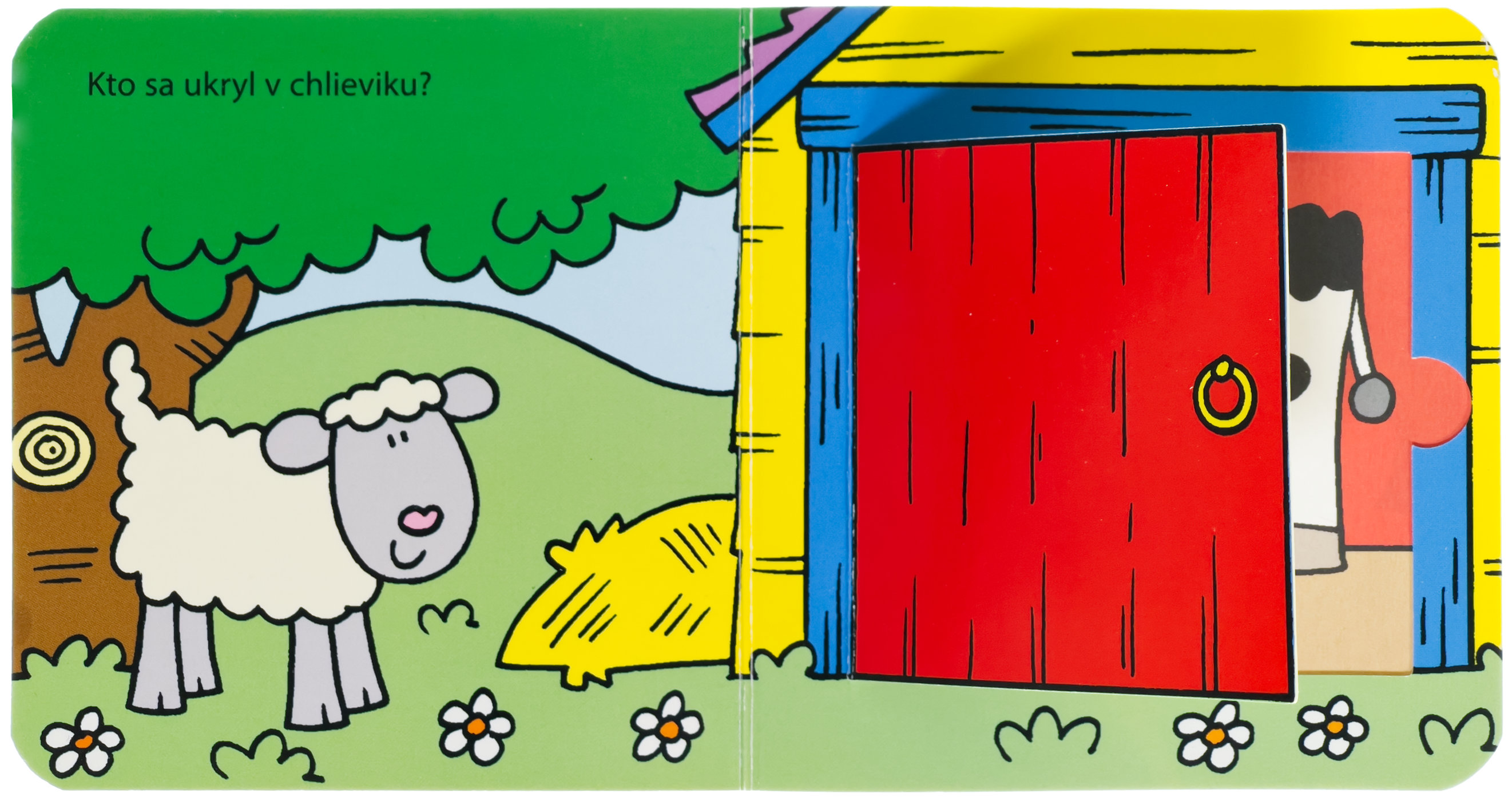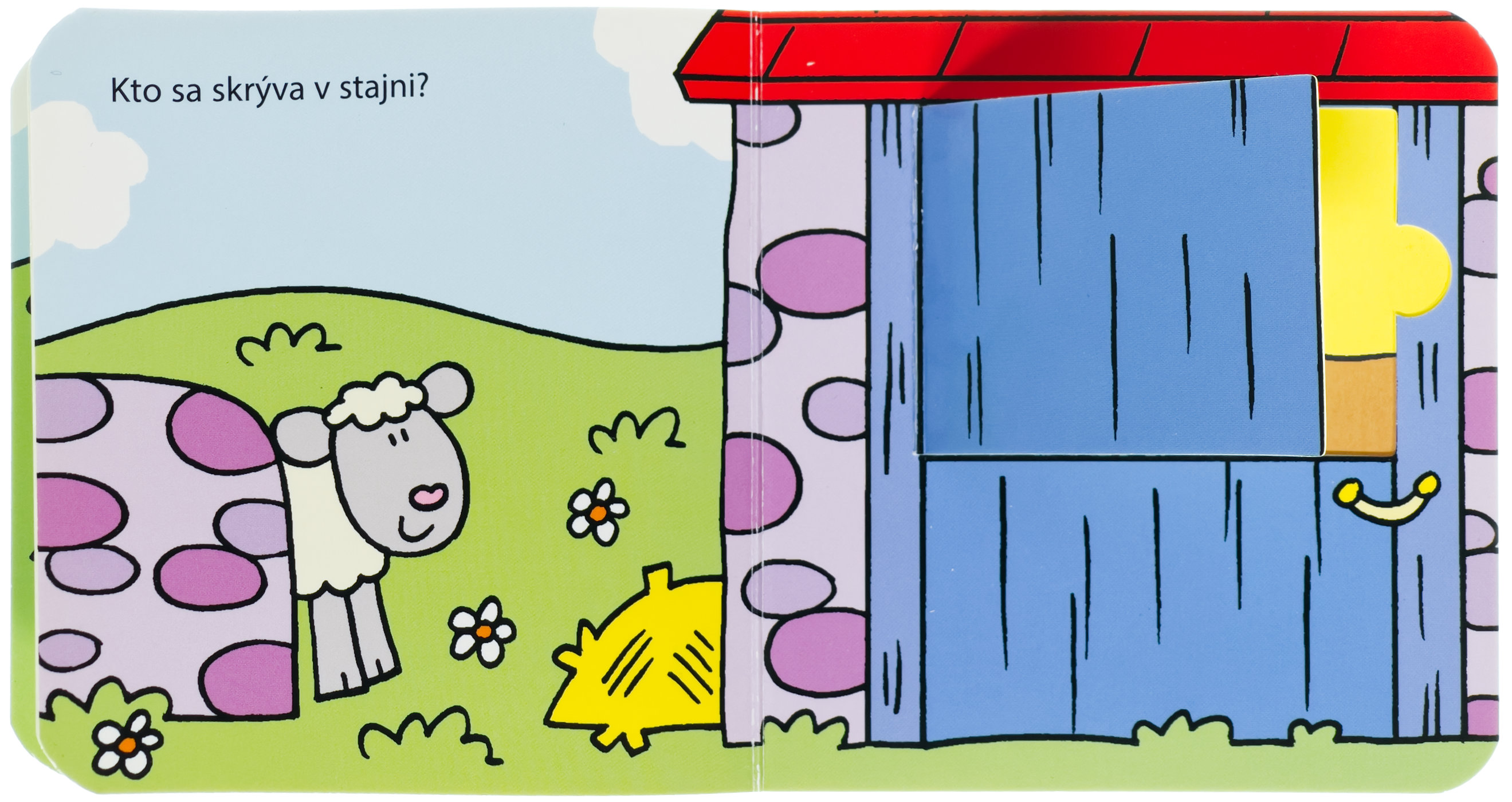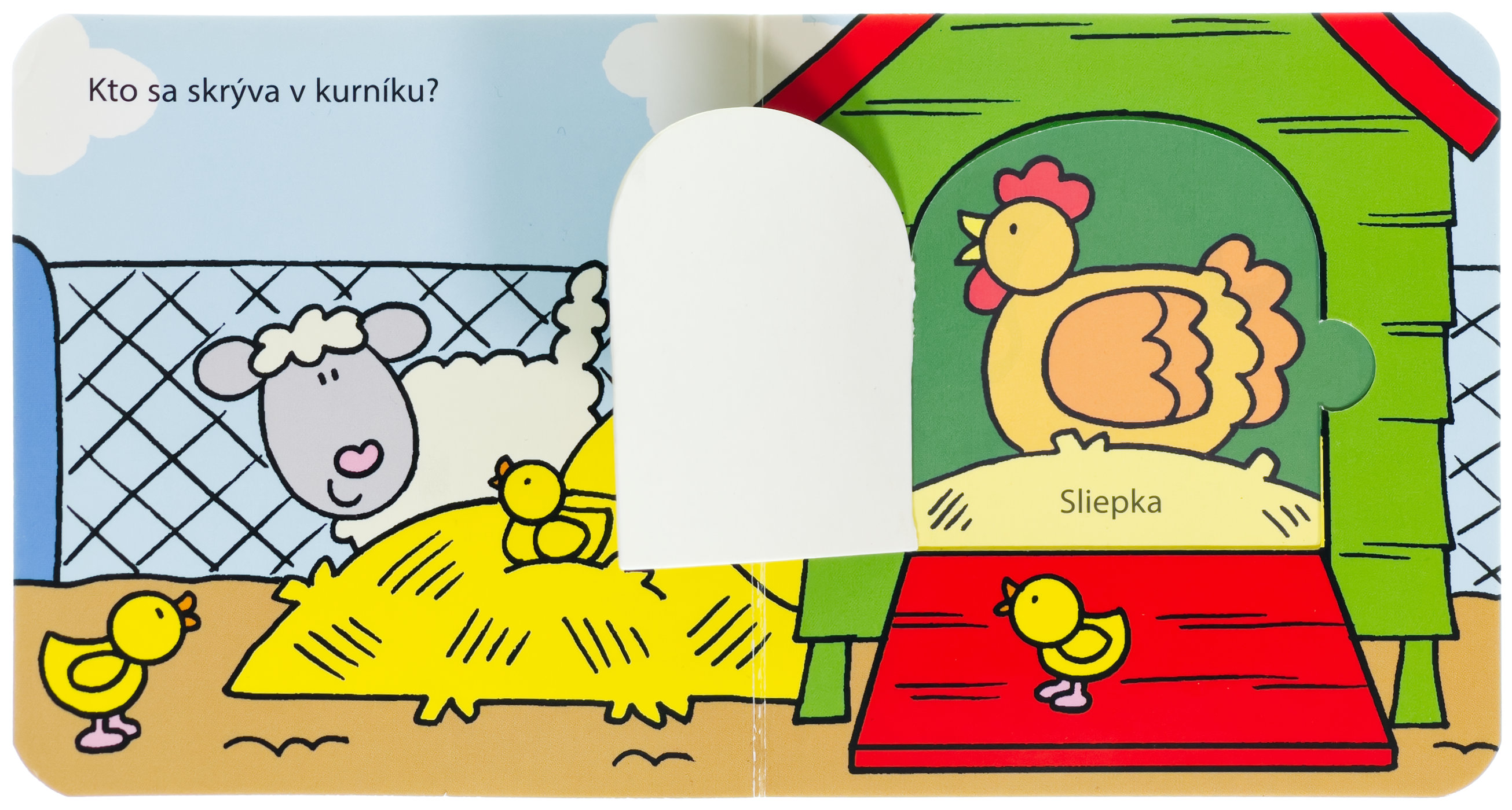 Pozri sa pod okienko a nájdi, kto sa tam schováva. Leporelo naučí deti zábavnou formou spoznávať zvieratká, ktoré môžu stretnúť na dvore – kravičku, sliepočku, kačicu, koňa, psíka, kozu, hus, prasiatko i ovečku.