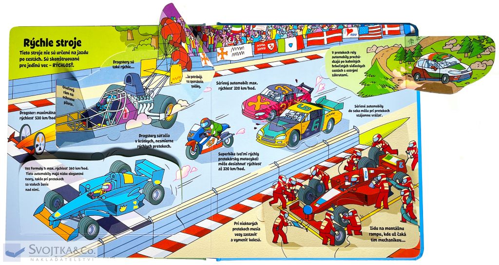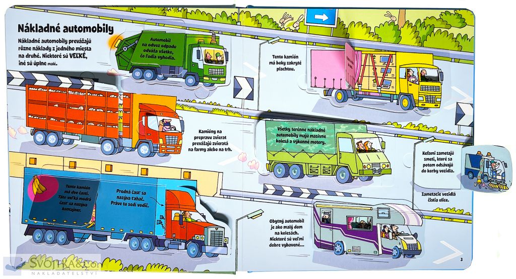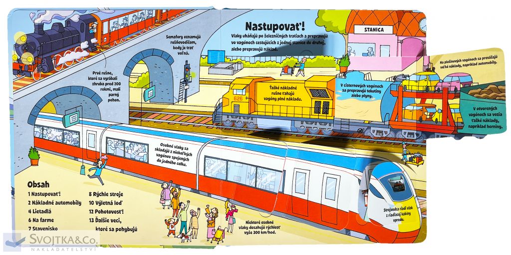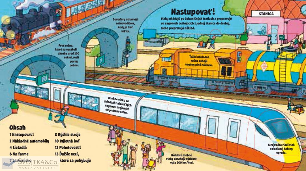 Zoznám sa s vlakmi uháňajúcimi po železničných tratiach, s nákladnými automobilmi prepravujúcimi rôzne náklady, s veľkými prúdovými dopravnými lietadlami prepravujúcimi cestujúcich po celom svete, s farmárskymi strojmi číhajúcimi na poliach, ale aj s pretekárskymi autami, obrovskými výletnými loďami, pohotovostnými vozidlami, ktoré sa ponáhľajú pomôcť ľuďom v núdzi, či so stavebnými strojmi, ktoré používajú stavbári na nerovnom teréne stavenísk. Tak rýchlo nastupovať, ideme!Počet strán: 14