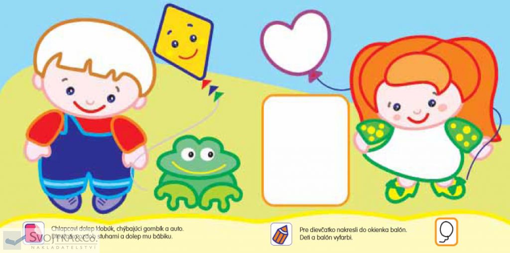 Pozri sa na pyramídu vľavo a zo samolepiek dotvor rovnakú vpravo. Dokresli medvedíkovi tvár. Nalep do rybníčka tie zvieratká, ktoré plávajú, a na breh tie, ktoré žijú na súši. Dokresli vlnky na vode a trávu na brehu. Spoj psíkov s búdami, v ktorých bývajú a dokresli im do misiek jedlo. Pomôž mačiatkam nájsť ich mamičky a dokresli im na hranie farebné klbká vlny. Dokresli dievčatku ďalšie nafukovacie balóniky. Tieto úlohy a ešte veľa ďalších nájdete v tejto knižke, ktorá je určená pre najmenšie deti od 2 do 3 rokov. Hravou formou si tu precvičia ruku pri domaľúvaní a zistia aj svoju šikovnosť a postreh pri plnení jednoduchých úloh a pri výbere a nalepovaní samolepiek.Počet strán: 12 str. + 4 samolep.