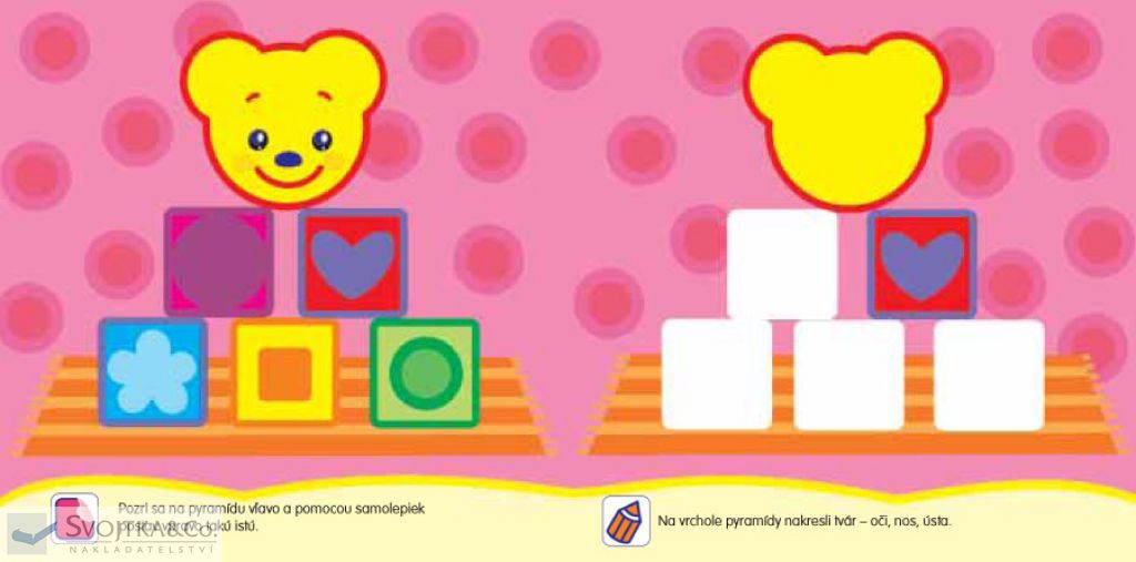Pozri sa na pyramídu vľavo a zo samolepiek dotvor rovnakú vpravo. Dokresli medvedíkovi tvár. Nalep d...zobraziť viac