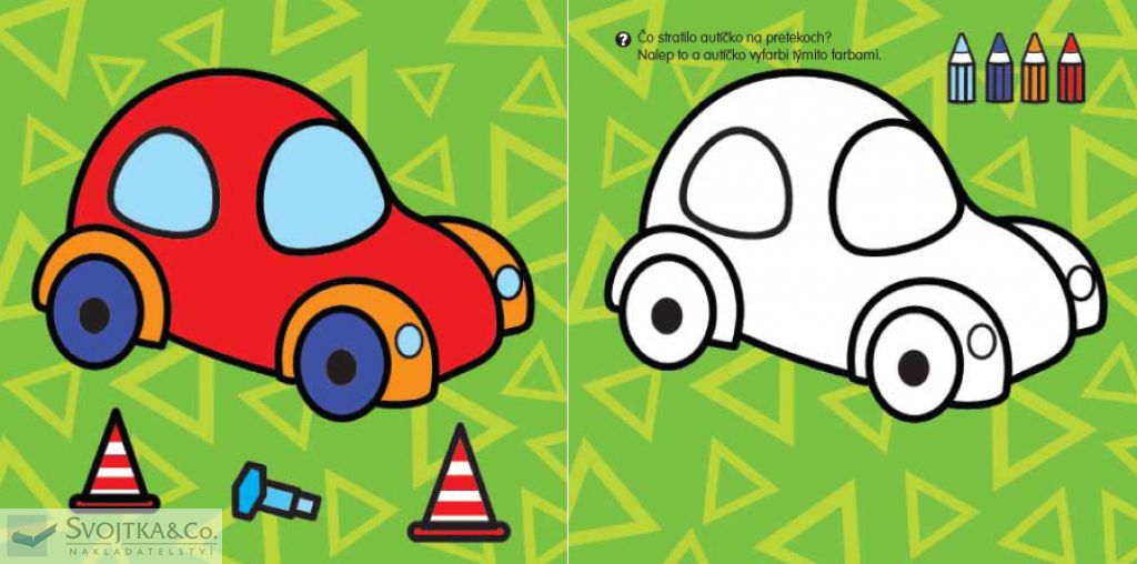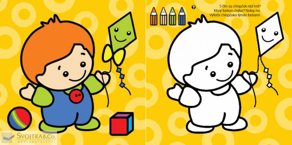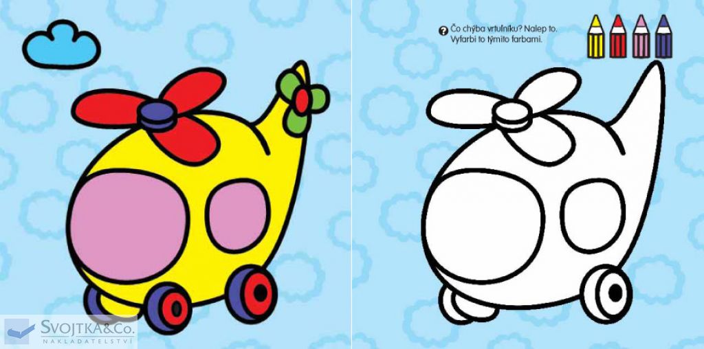S čím sa chlapček rád hrá? Pozri sa na predlohu, domaľuj obrázok a dotvor ho samolepkami. Čo sapočas pretekov stratilo z auta? Vyfarbi auto podľa predlohy a dolep samolepky stratených predmetov. Čo chýba na obrázku s vrtuľníkom? Vyfarbi vrtuľník podľa predlohy, nájdi a dotvor obrázok samolepkami, ktoré chýbajú. Prečo sú tieto vláčiky rôzne? A čo tej vpravo chýba? Nalep samolepky na správne miesta a vyfarbi vláčik podľa predlohy. Tieto úlohy a ešte veľa ďalších nájdete v tejto knižke, ktorá je určená pre najmenšie deti od 2 do 3 rokov. Hravou formou si tu precvičia ruku pri domaľúvaní a zistia aj svoju šikovnosť a postreh pri plnení jednoduchých úloh a pri výbere a nalepovaní samolepiek.Počet strán: 12 + 4 samolepiek