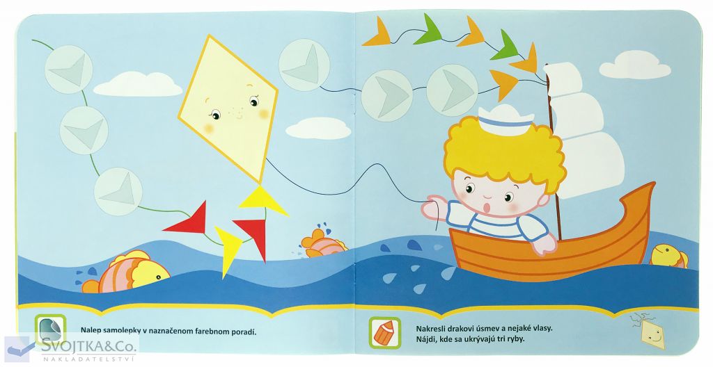 Spoj bodky v smere šípok a dokonči obrázky. Nájdi podobné vtáčiky a spoj ich čiarami. Nalep samolepky tak, aby sa cestujúci pozerali v smere letu. Nalep samolepky v naznačenom farebnom poradí. Sleduj čiary vedúce od ceruziek a zisti, akú farbu by malo mať auto a akú balónik. Tieto a mnohé ďalšie úlohy nájdete v tejto knižke, ktorá je určená pre chlapčekov od 2 do 3 rokov. Nielenže sa s touto knižkou zabavia, ale zistia aj svoju šikovnosť a postreh pri výbere a nalepovaní samolepiek.