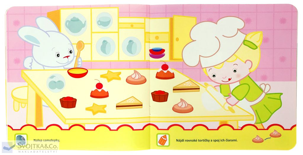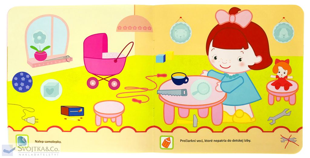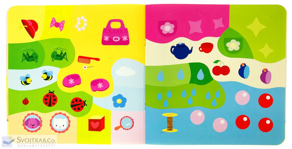 Nakreslenými čiarami spoj motýle a kvety s rovnakými faribami. Nalep samolepky s rovnakými farbami, ako majú šaty víl. Nájdi gombíky a zakrúžkuj ich. Spojením bodiek dokonči obrázky. Prečiarkni veci, ktoré nepatria do detskej izby. Dolep samolepky na správne miesta. Tieto a mnohé ďalšie úlohy nájdete v tejto knižke, ktorá je určená pre dievčatká od 2 do 3 rokov. Nielenže sa s touto knižkou zabavia, ale zistia aj svoju šikovnosť a postreh pri výbere a nalepovaní samolepiek.