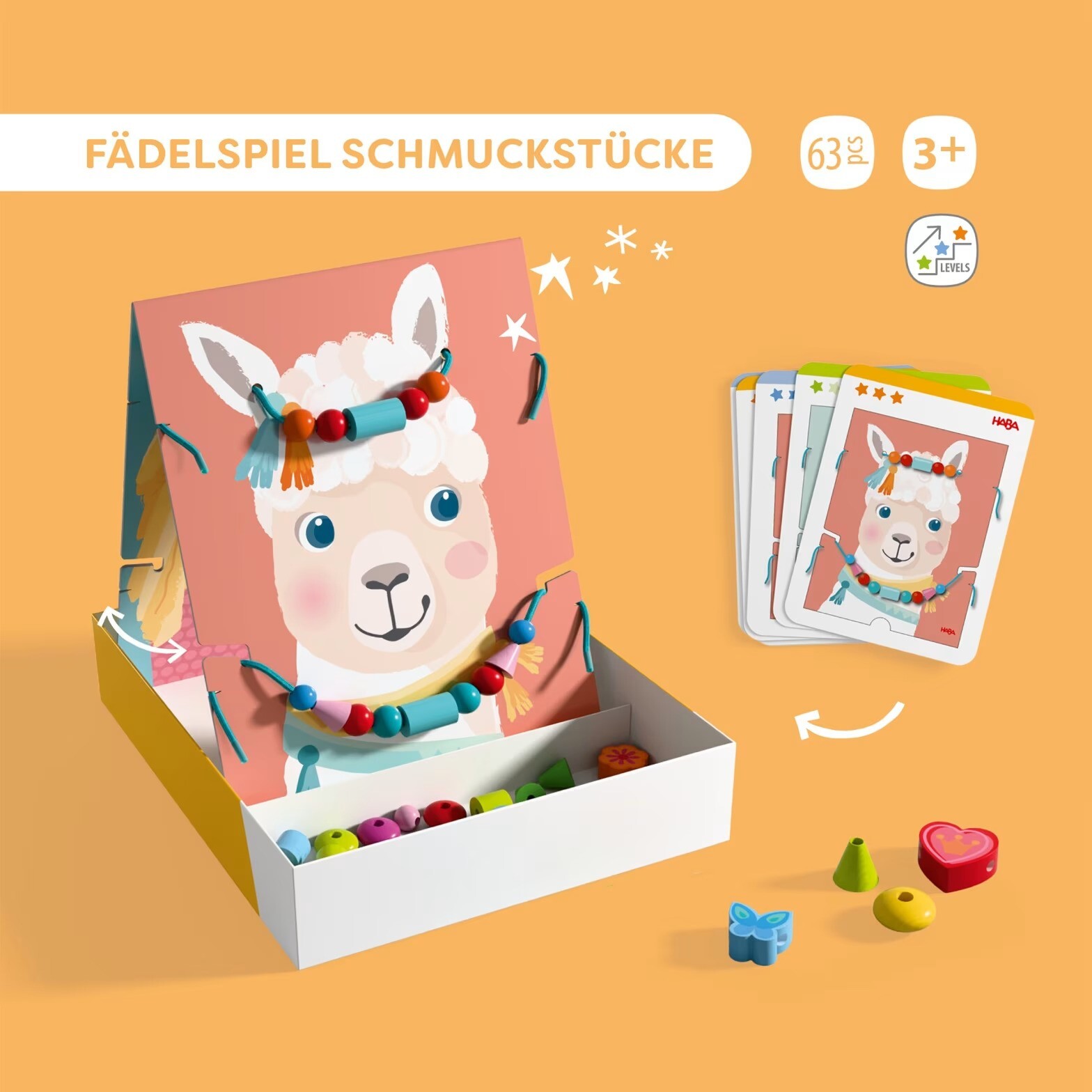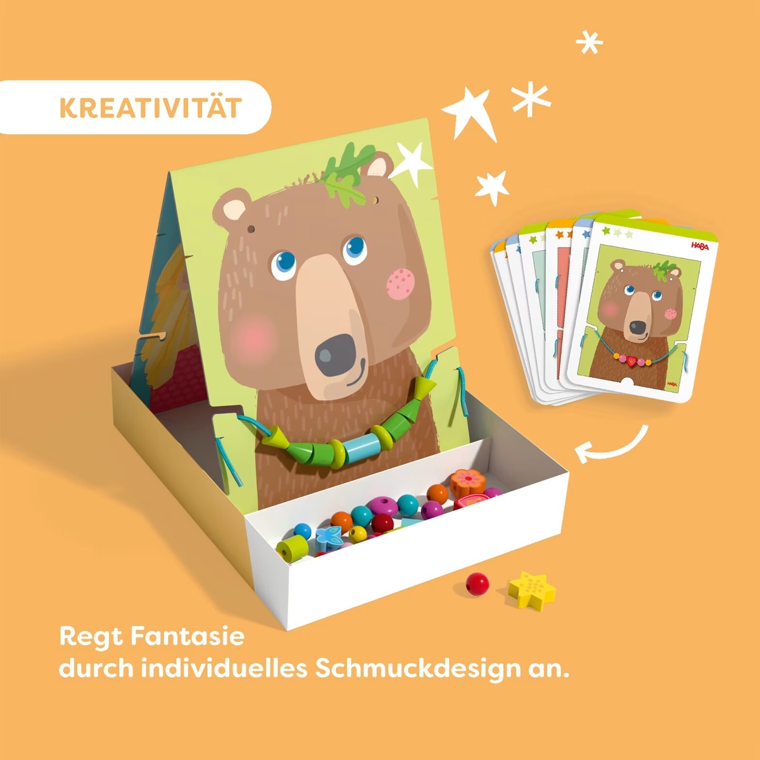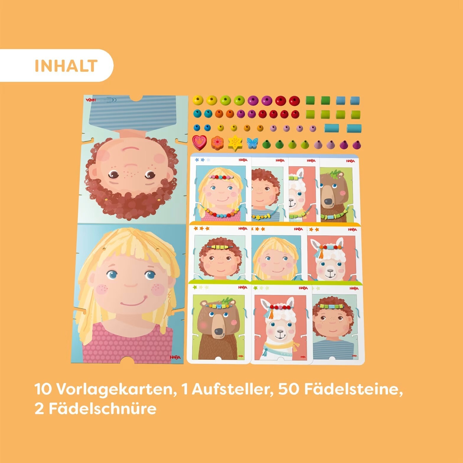 Navliekacia hra s motívmi medveďa, lamy a detí je kreatívna navliekacia hračka pre malých módnych návrhárskych nadšencov od 3 rokov. Deti si samy rozhodnú, ktorá postavička dostane nový náhrdelník alebo čelenku – a potom sa pustia do tvorby! Stačí otočiť stojan podľa zvoleného motívu, bezpečne ho umiestniť do obalu a začať navliekať. Korálky, hviezdičky a ďalšie tvary možno navliekať podľa predlohy alebo čisto podľa vlastnej fantázie. Hotový šperk sa jednoducho zavesí na stojan – a výtvor je na svete! Hra rozvíja jemnú motoriku a podporuje kreativitu. Vďaka 10 obojstranne potlačeným vzorovým kartám nechýba inšpirácia – každá karta ponúka hneď dva rôzne návrhy. Stojan je taktiež obojstranný a predstavuje až 4 rôzne tváre na ozdobenie. Obsah balenia: 50 navliekacích kameňov, 2 navliekacie šnúrky, 10 vzorových kariet, 1 stojan (obojstranný) Rozvíja: jemnú motoriku, kreativitu Vek: 3+