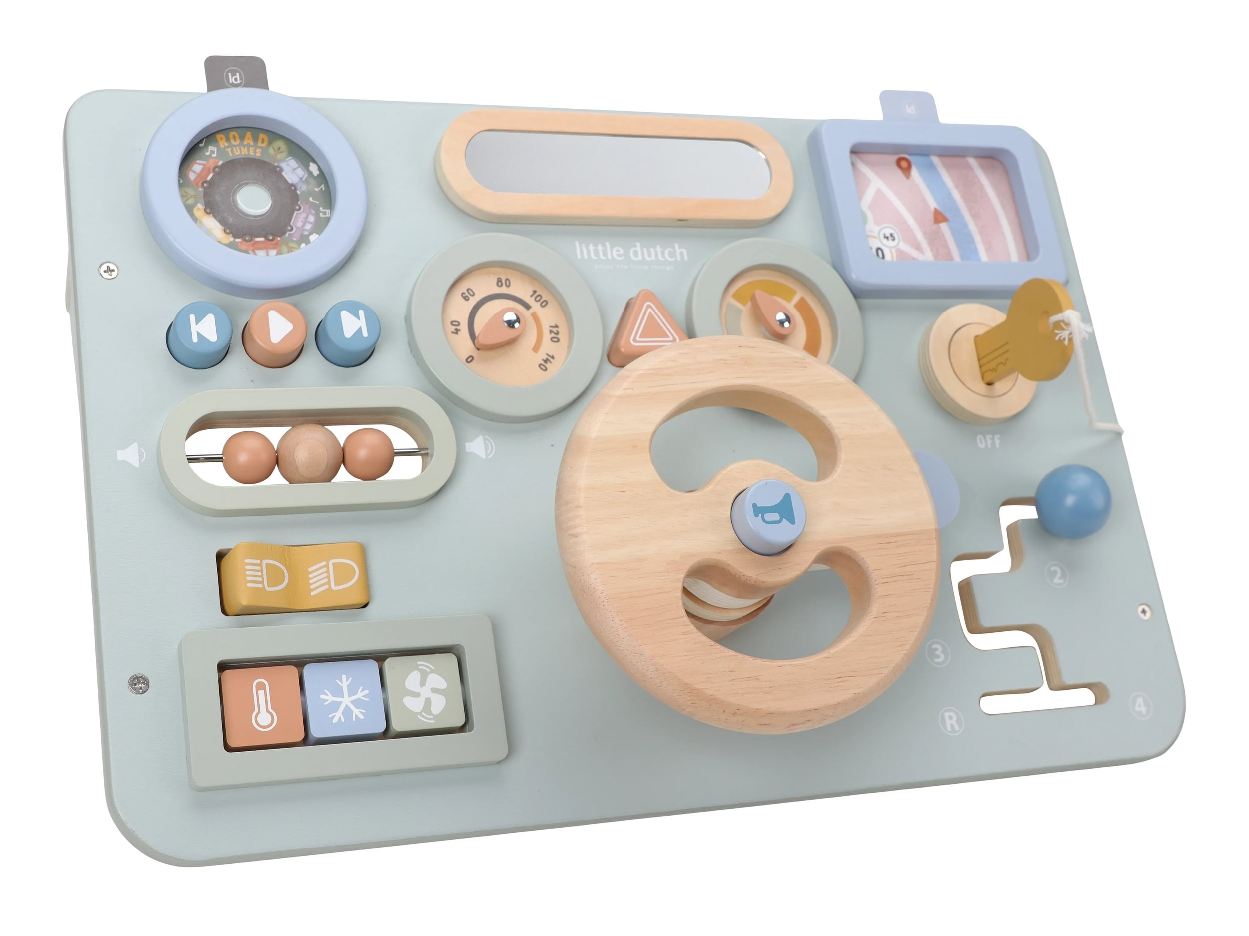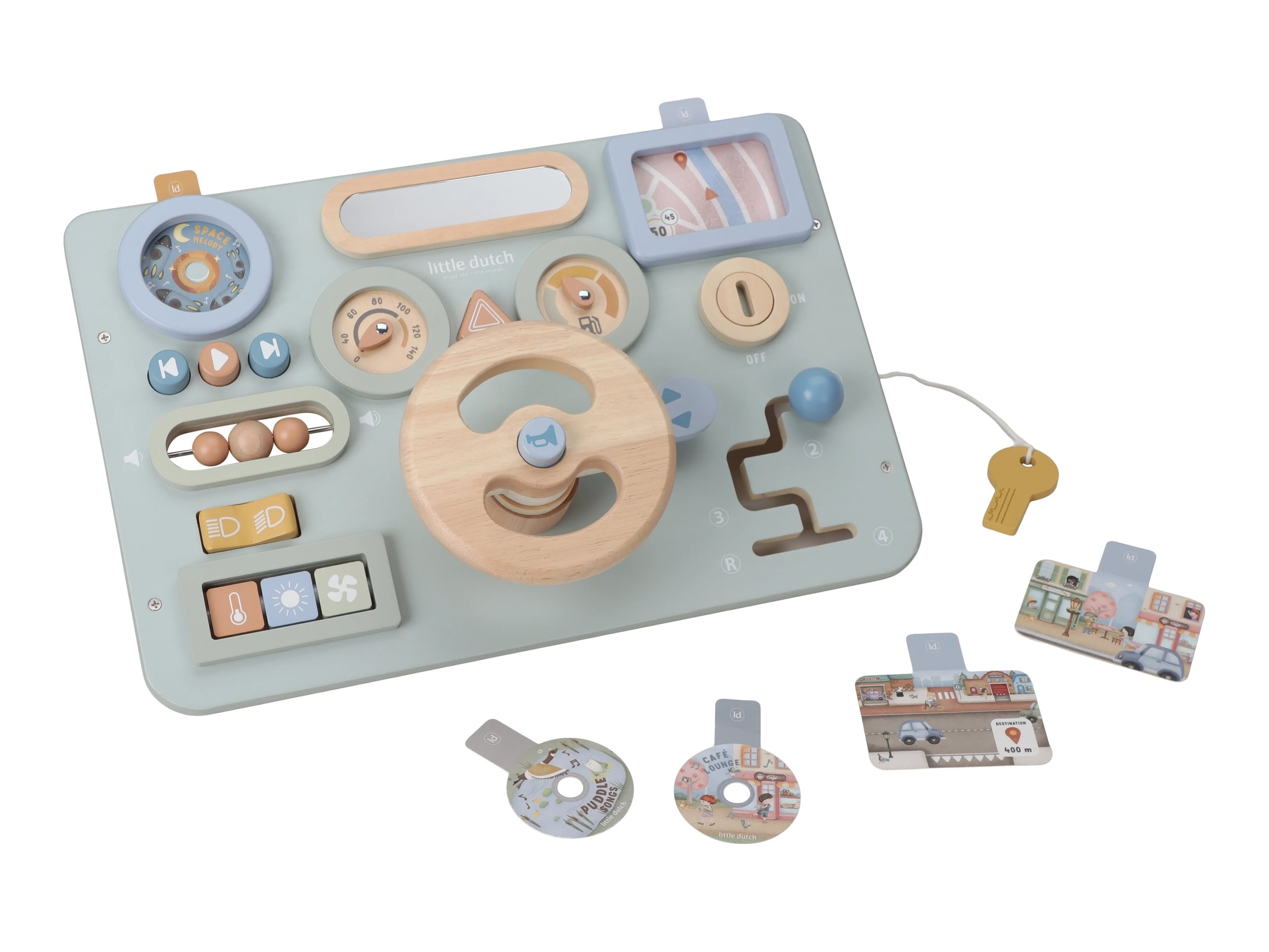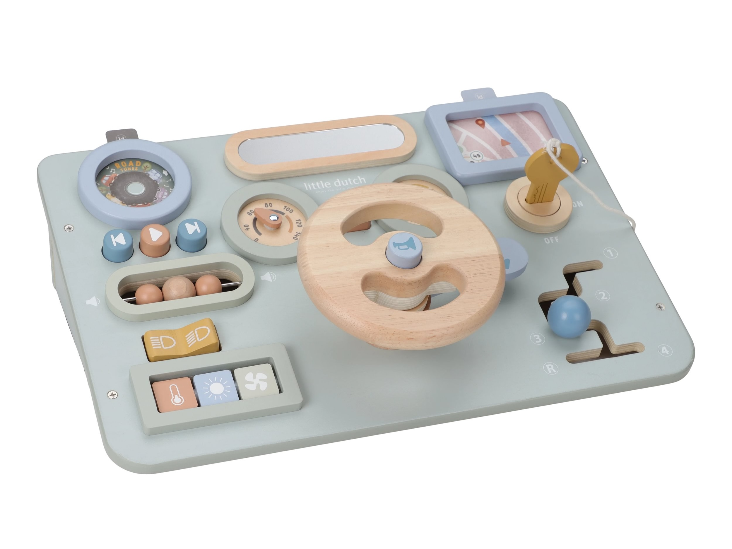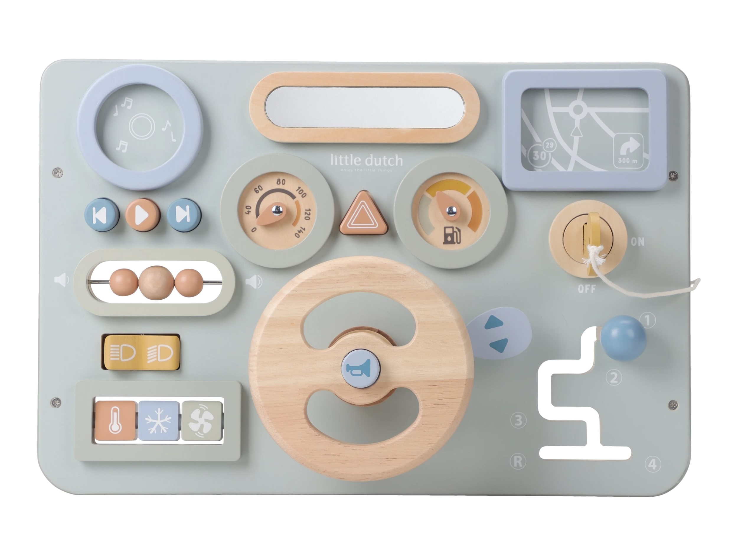 Drevený hrací pult s volantom láka deti na vlastnú dobrodružnú jazdu. Dieťa môže otáčať volantom, stláčať tlačidlá a objavovať veselé zvuky, ktoré podporujú aktívnu a nápaditú hru. Súčasťou sú aj kartičky, vďaka ktorým si dieťa môže „naplánovať trasu“ a vymýšľať vlastné príbehy. Pult je vyrobený z pevného dreva v jemných pastelových farbách, takže sa stane aj krásnym doplnkom detskej izby a dobre sa kombinuje s ďalšími drevenými hračkami.