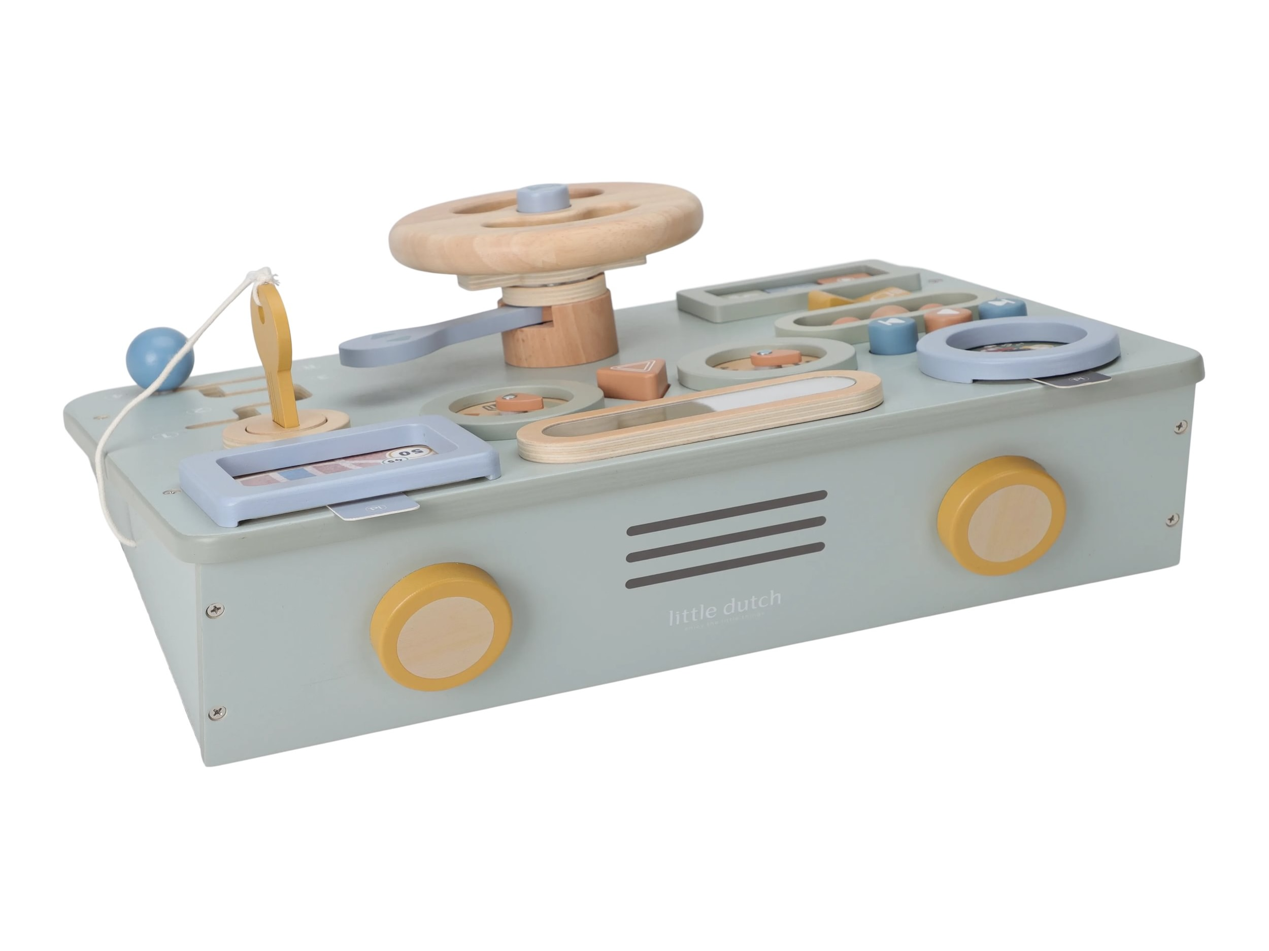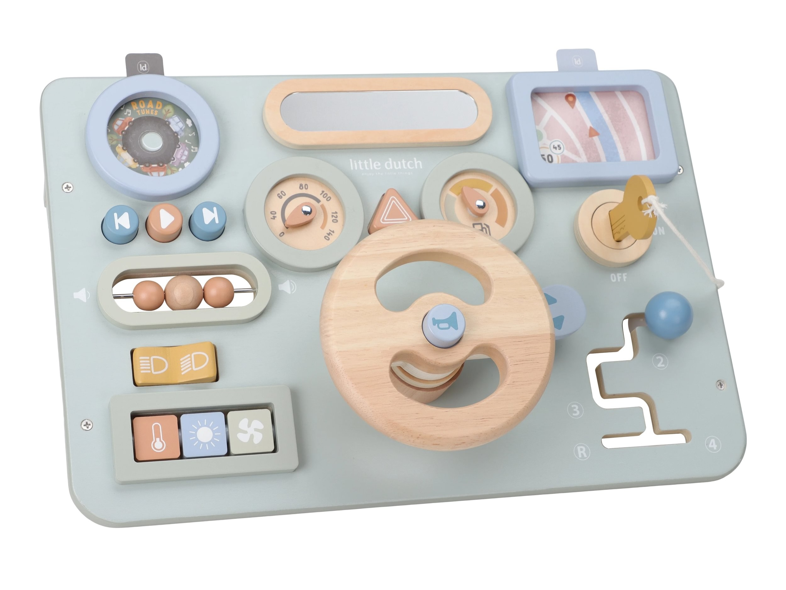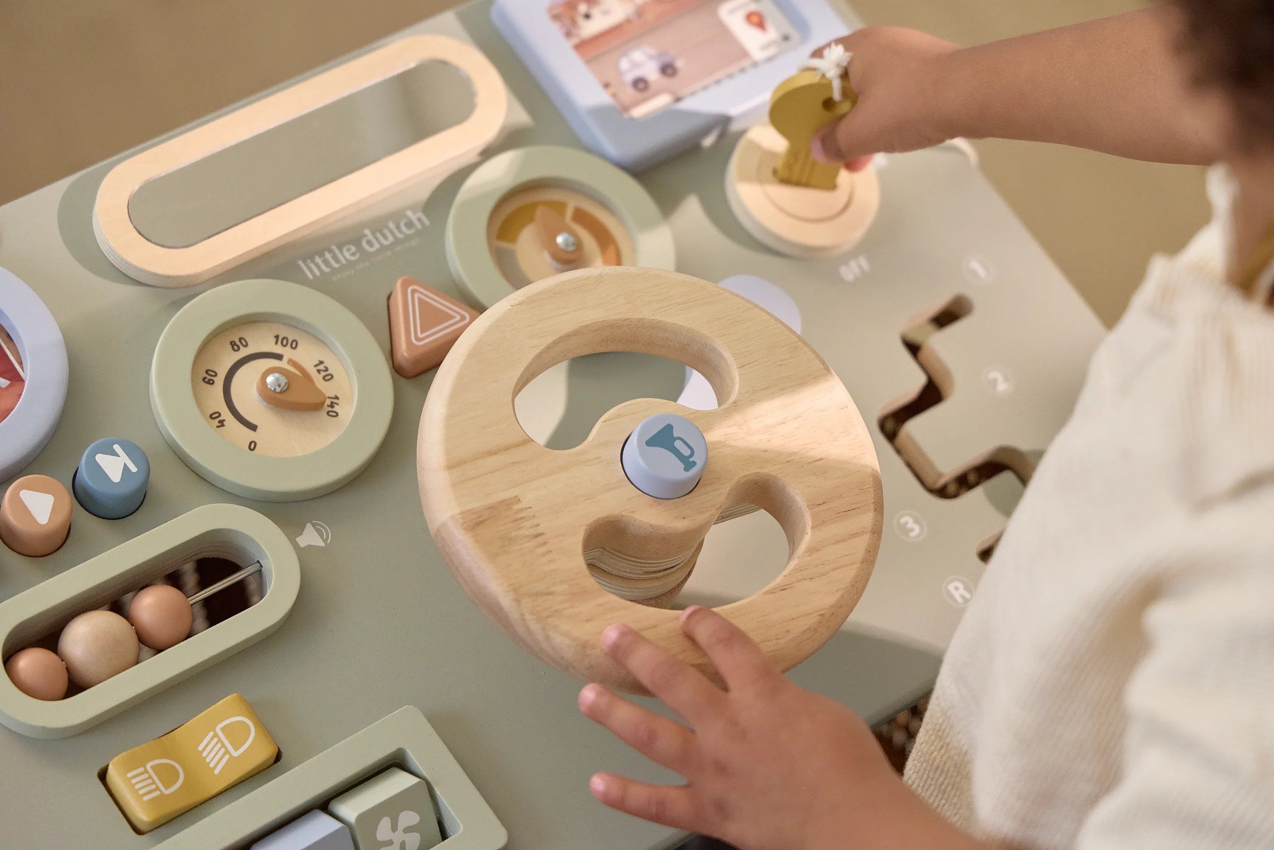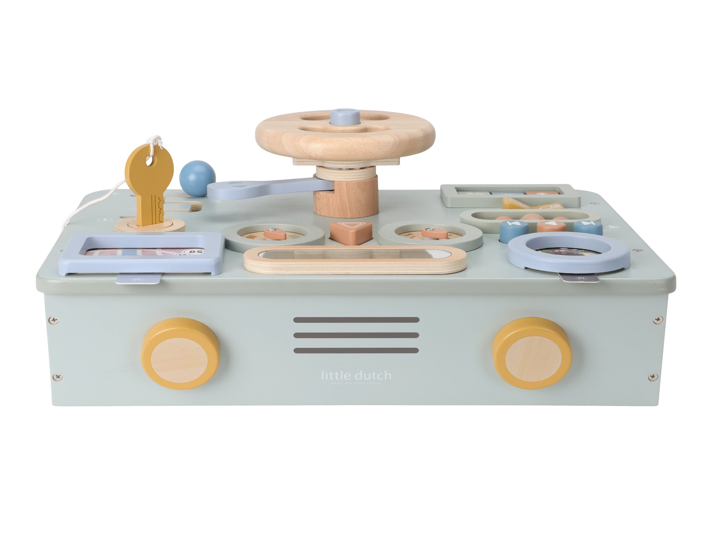 Drevený hrací pult s volantom láka deti na vlastnú dobrodružnú jazdu. Dieťa môže otáčať volantom, stláčať tlačidlá a objavovať veselé zvuky, ktoré podporujú aktívnu a nápaditú hru. Súčasťou sú aj kartičky, vďaka ktorým si dieťa môže „naplánovať trasu“ a vymýšľať vlastné príbehy. Pult je vyrobený z pevného dreva v jemných pastelových farbách, takže sa stane aj krásnym doplnkom detskej izby a dobre sa kombinuje s ďalšími drevenými hračkami.