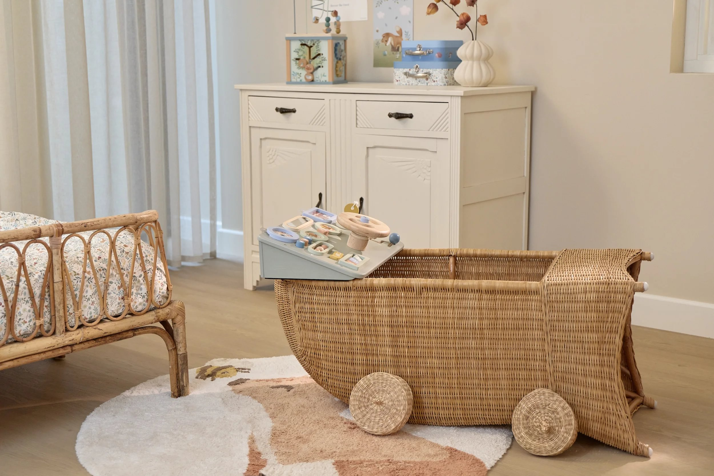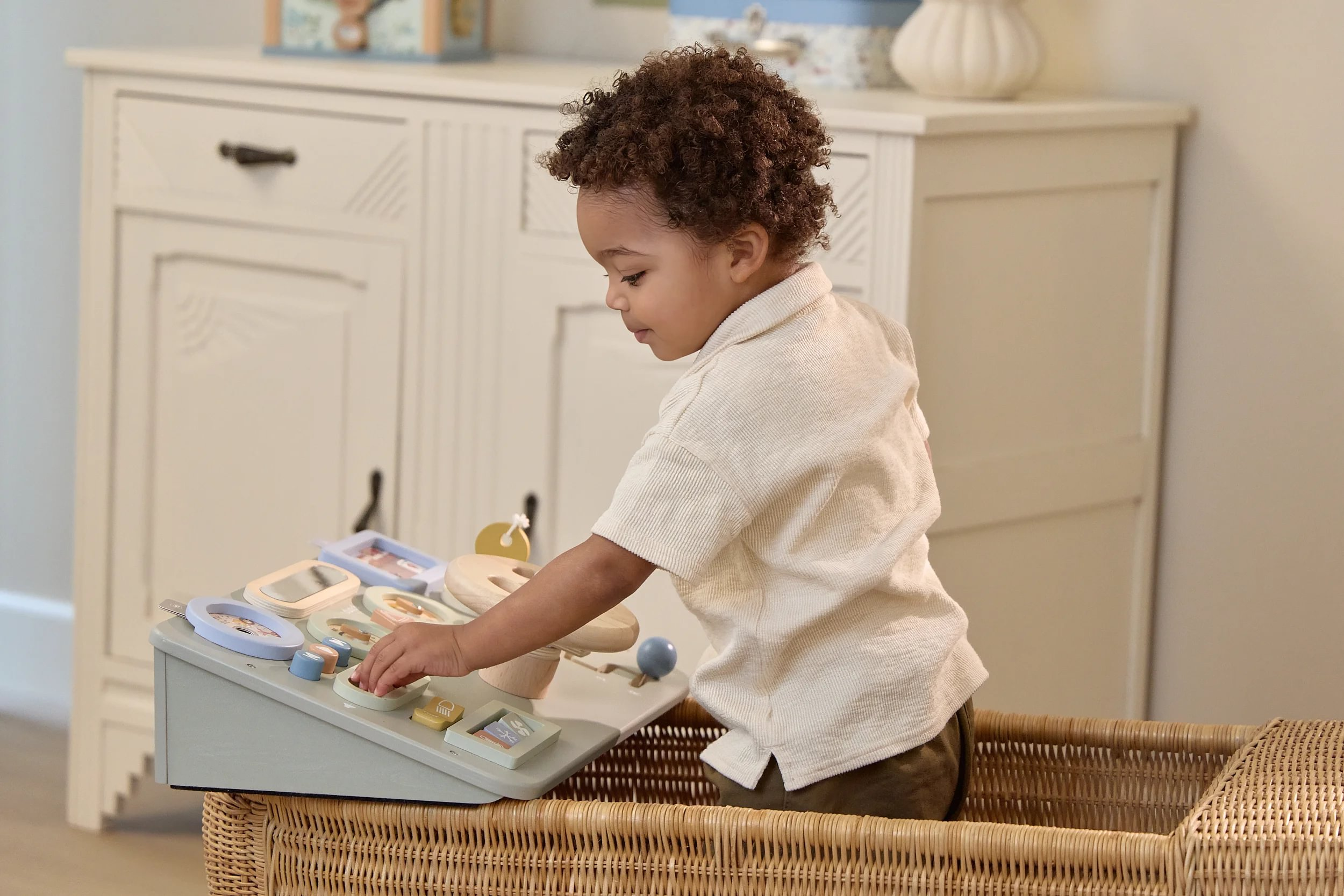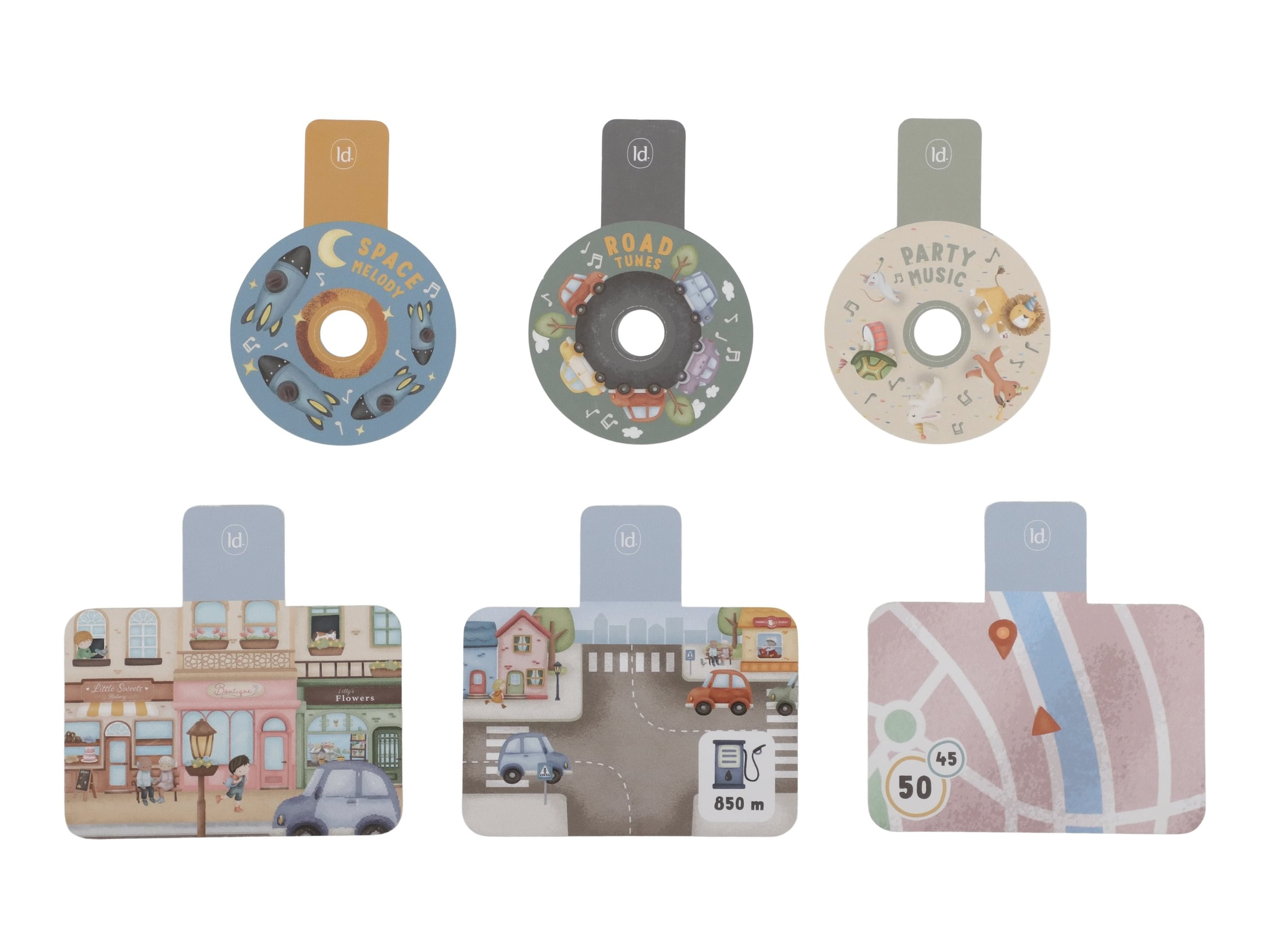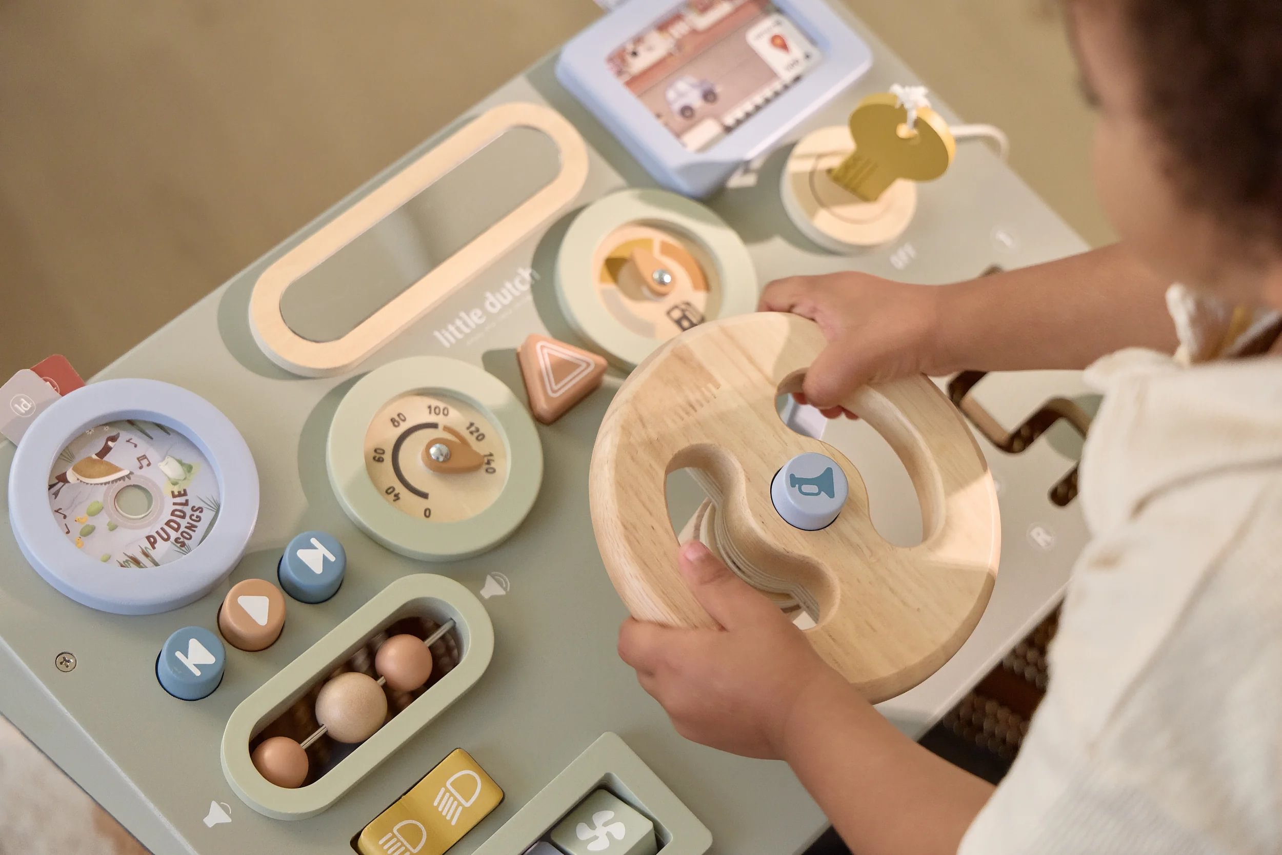 Drevený hrací pult s volantom láka deti na vlastnú dobrodružnú jazdu. Dieťa môže otáčať volantom, stláčať tlačidlá a objavovať veselé zvuky, ktoré podporujú aktívnu a nápaditú hru. Súčasťou sú aj kartičky, vďaka ktorým si dieťa môže „naplánovať trasu“ a vymýšľať vlastné príbehy. Pult je vyrobený z pevného dreva v jemných pastelových farbách, takže sa stane aj krásnym doplnkom detskej izby a dobre sa kombinuje s ďalšími drevenými hračkami.