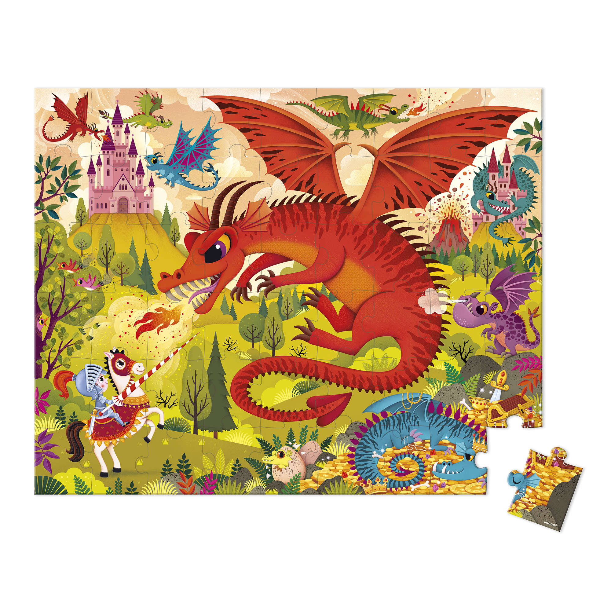 Draci vtrhli do kráľovstva! Toto 54-dielne kartónové puzzle stimuluje detskú predstavivosť a ponára ich do fantastického dobrodružstva plného záhad a legendárnych tvorov. Toto puzzle s rozmermi 50 x 40 cm sa dá ľahko vziať kamkoľvek vďaka atraktívnemu prenosnému puzdru. Je vyrobené vo Francúzsku z kartónu s certifikátom FSC™ a zdobené rastlinnými farbami. Vek: 5+