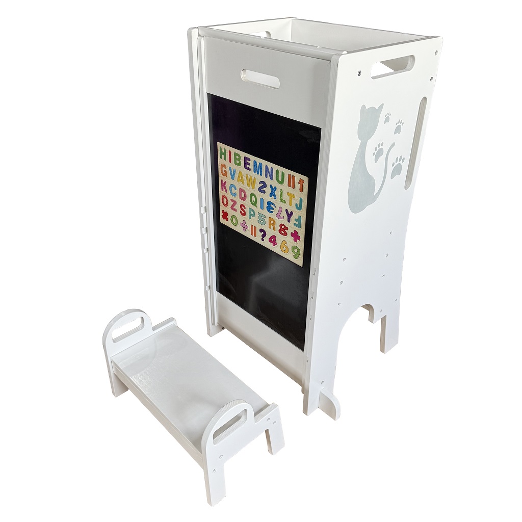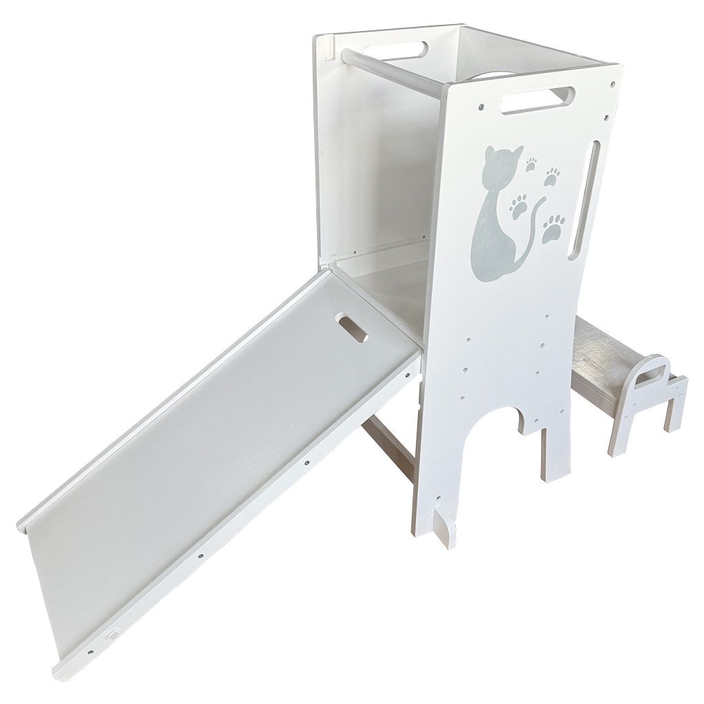 Učiace veže sú viacúčelové stoličky, ktoré dávajú deťom možnosť zapojiť sa do rôznych tvorivých činností pri kuchynskej linke či pracovnom stole. Umožňuje najmenším byť v úrovni pracovnej dosky, vidieť všetko, čo robíte a tvoriť tak priamo s Vami – vďaka tomu máte aj neustály dozor. Veža sa skladá zo stojacej plochy, na ktorej dieťa stojí, schodíka, po ktorom sa na ňu dostane az ohrádky okolo. Vďaka svojej multifunkčnosti sa dá s vežou aj „hrať“. Obsahuje magnetickú tabuľku s písmenami a číslicami av rozloženom stave je doplnená o šmýkačku. Pri používaní nenechávajte učiacu vežu v priestore, ale vždy vežu umiestnite stranou oproti schodíku k pevnej prekážke (kuchynská linka a pod.). Upozornenie:Predajom učiacej veže nepreberáme zodpovednosť za bezpečnosť dieťaťa. Dieťa na učiacej veži musí byť pod stálym dozorom dospelej osoby! Hlavné vlastnosti: viacúčelový, funkčný nábytokzdokonaľuje motorické schopnostiodolná konštrukciaobsahuje šmýkačku a magnetickú tabuľumoderný dizajn s mačičkou