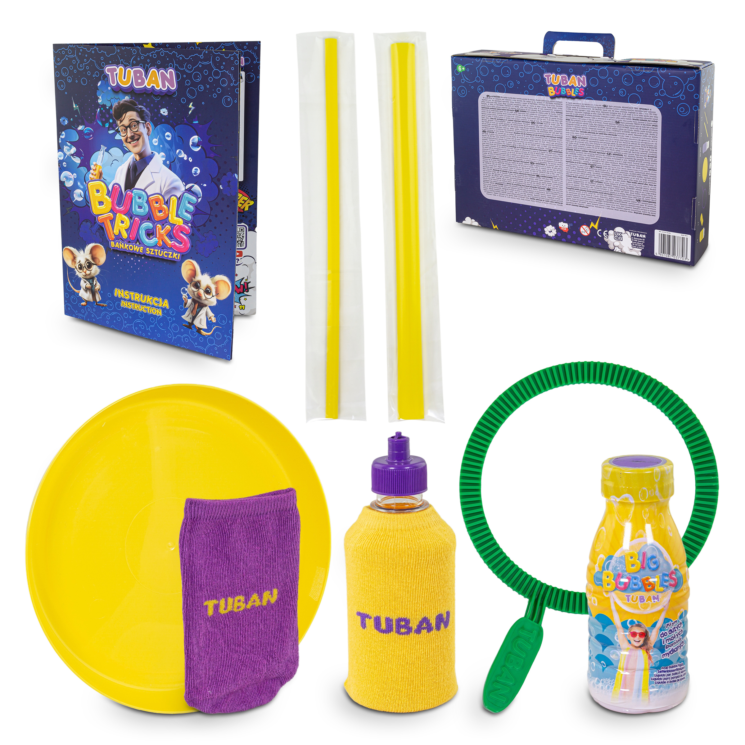 Sada 10 bublinových trikov Kreatívna sada na veľké bubliny a zábavné mydlové triky pre deti Sada 10 bublinových trikov od značky TUBAN prináša deťom aj rodičom originálnu zábavu s mydlovými bublinami, pri ktorej nejde len o obyčajné fúkanie bublín. Táto kreatívna sada umožňuje vytvárať bublinovú disco guľu, hranatú bublinu, bublinu v bubline alebo bublinovú húsenicu, takže hra sa mení na skutočné objavovanie rôznych tvarov a efektov. Je to skvelá voľba pre deti, ktoré rady experimentujú, skúšajú nové aktivity a užívajú si pohybové hry vonku aj doma. 10 bublinových trikov v jednej sade – pestrá hra s rôznymi efektmi 250 ml Big Bubbles roztoku – pripravené na okamžité použitie viac pomôcok na tvorenie – tanierik, 2 trubičky, krúžok, bavlnené nadstavce a ďalšie príslušenstvo podrobný návod – deti môžu skúšať jednotlivé triky krok za krokom rozvoj trpezlivosti a sústredenia – hravou formou podporuje zručnosť aj kreativitu V balení nájdete Big Bubbles liquid 250 ml, tanierik, 2 trubičky, bavlnený nadstavec, fľaštičku s bavlneným nadstavcom, krúžok a detailný návod na 10 rôznych bublinových trikov. Vďaka tomu si deti môžu jednotlivé techniky postupne skúšať a objavovať, ako vznikajú rôzne veľkosti, tvary a vrstvy bublín. Táto hra podporuje jemnú motoriku, koordináciu pohybov, sústredenie aj tvorivé myslenie a zároveň prináša dlhé hodiny fascinujúcej zábavy. Veľkou výhodou sady je, že nejde len o zábavu, ale aj o aktivitu, pri ktorej sa deti učia trpezlivosti, presnosti a experimentovaniu. Bublinové triky sú atraktívne na záhradu, na terasu, na oslavy aj ako kreatívny darček. Výrobca uvádza, že produkty TUBAN sú bez škodlivých látok, sada je vyrobená v Poľsku, odporúčaný vek je od 6 rokov a roztok je najlepšie spotrebovať do 1 mesiaca od otvorenia. Rozmer balenia je 35,5 × 28,5 × 8 cm. Upozornenie: Nevhodné pre deti do 36 mesiacov.